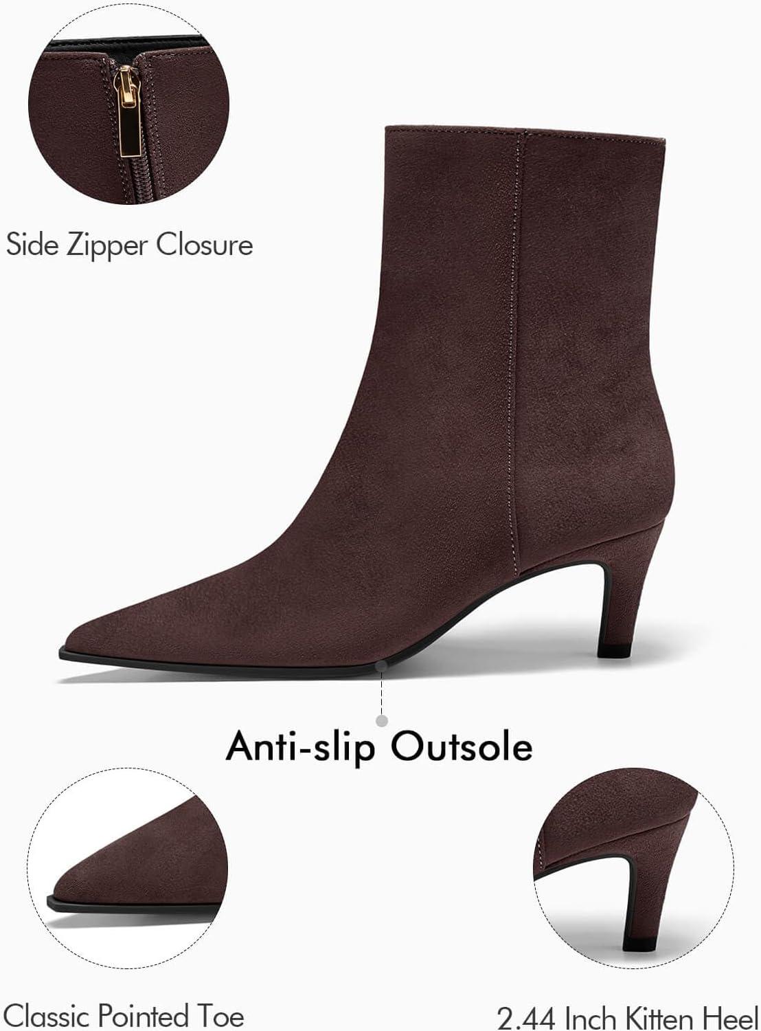 Coutgo Ankle Boots for Women Kitten Low Heel Pointed Toe Booties Side Zipper Fall Shoes(Chocolate Suede)