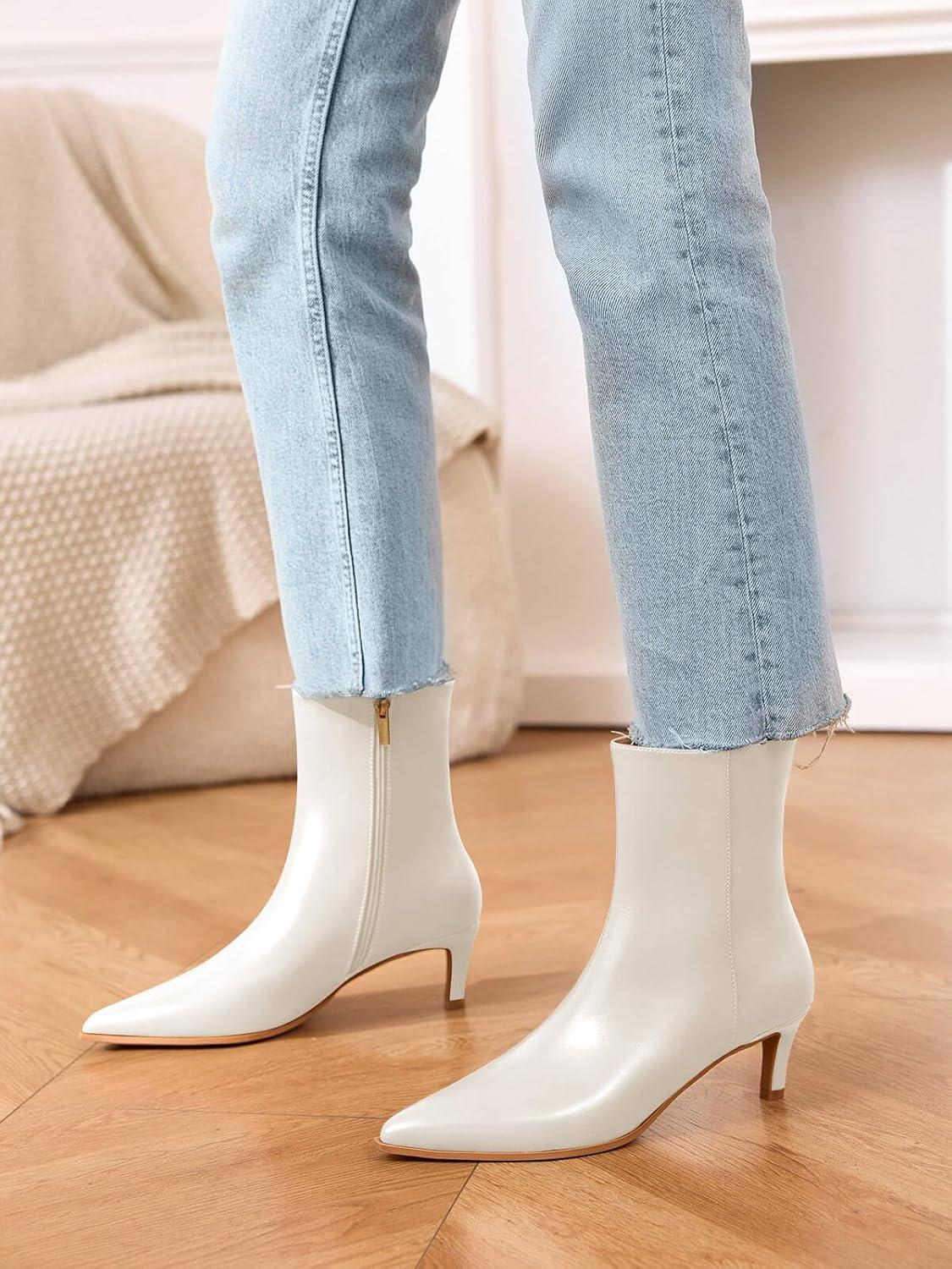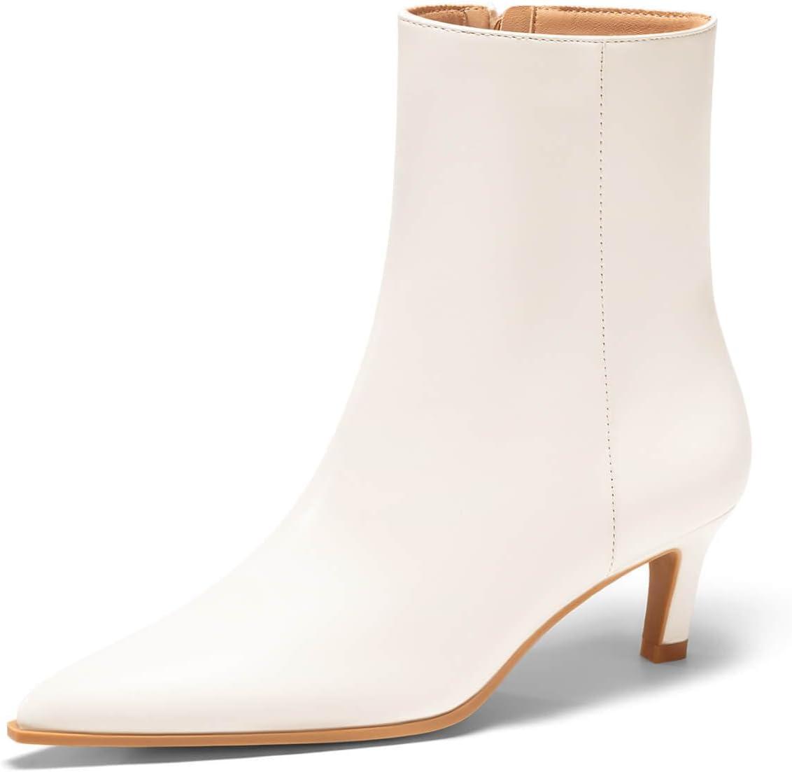 Coutgo Ankle Boots for Women Kitten Low Heel Pointed Toe Booties Side Zipper Fall Shoes(Cream White Pu)