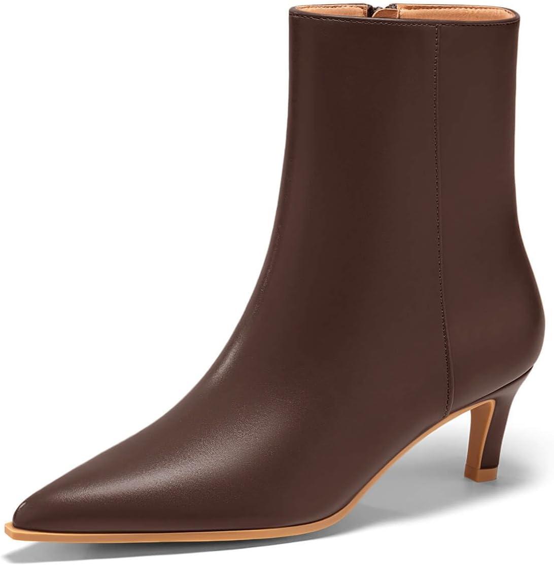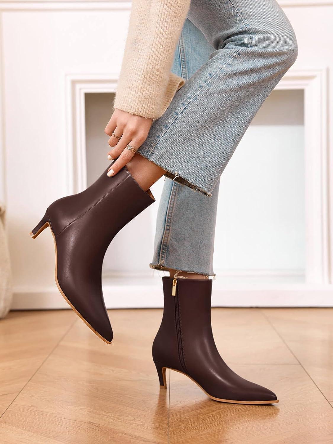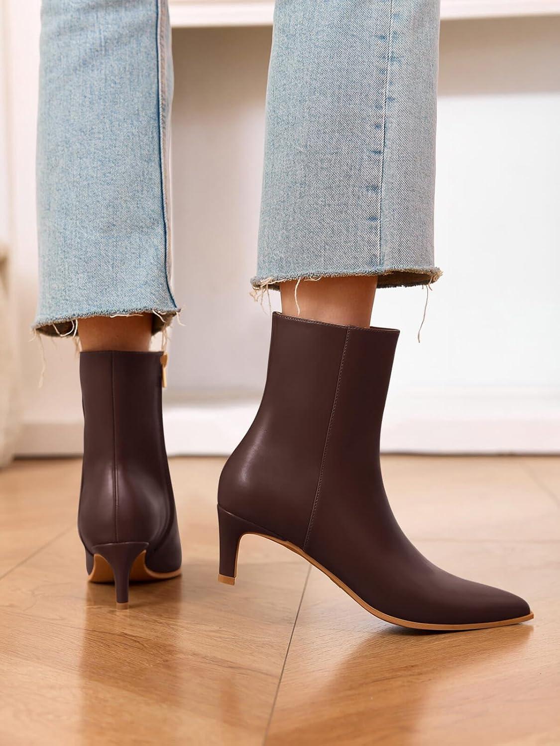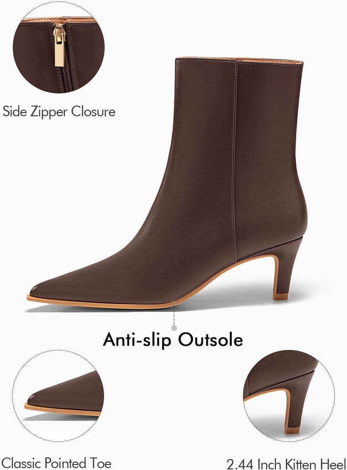 Get your hands on our newest Coutgo Ankle Boots for Women Kitten Low Heel Pointed Toe Booties Side Zipper Fall Shoes(Dark Brown Pu) and enjoy a limited-time discount offer.