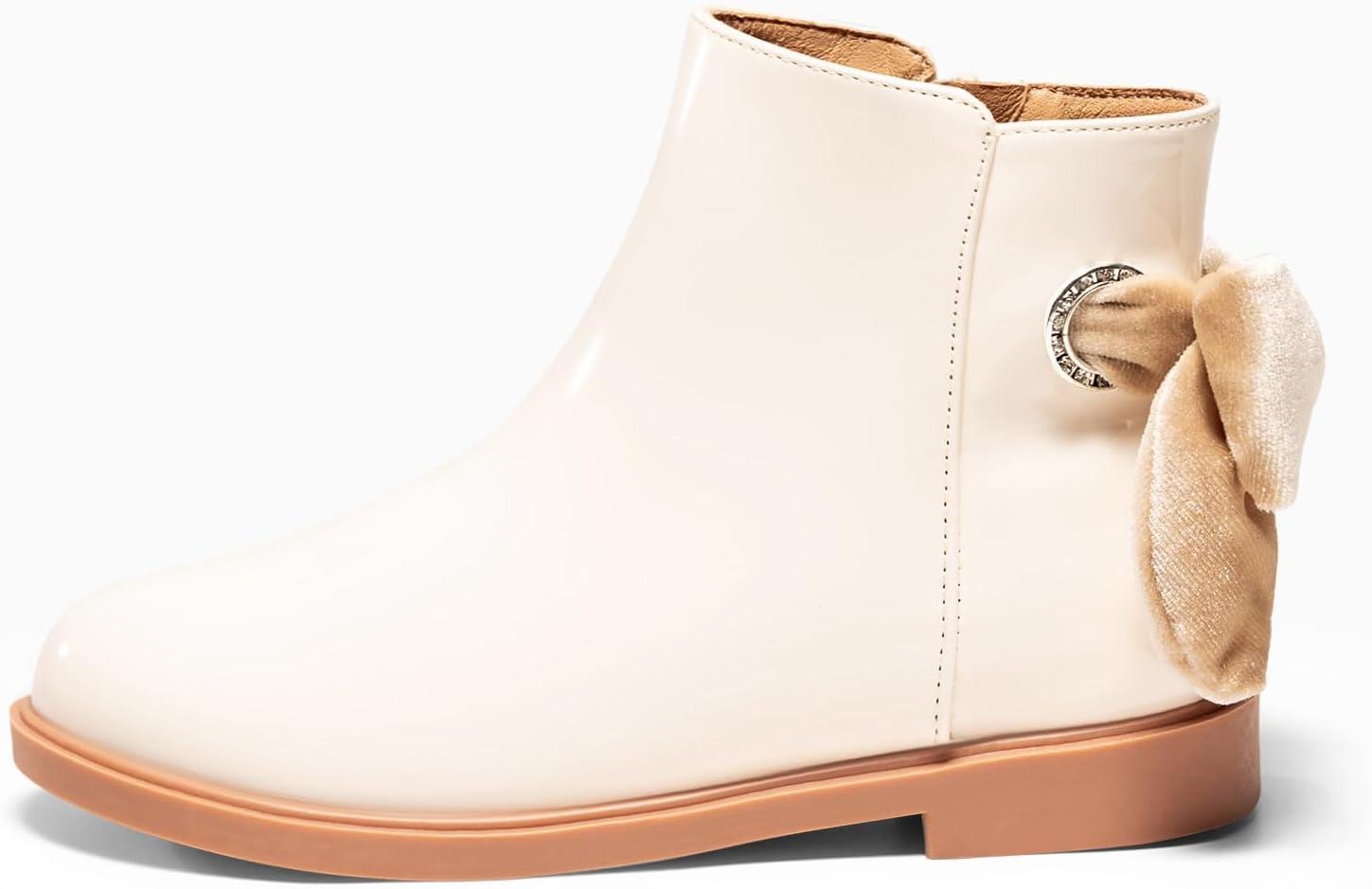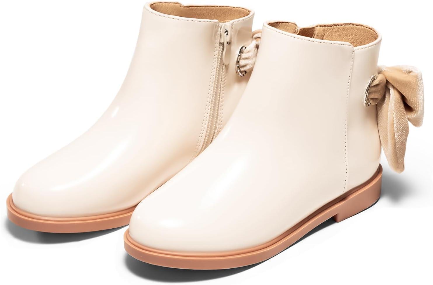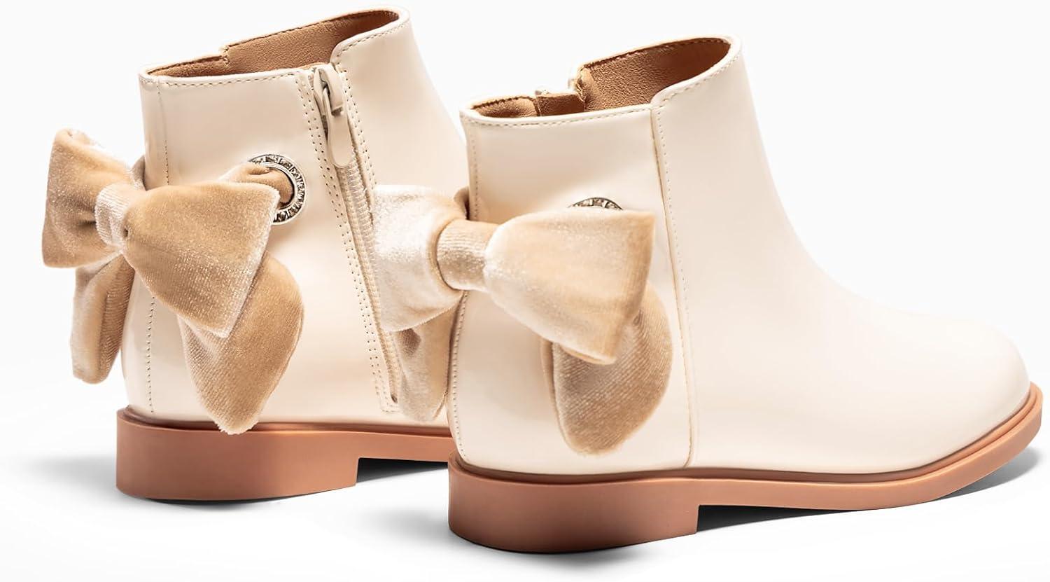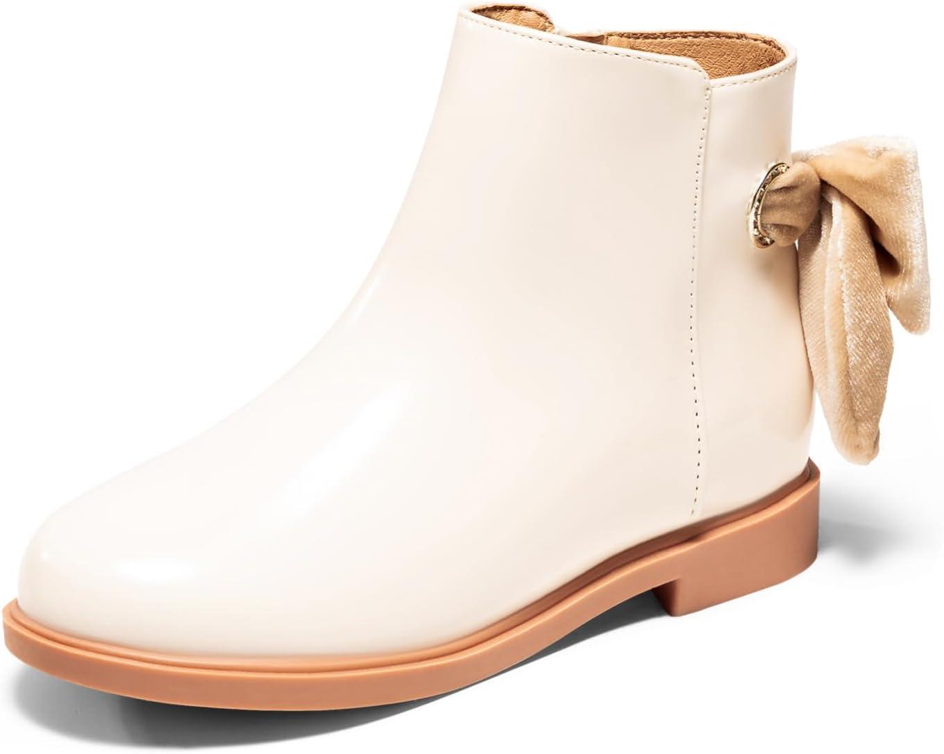 Coutgo Girls Ankle Boots Kids Bow Chunky Low Heel Side Zipper Dress Booties Fashion Fall Shoes(Off-white)