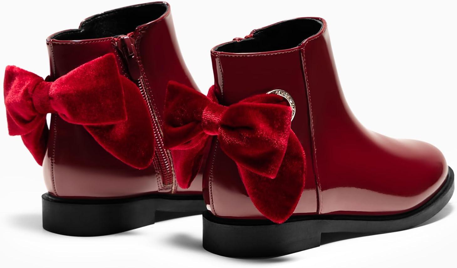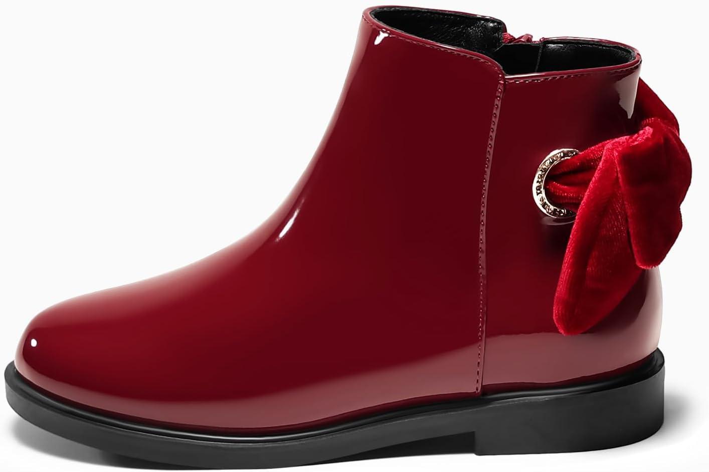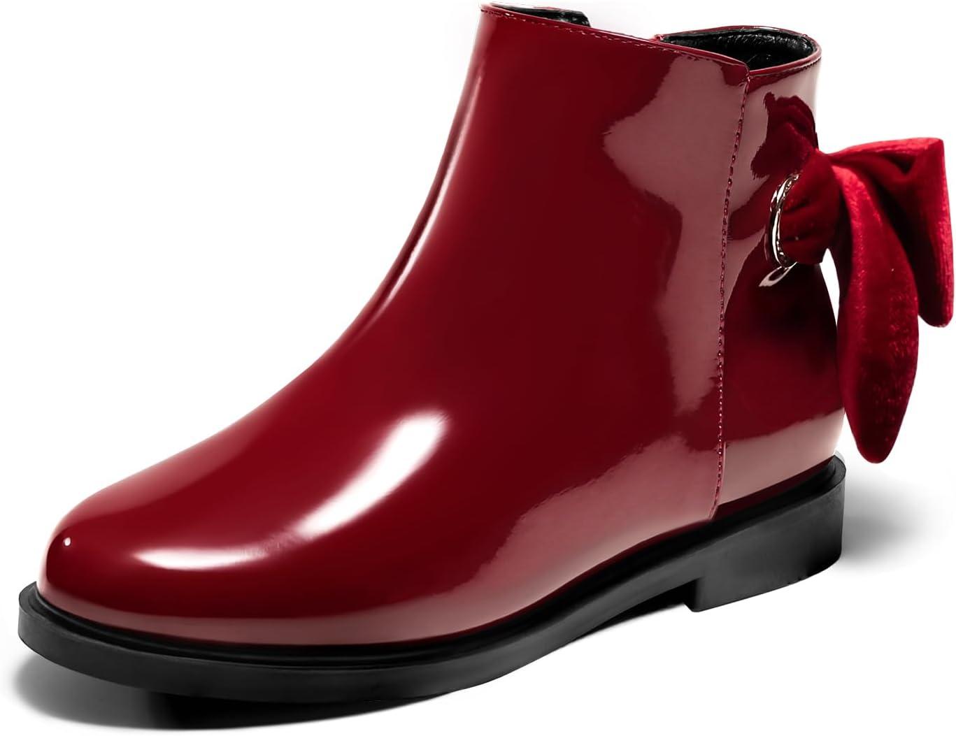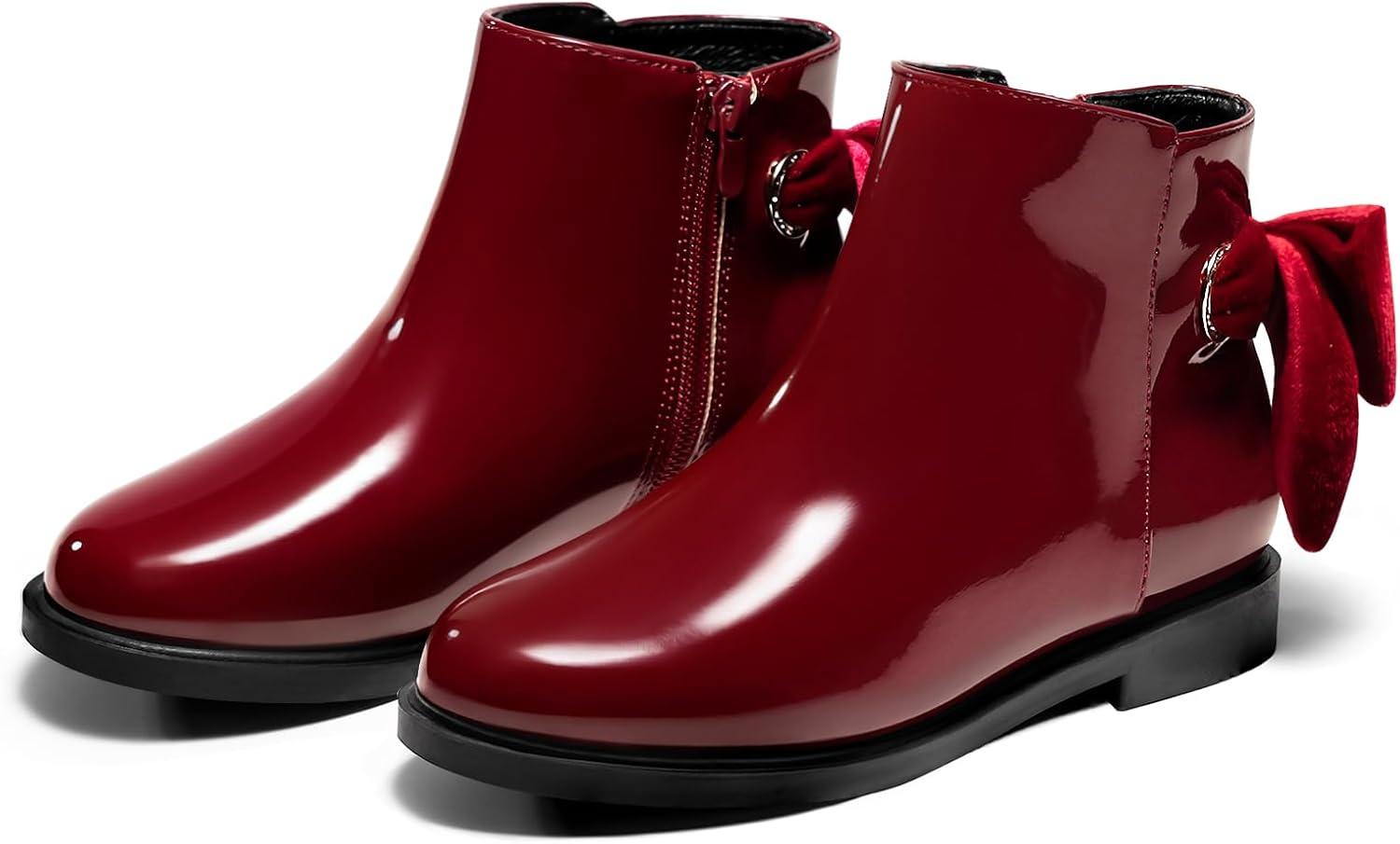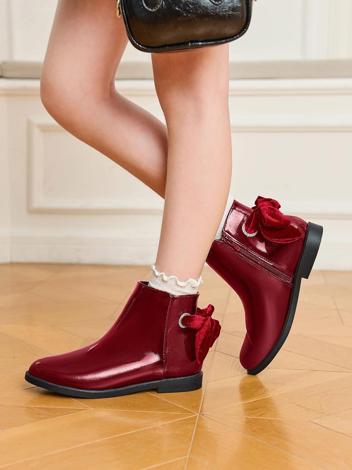 Coutgo Girls Ankle Boots Kids Bow Chunky Low Heel Side Zipper Dress Booties Fashion Fall Shoes(Wine Red)