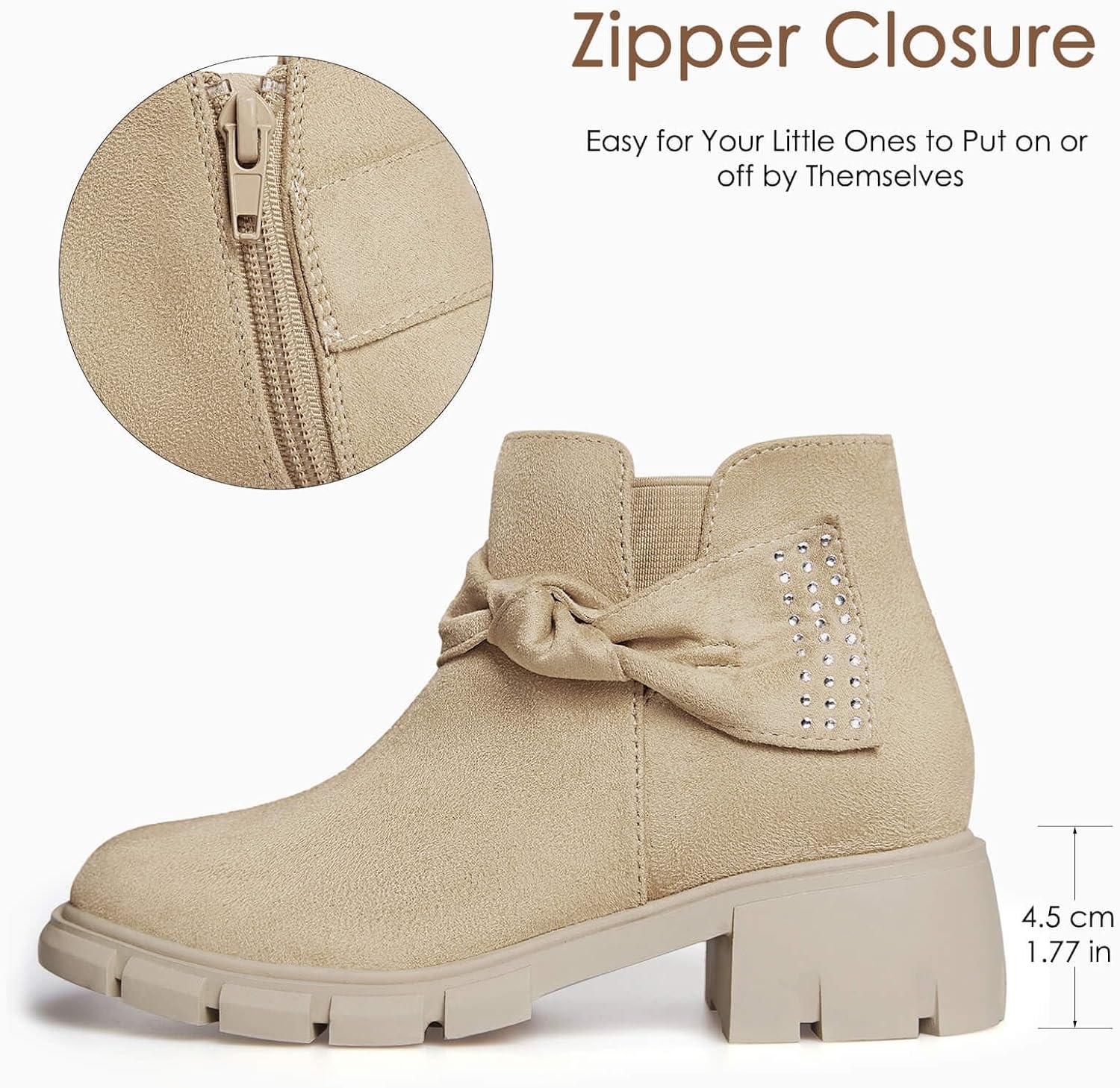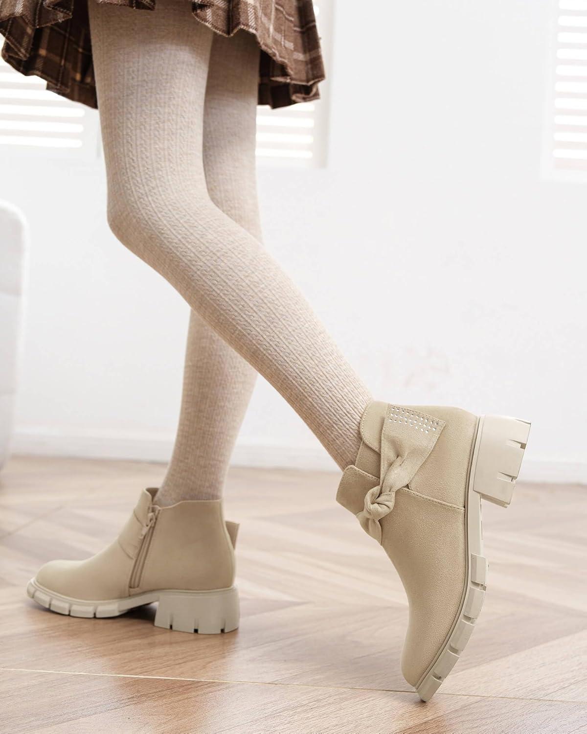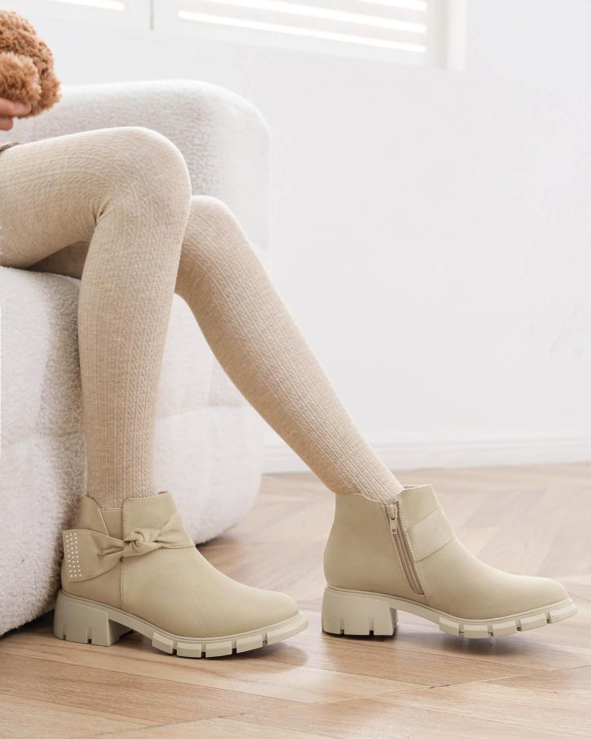 Coutgo Girls Ankle Boots Low Block Heel Glitter Bowknot Zipper Chelsea Booties Little Kid Big Kids(Apricot)