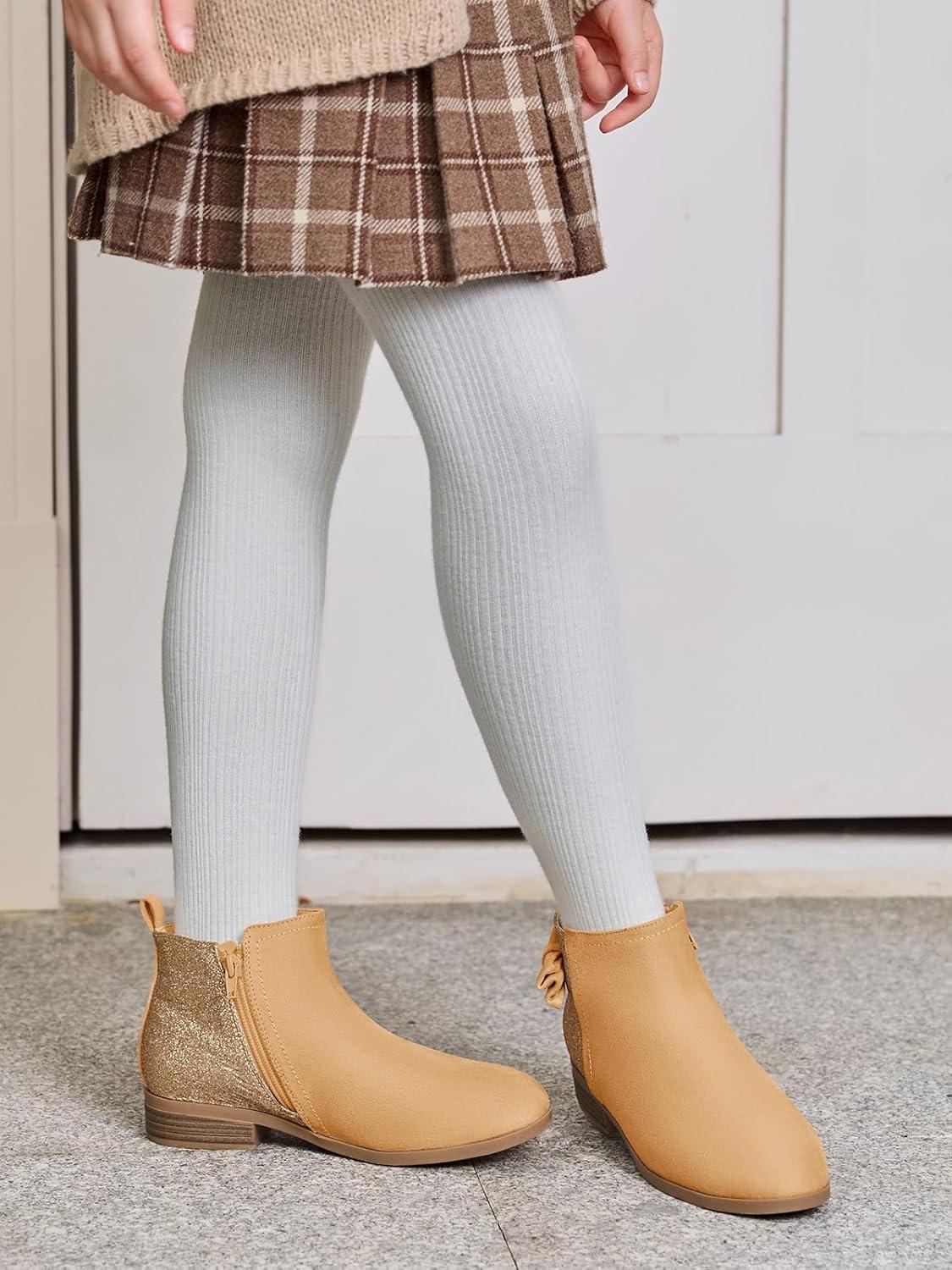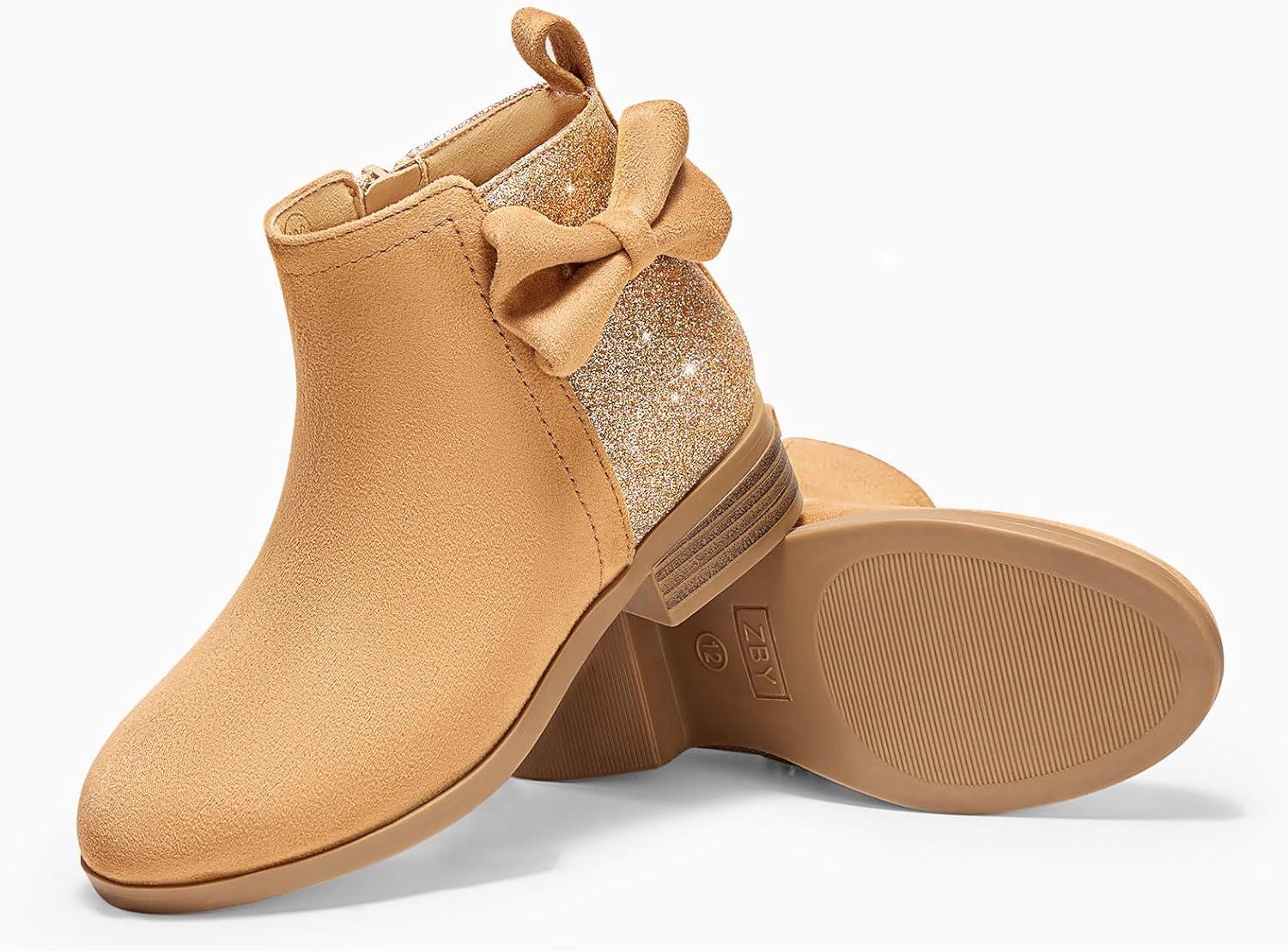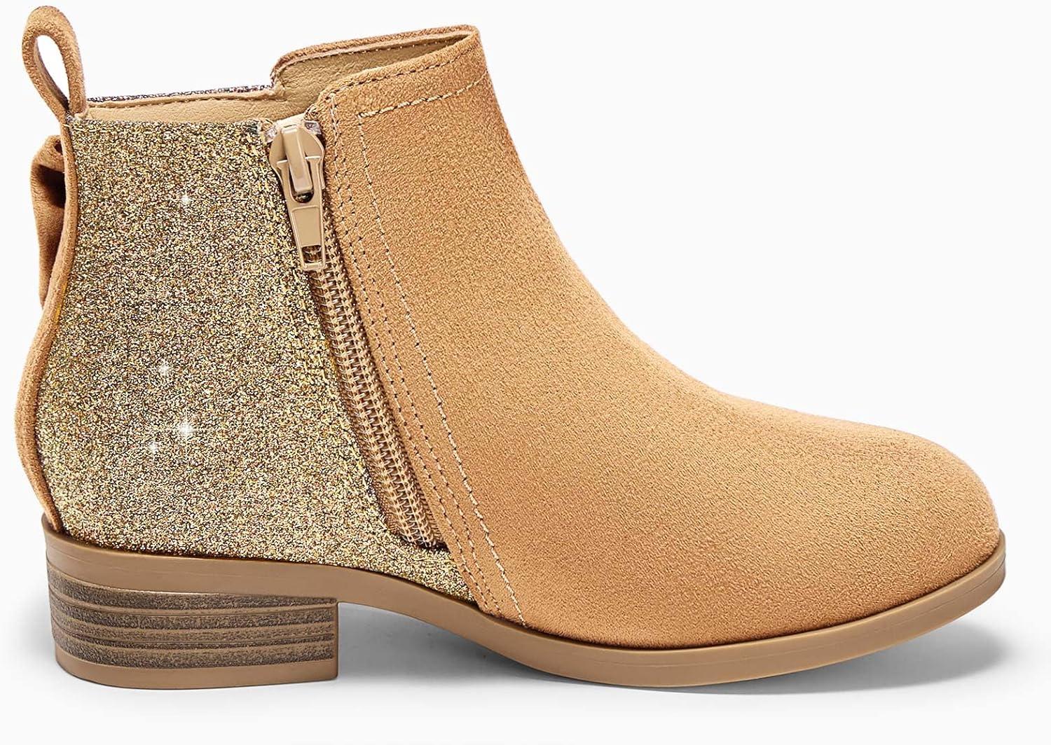Coutgo Girls Bow Glitter Ankle Boots Side Zipper Low Heel Short Booties Dress Shoes(Light Brown)