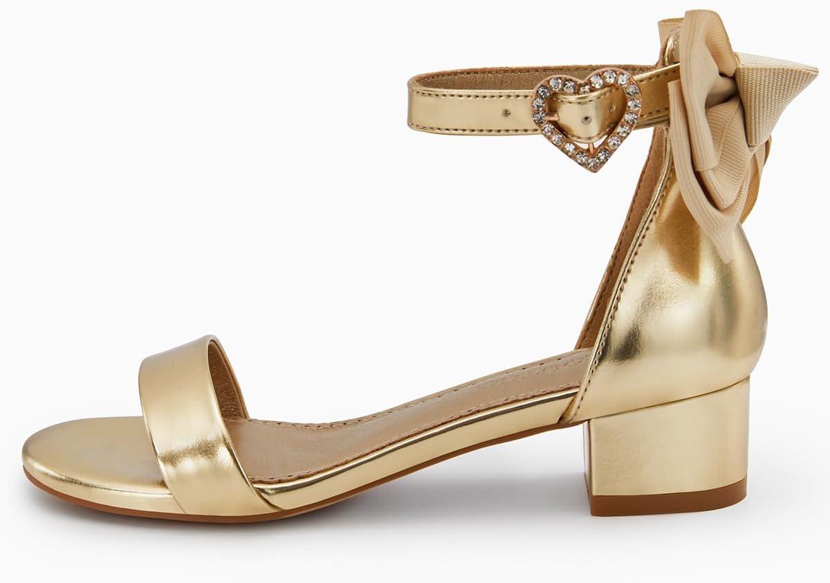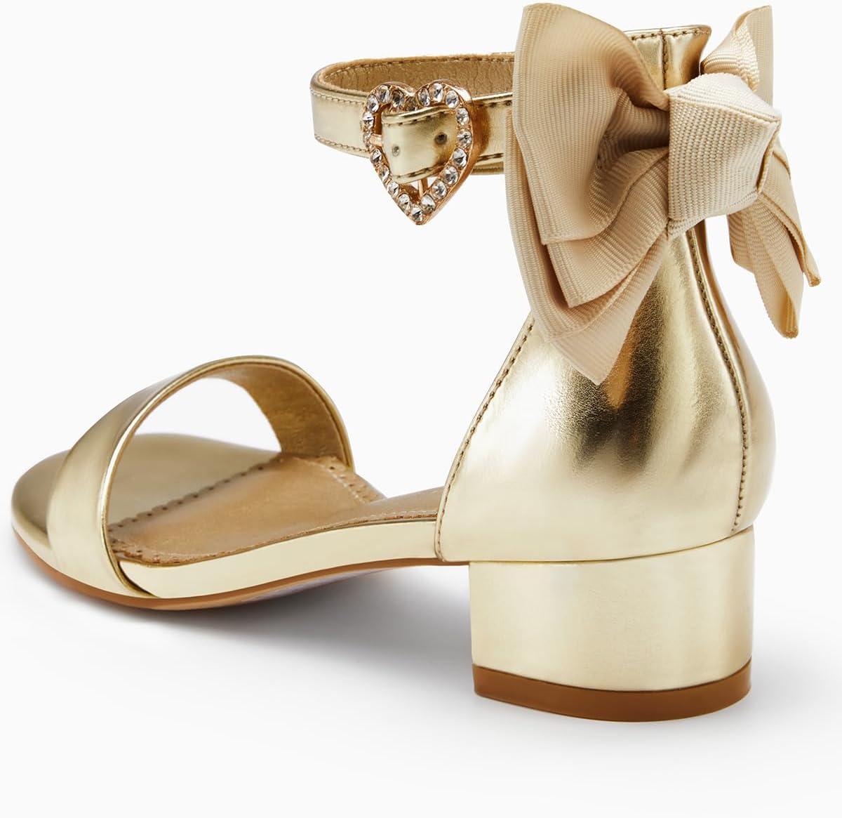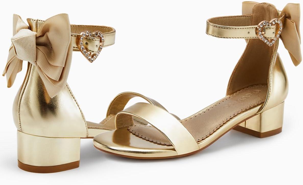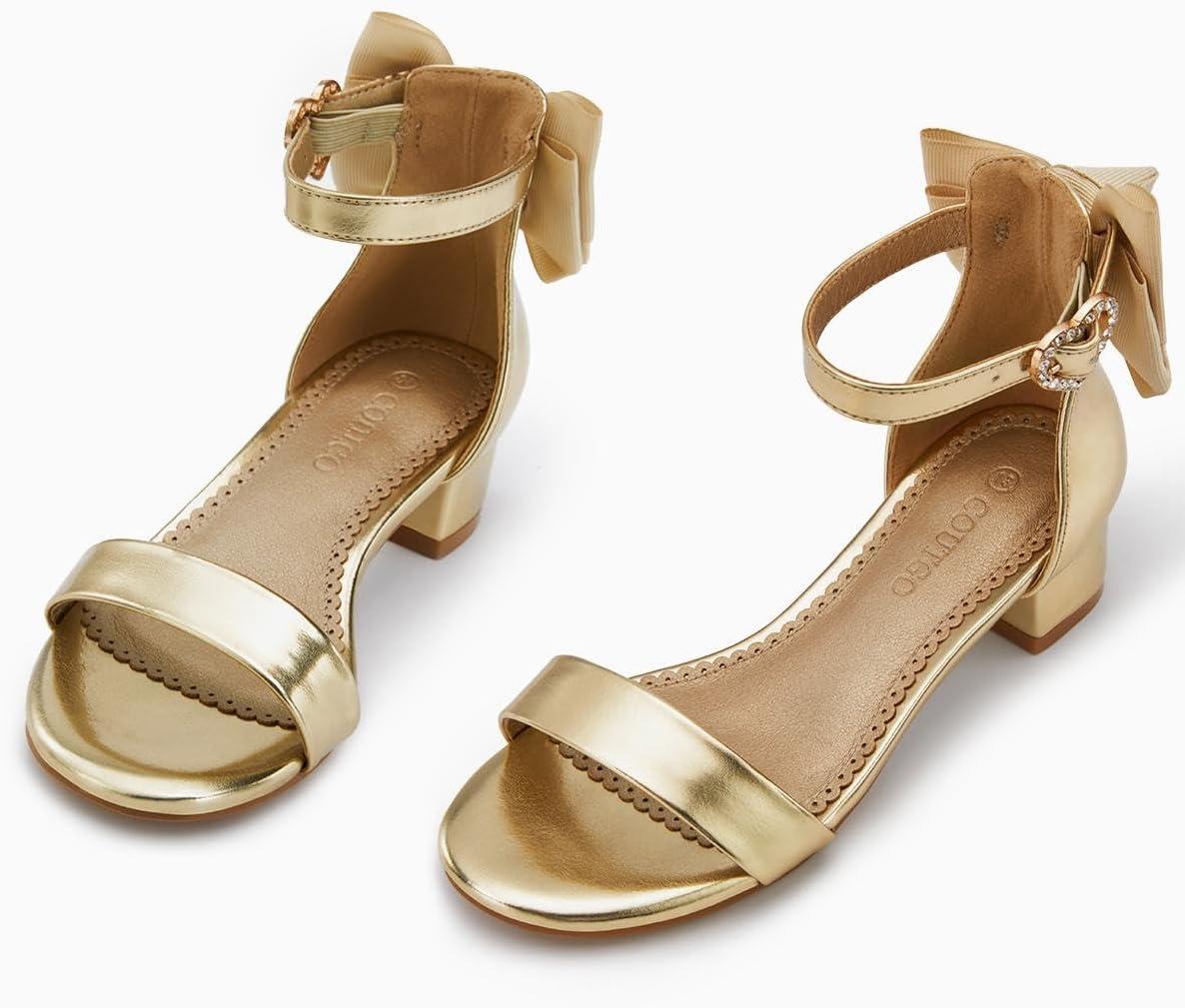 Coutgo Girl’s Bow Tie Heeled Sandals Open Toe Chunky Low Heel Rhinestone Princess Dress Shoes(Gold)