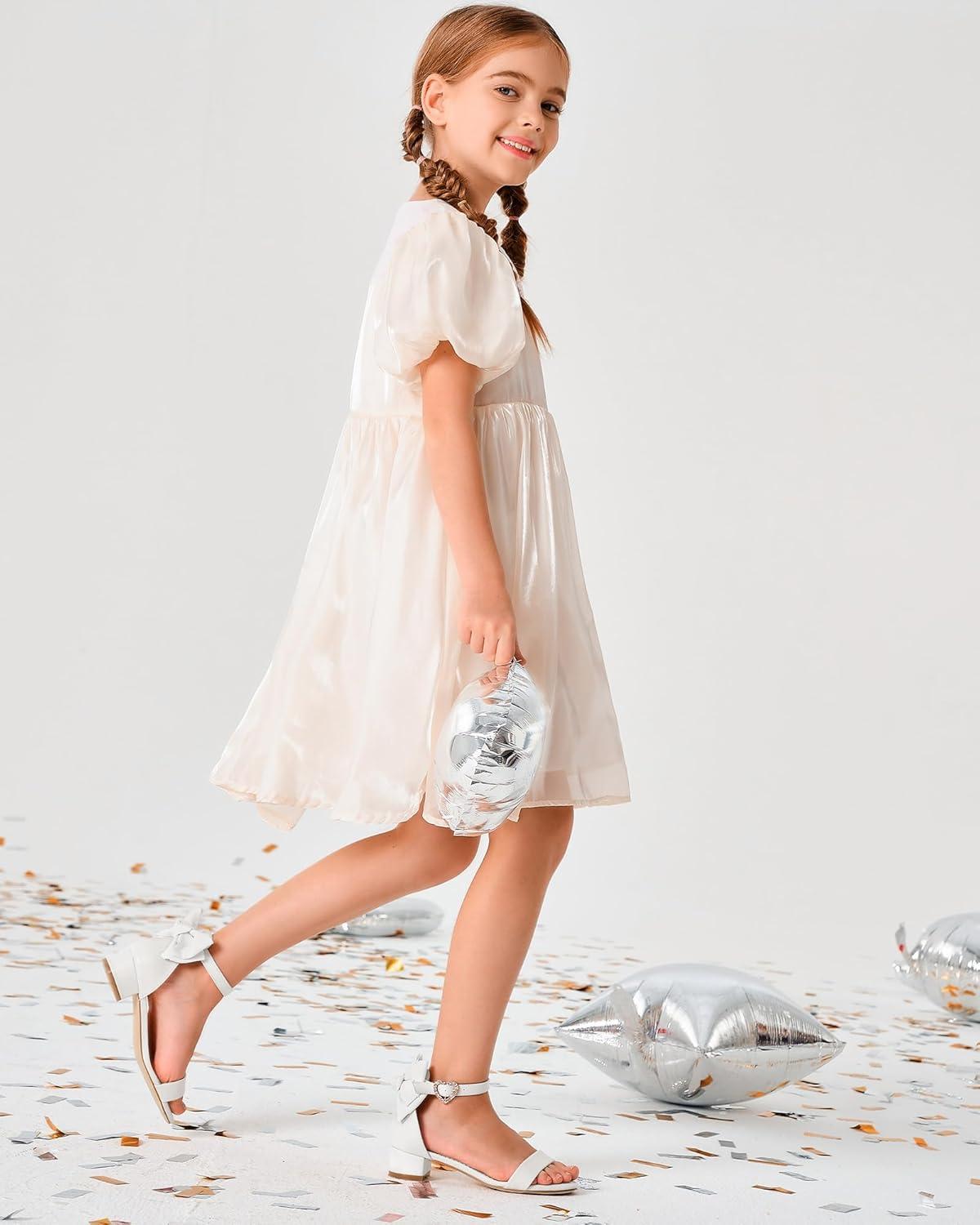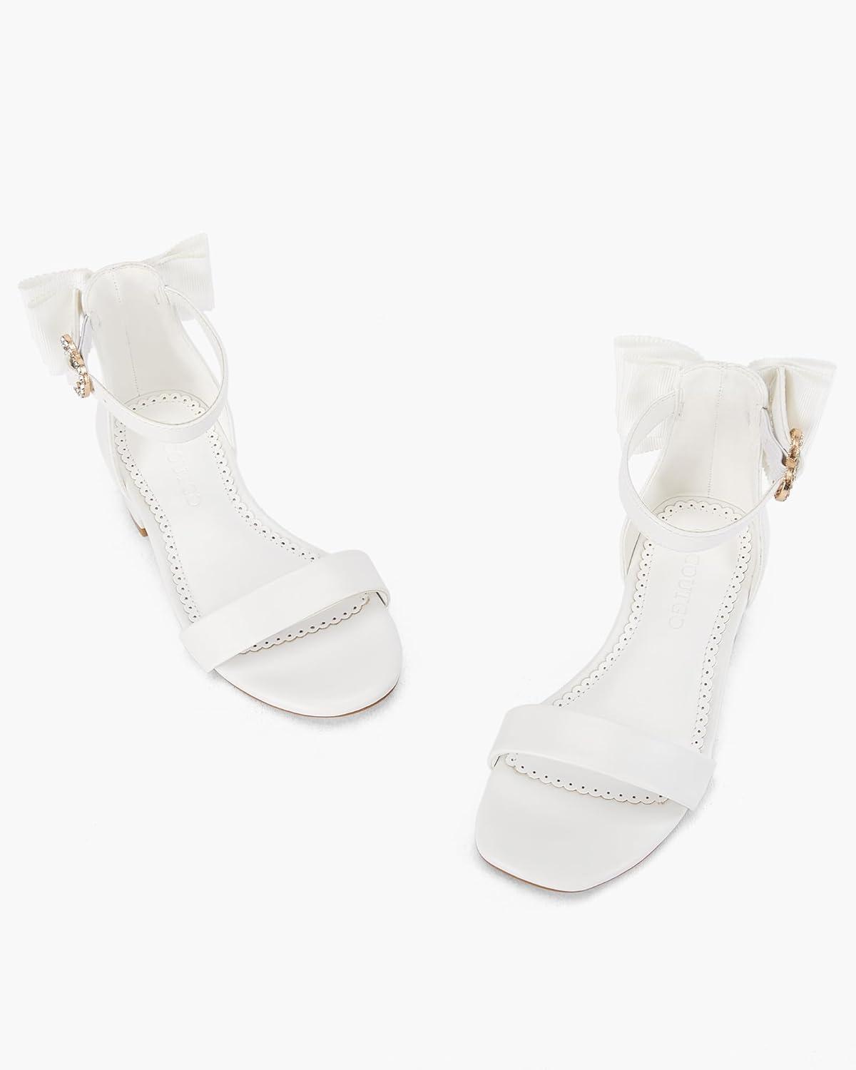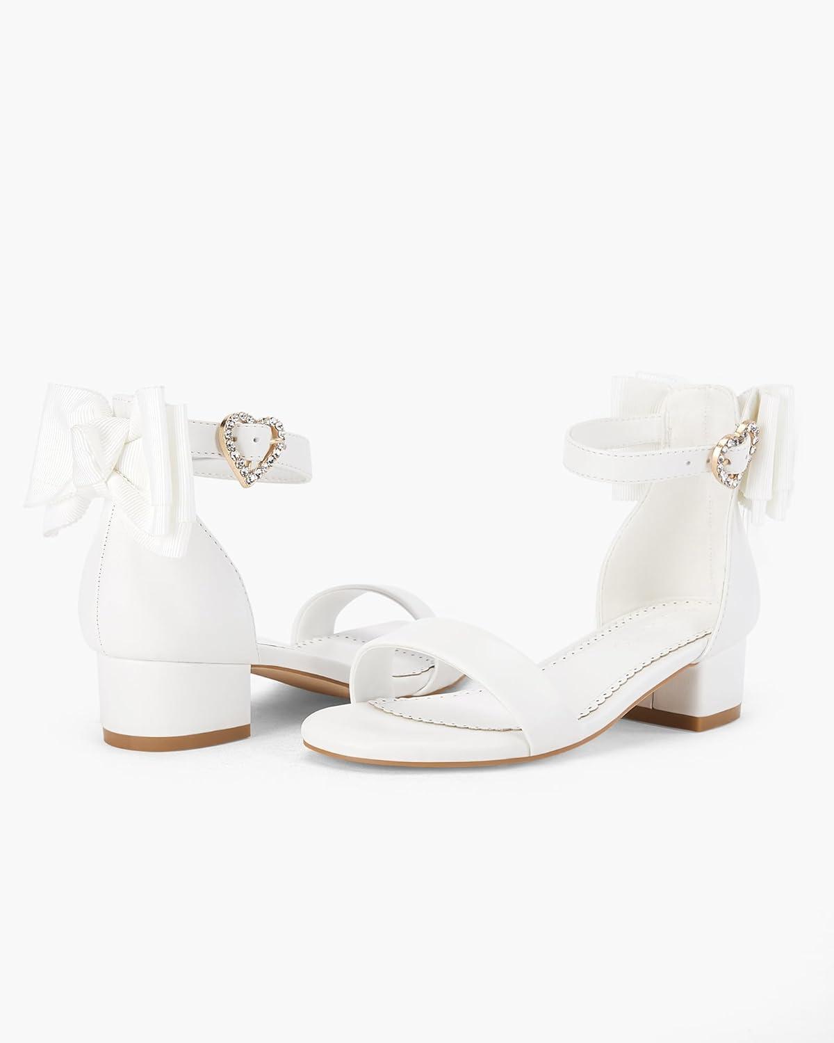 Coutgo Girl’s Bow Tie Heeled Sandals Open Toe Chunky Low Heel Rhinestone Princess Dress Shoes(White)