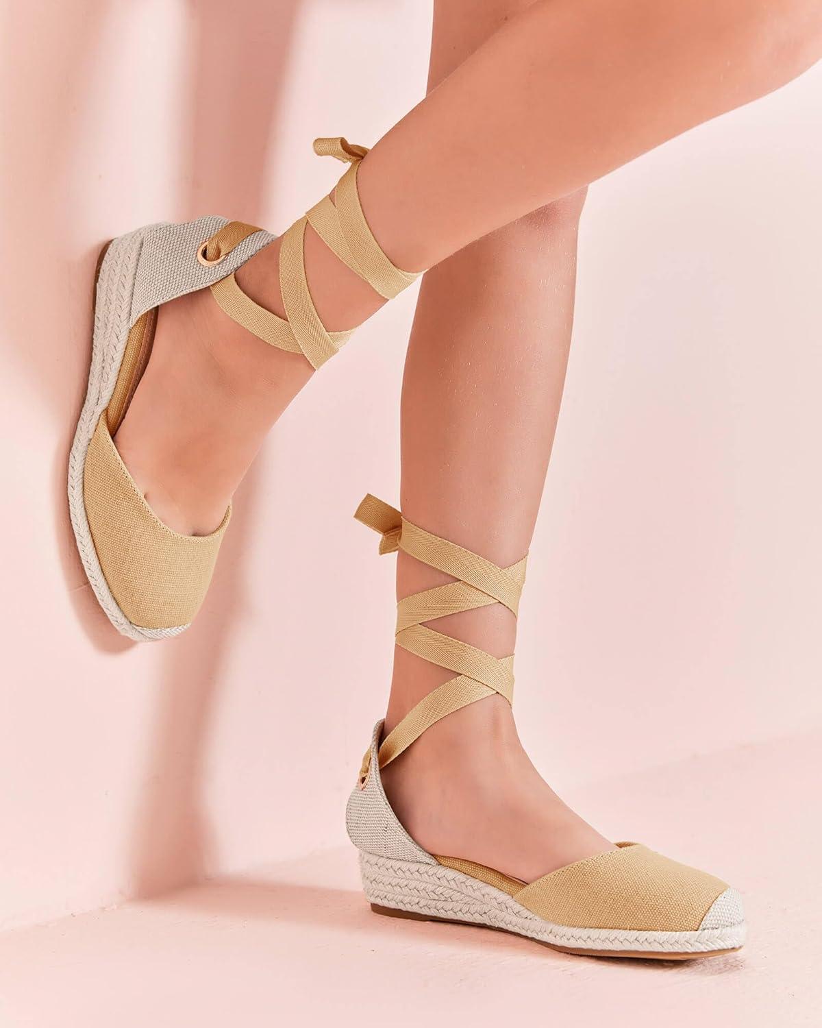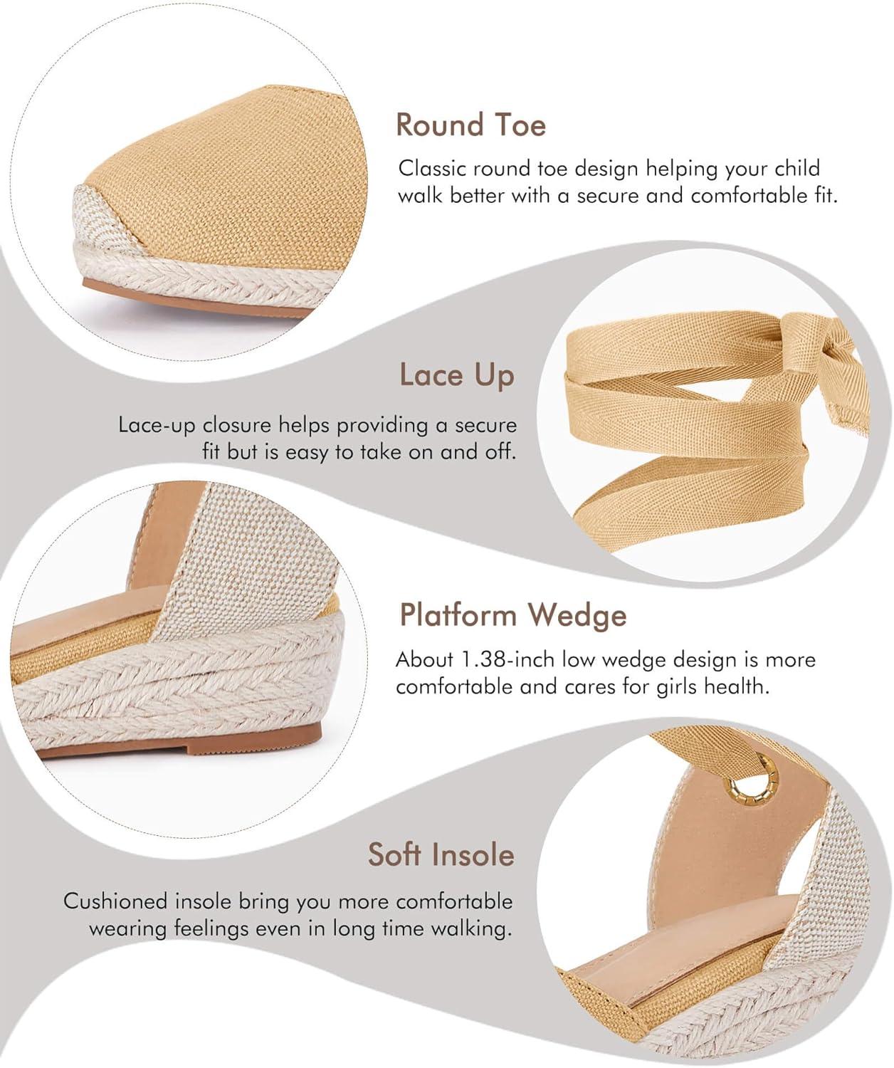 Coutgo Girls Espadrille Platform Wedge Sandals Closed Toe Lace Up Ankle Strap Summer Shoes Toddler Little Big Kid(Khaki)