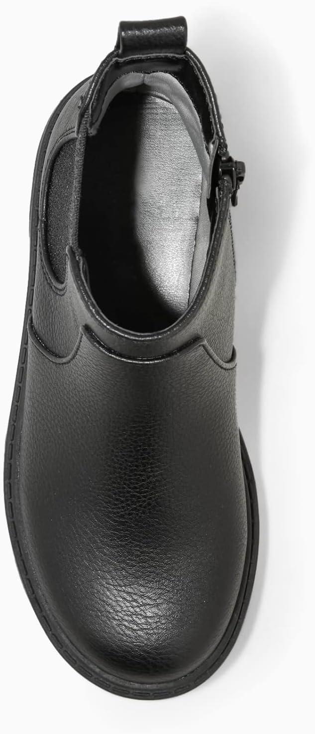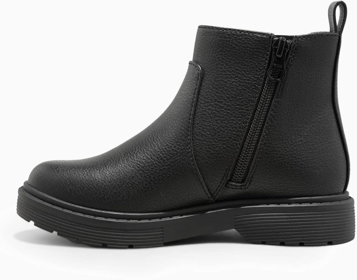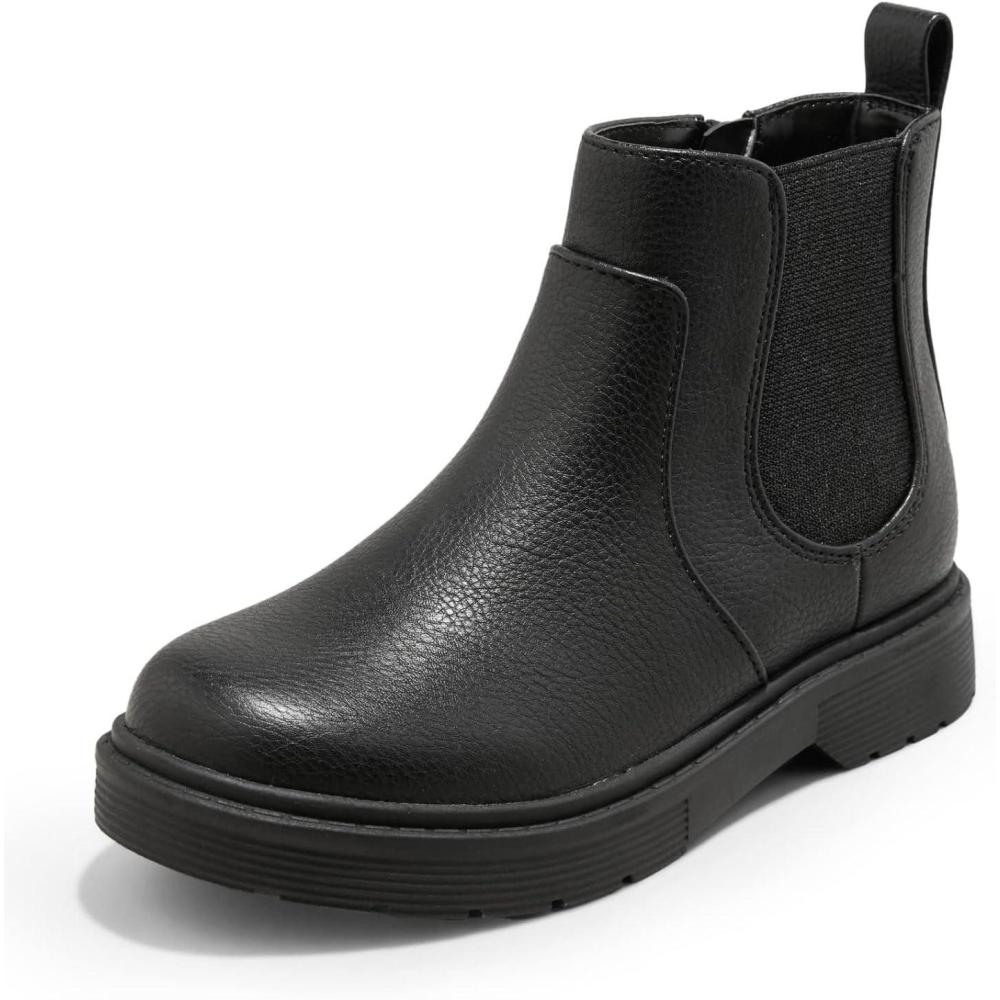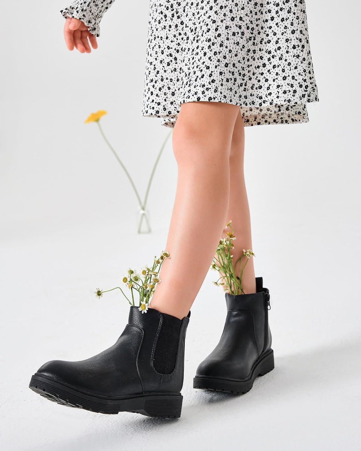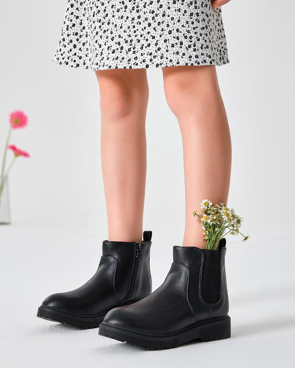 Coutgo Girls Kids Lug Sole Ankle Boots Side Zip Chunky Low Heel Slip On Winter Casual Chelsea Booties Shoes(Cool Black)