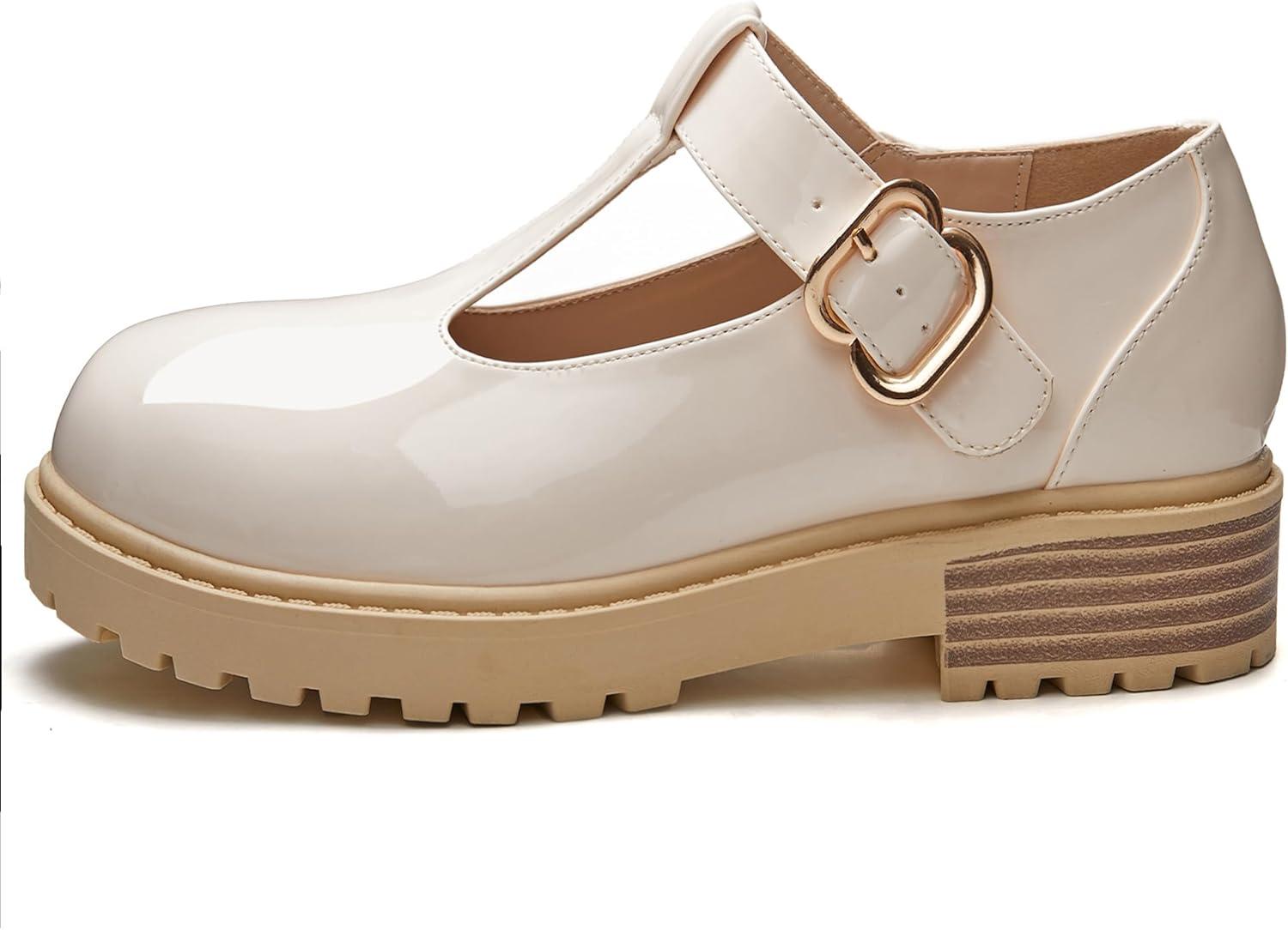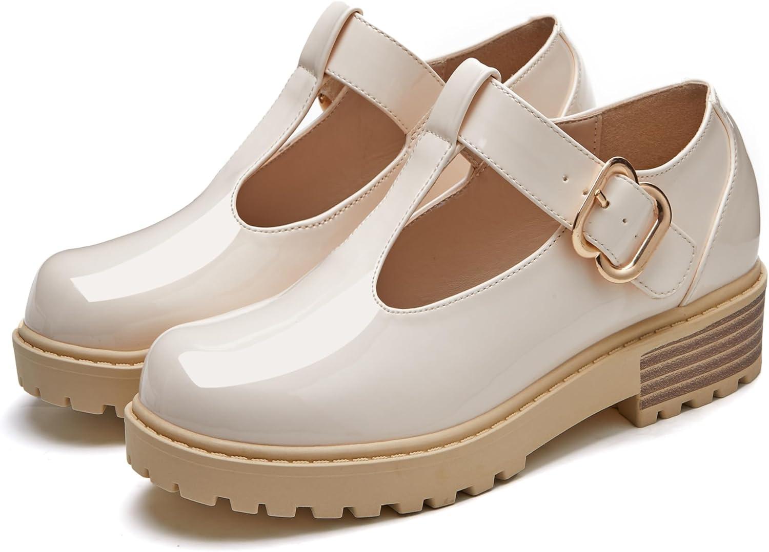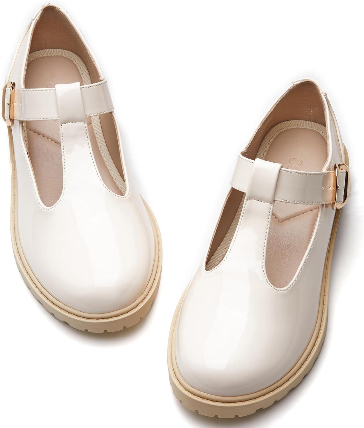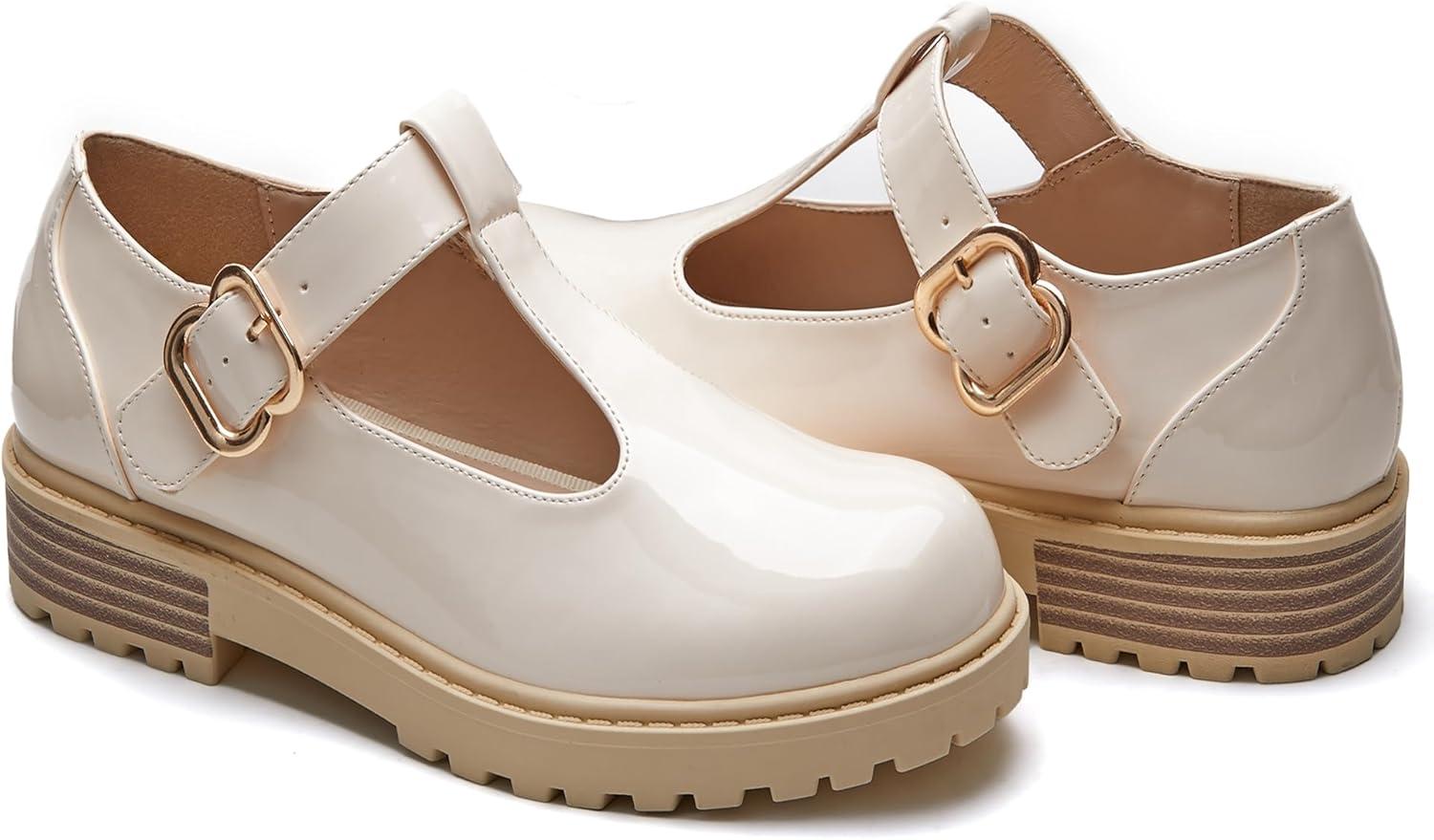Coutgo Girls Mary Jane Dress Shoes Platform Loafers School Uniform Chunky Heel Closed Toe T-Strap Flats(Beige)