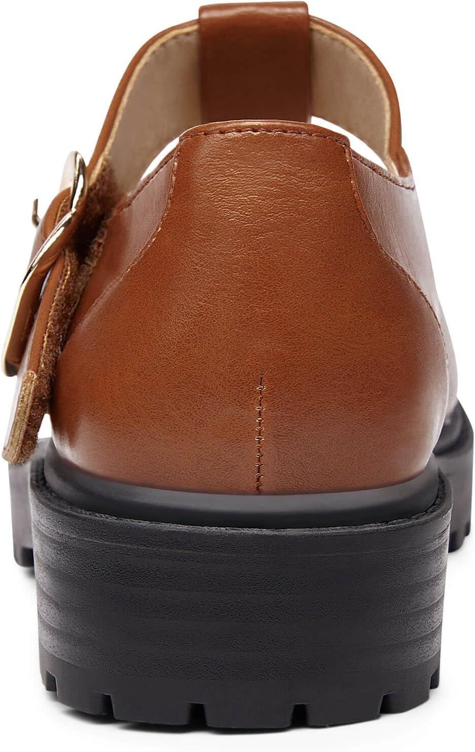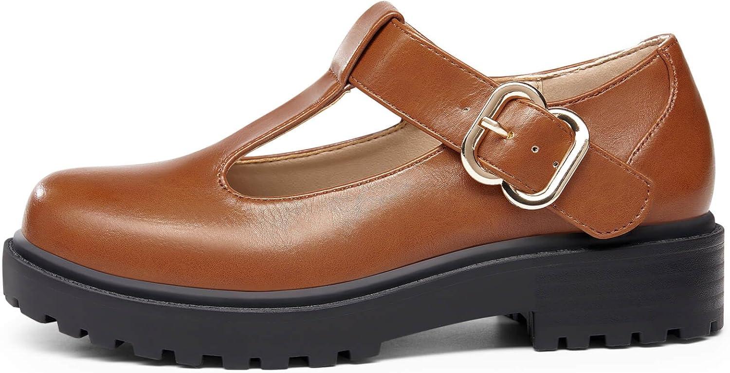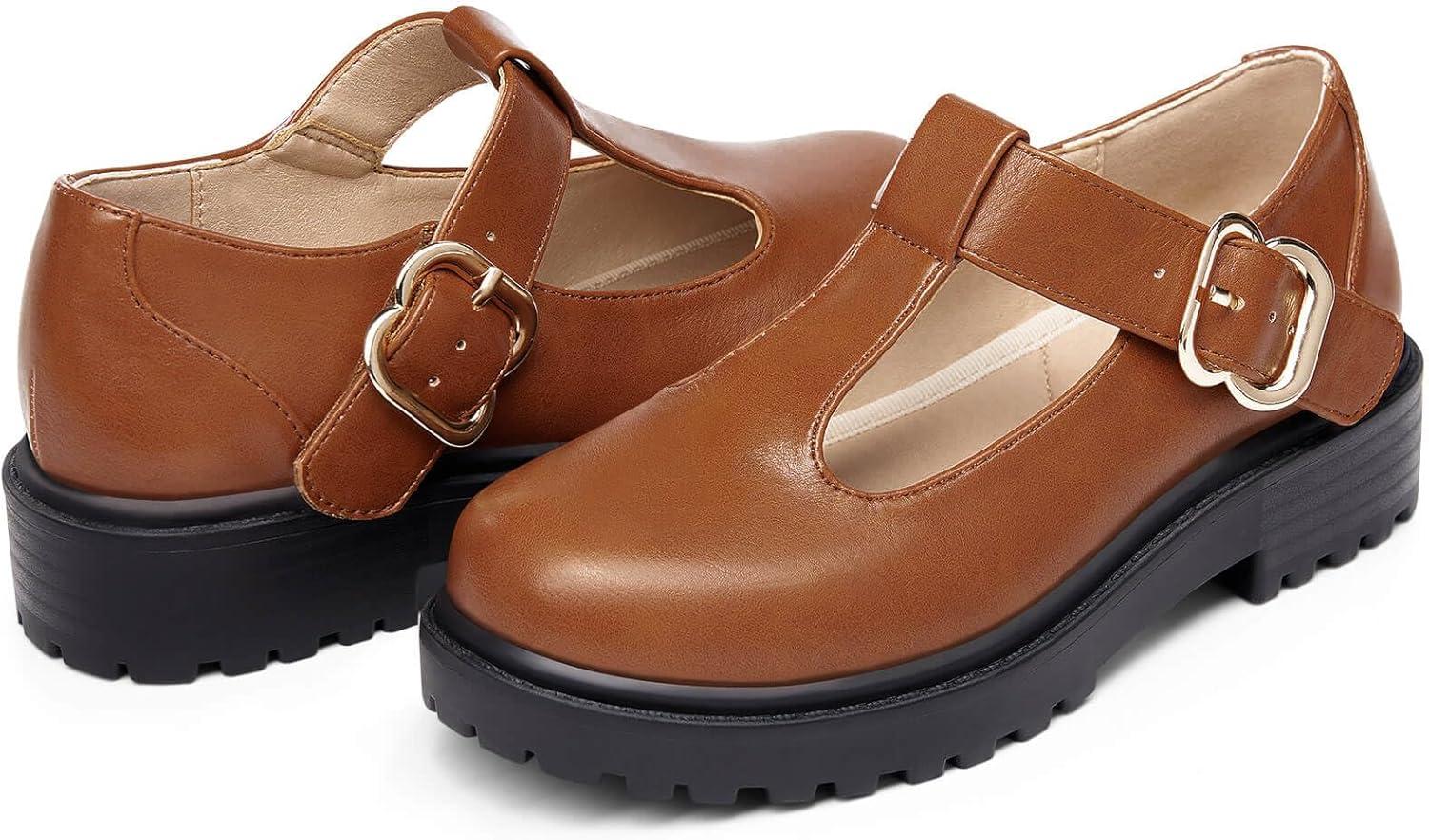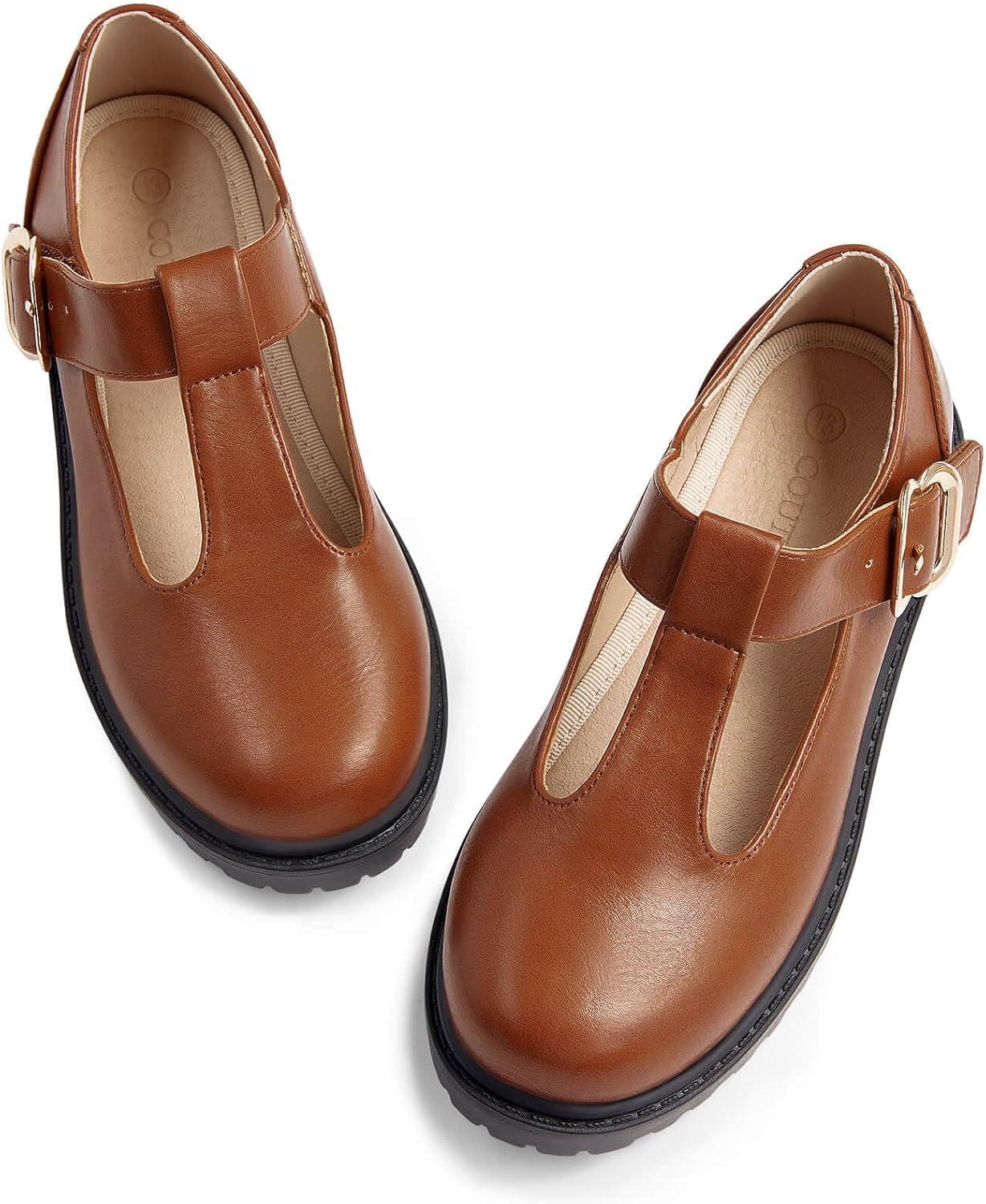 Coutgo Girls Mary Jane Dress Shoes Platform Loafers School Uniform Chunky Heel Closed Toe T-Strap Flats(Brown)