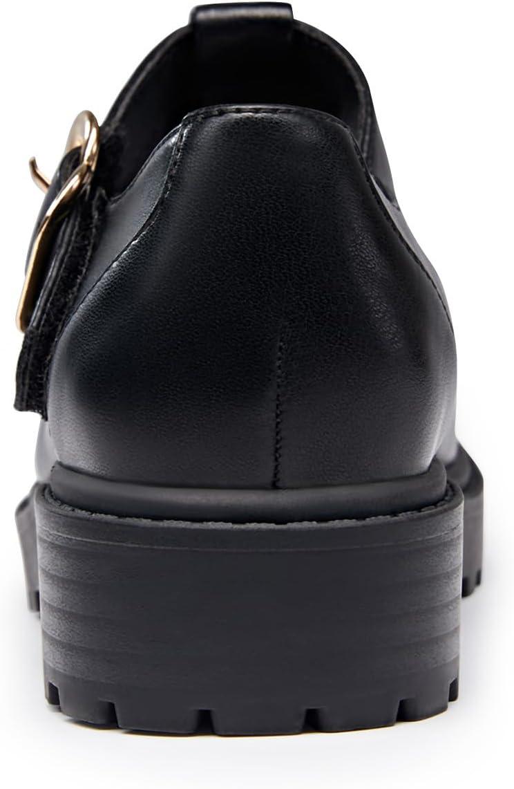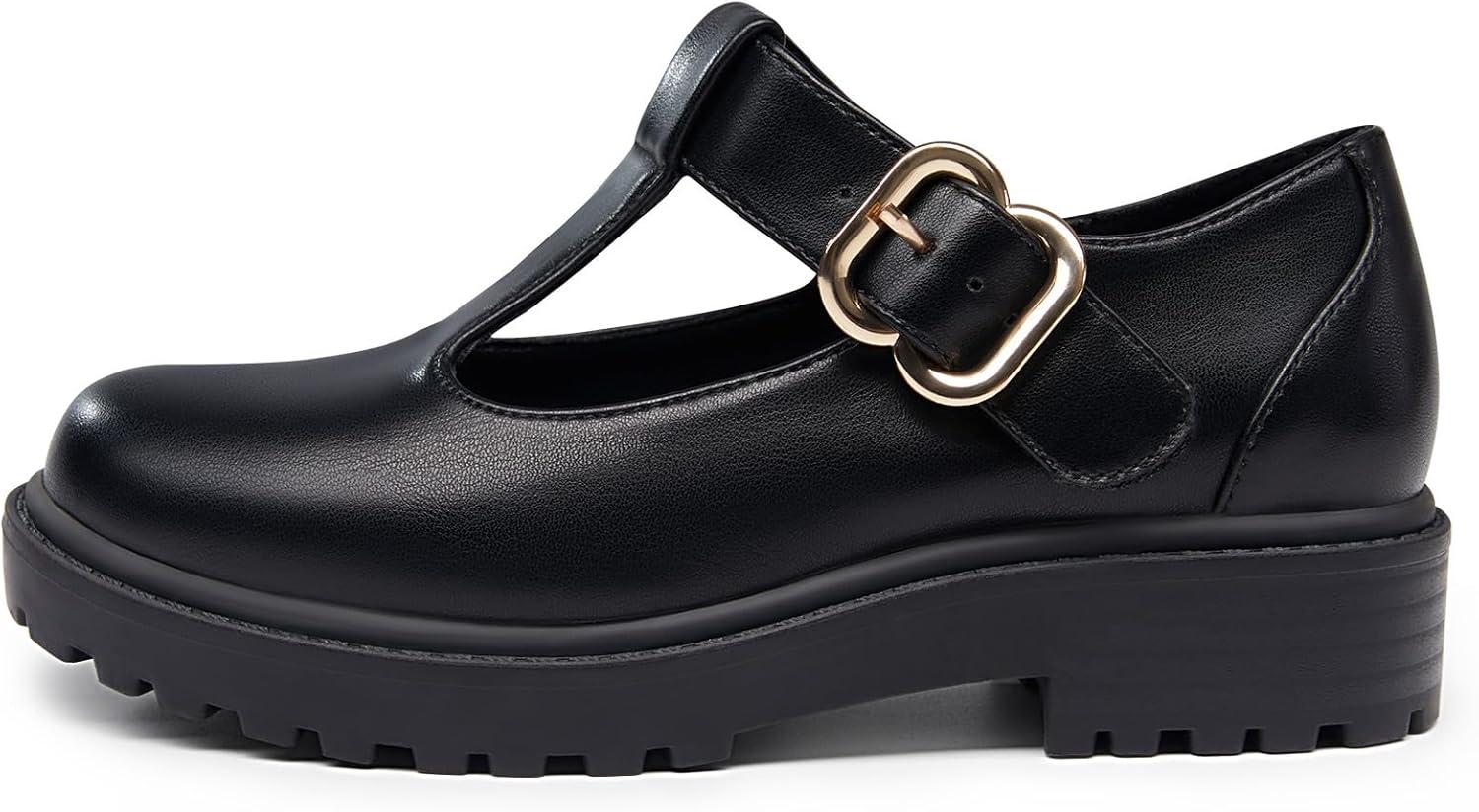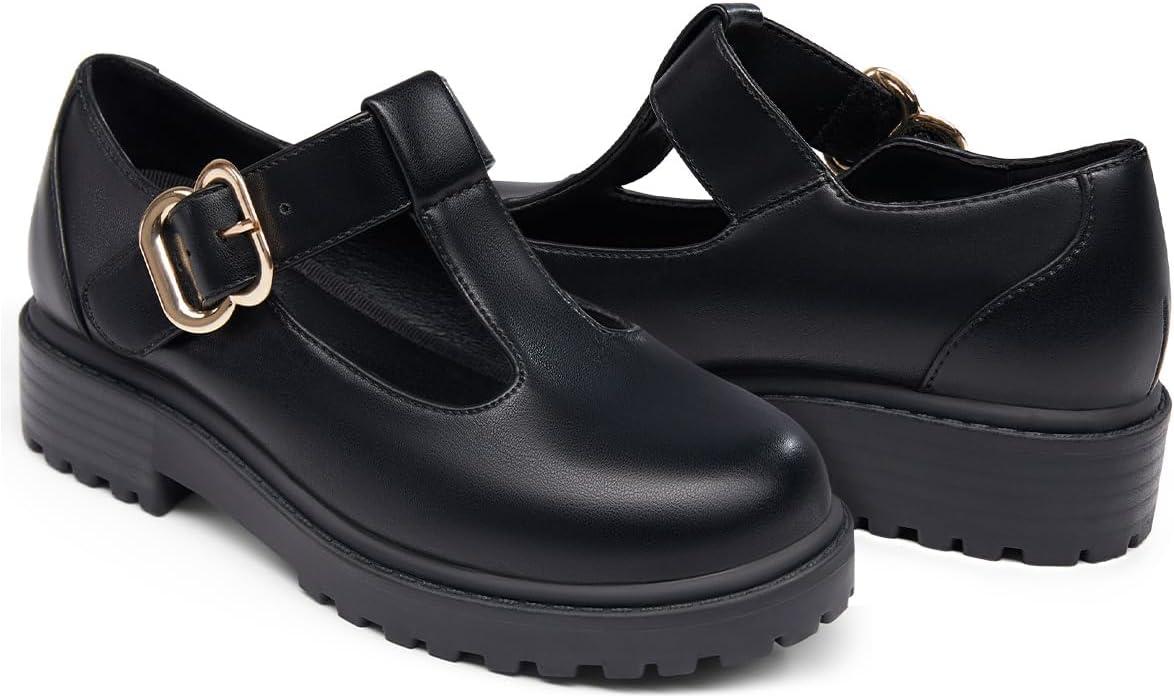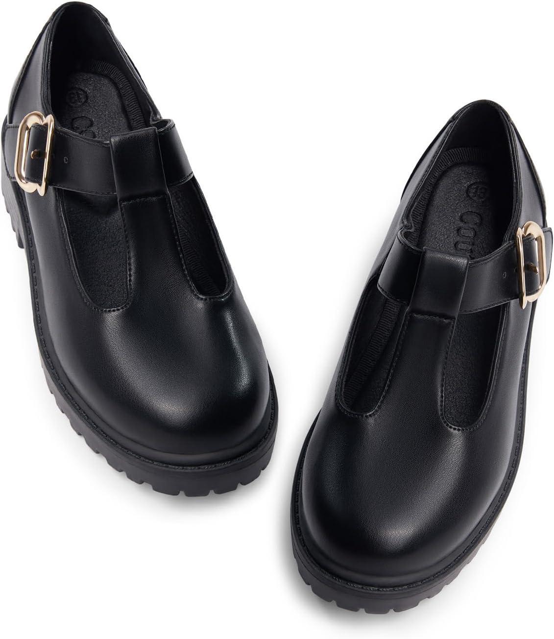 Coutgo Girls Mary Jane Dress Shoes Platform Loafers School Uniform Chunky Heel Closed Toe T-Strap Flats(Cool Black)