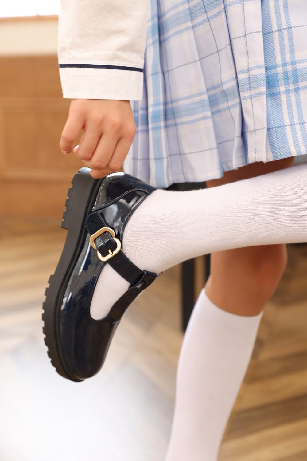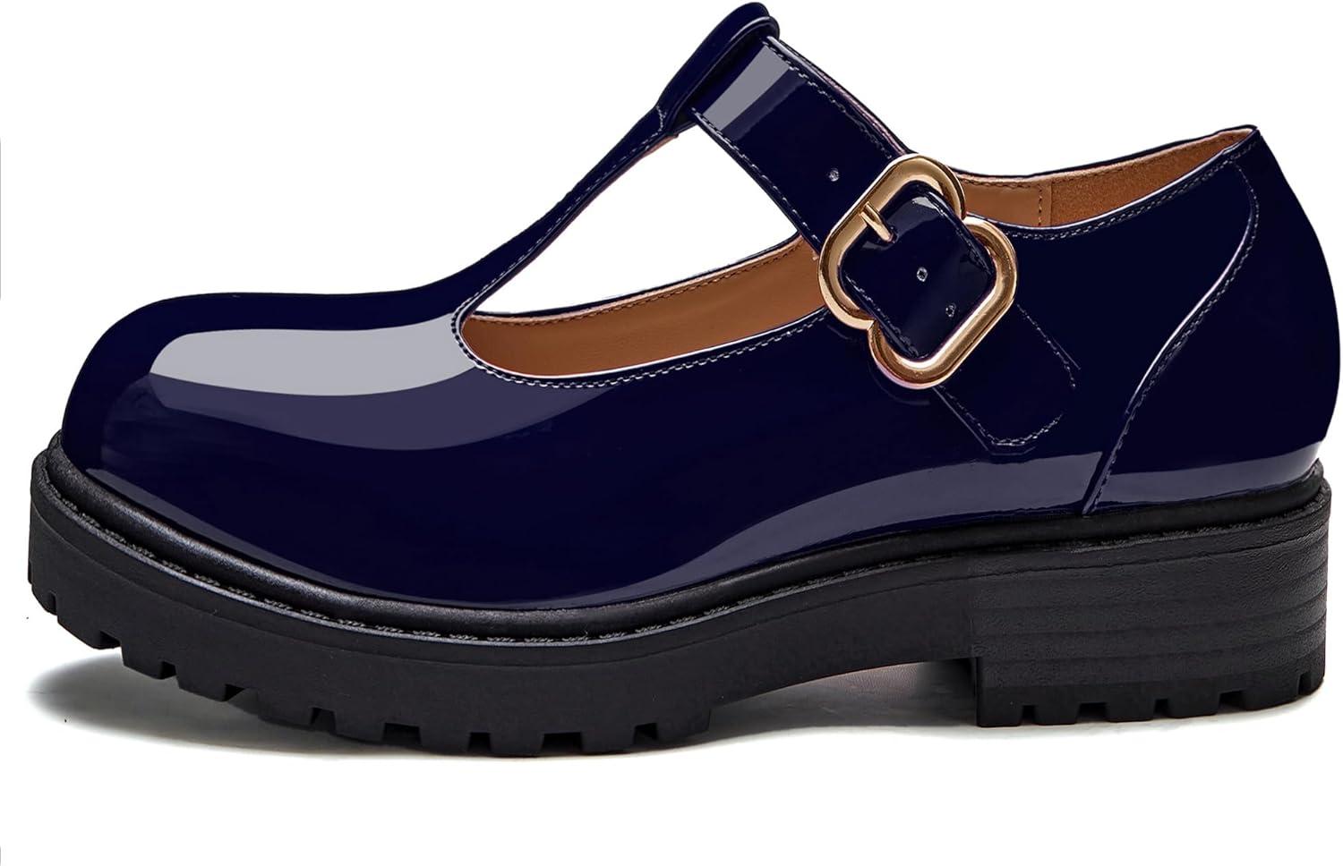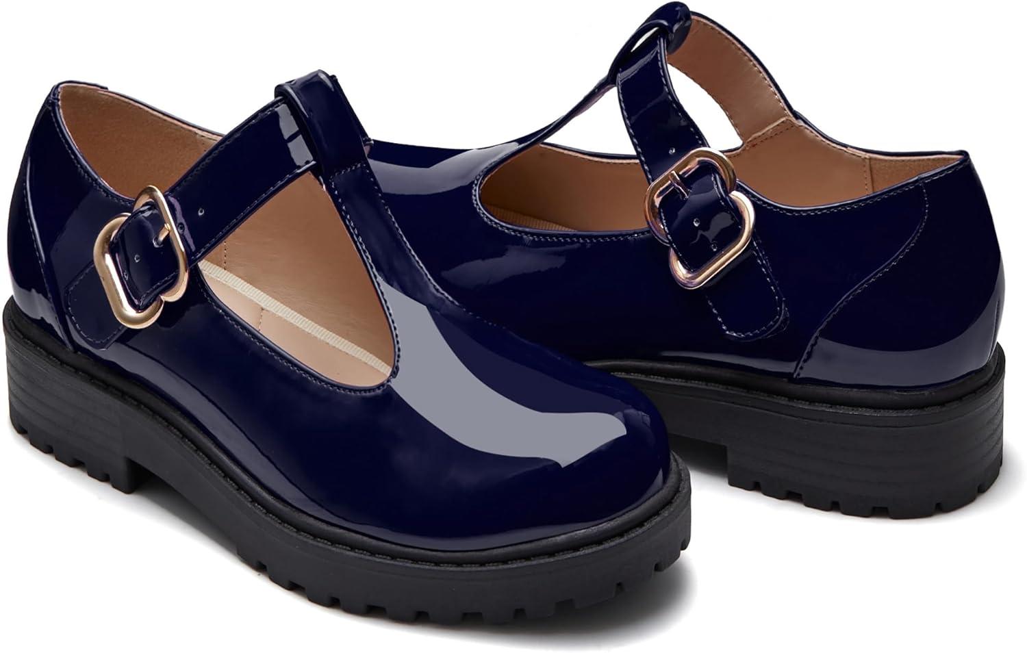 Coutgo Girls Mary Jane Dress Shoes Platform Loafers School Uniform Chunky Heel Closed Toe T-Strap Flats(Navy)