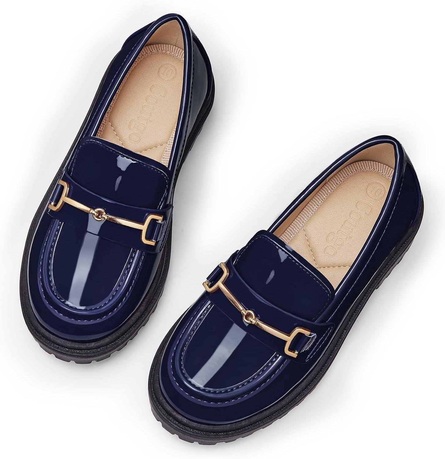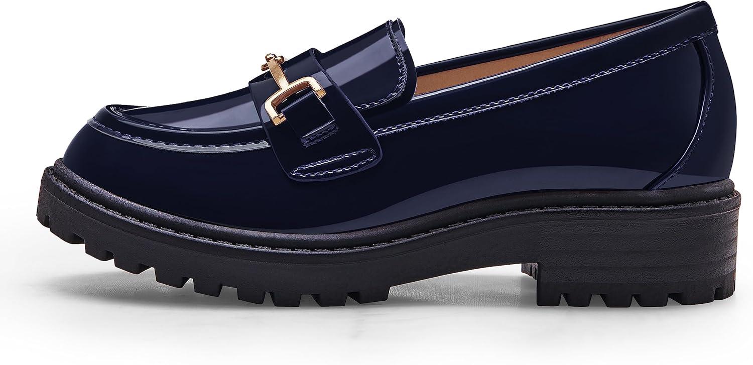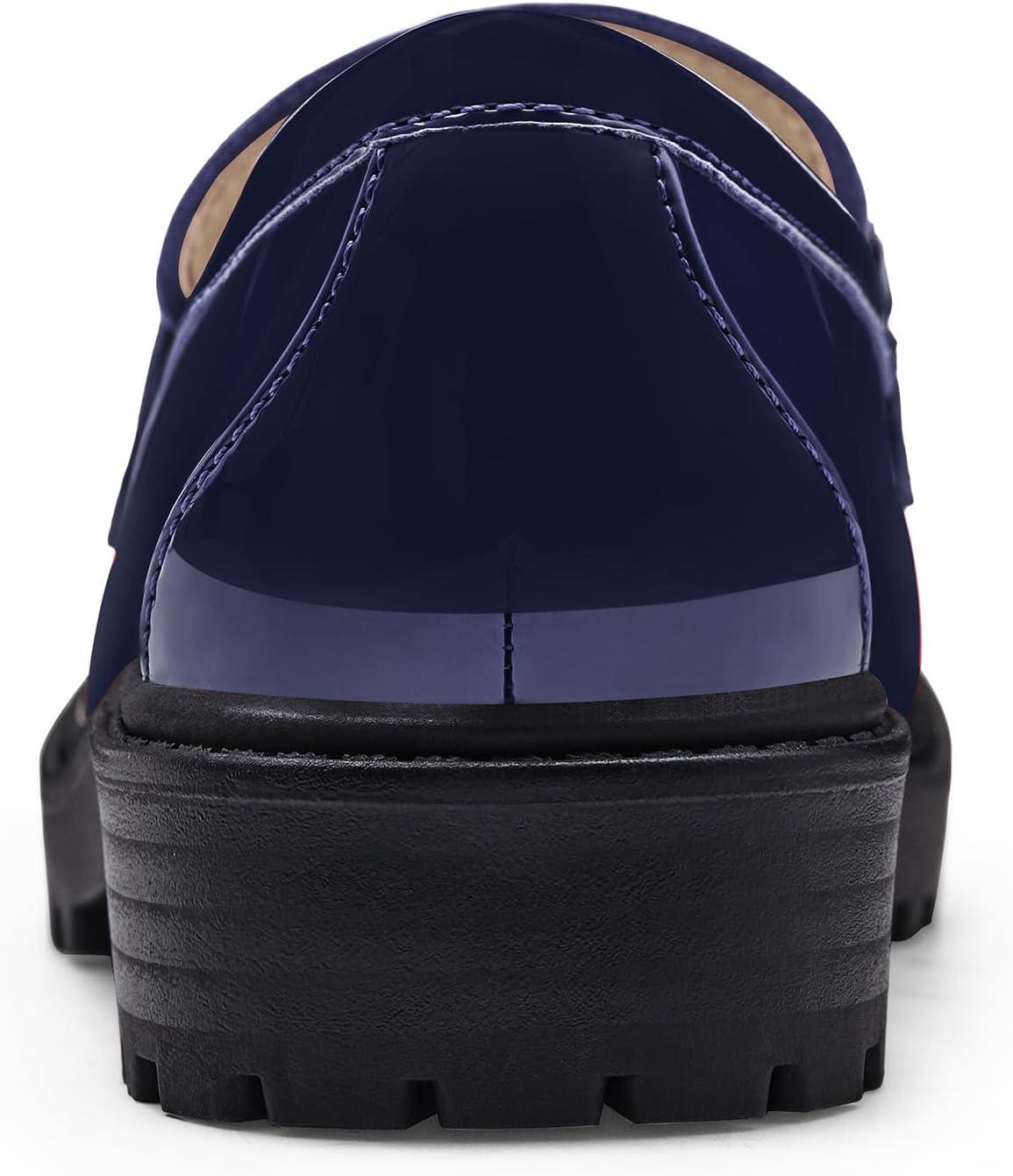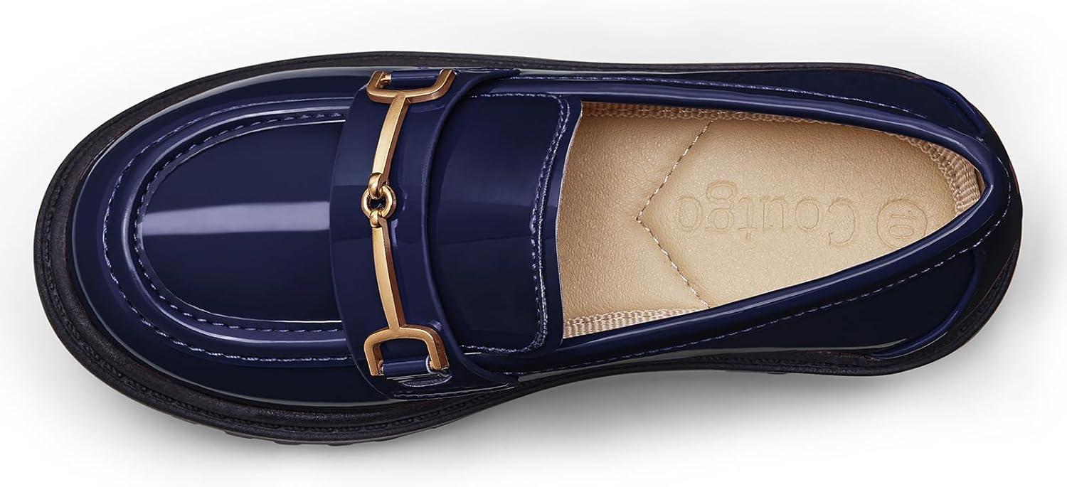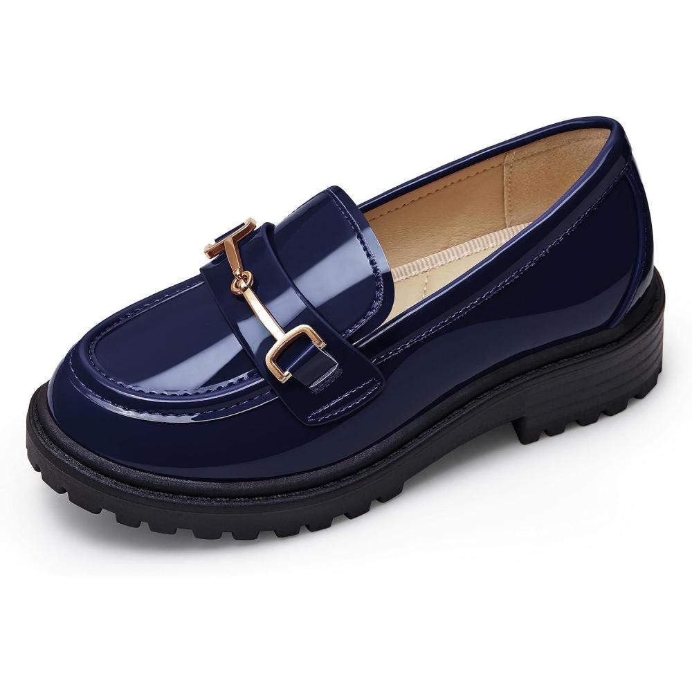 Coutgo Girl’s Platform Loafers Slip On Chain Chunky Heel Leather Flats Round Toe School Uniform Dress Shoes(Navy)