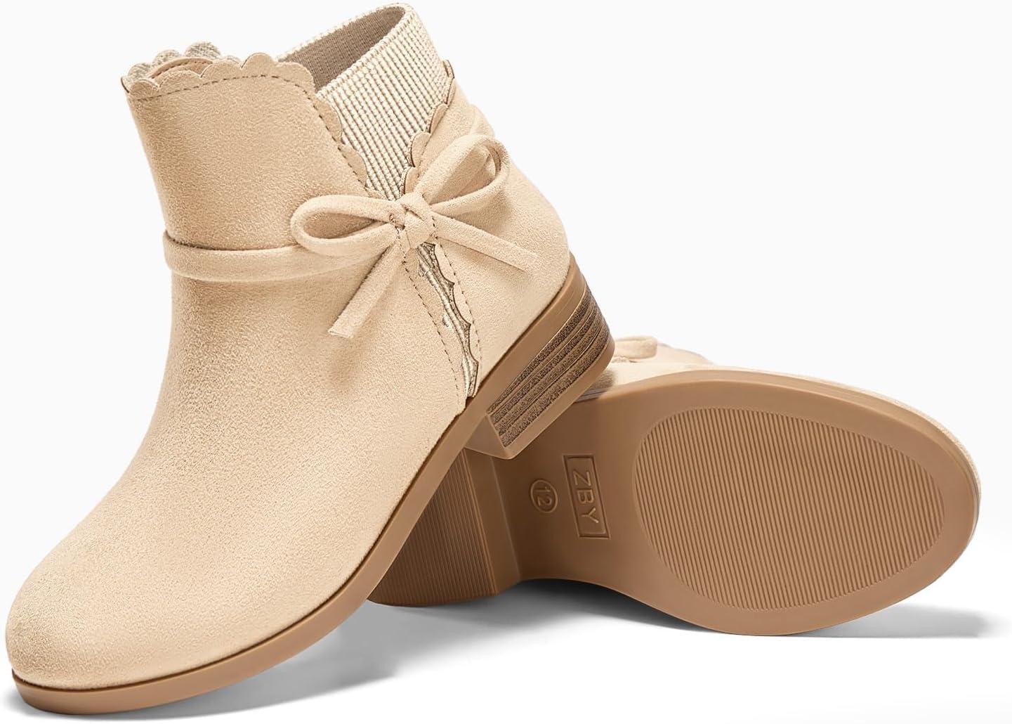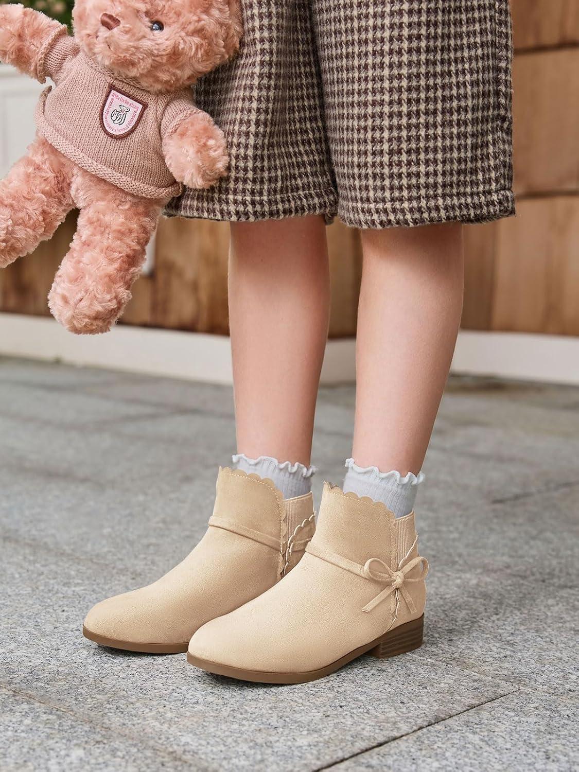 Coutgo Girls Toddler Bow Ankle Boots Pull On Low Chunky Heel Fall Dress Booties Shoes(Beige)