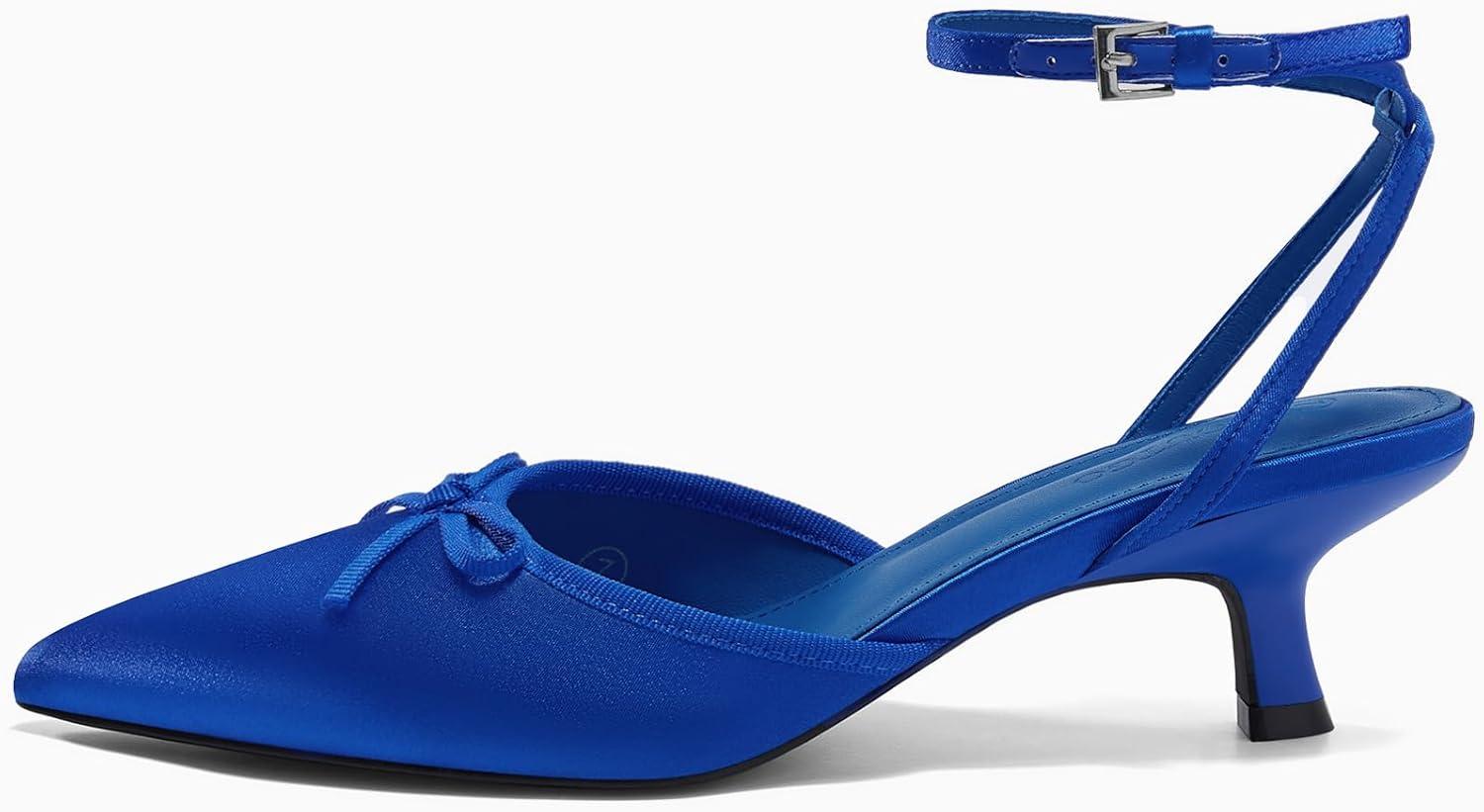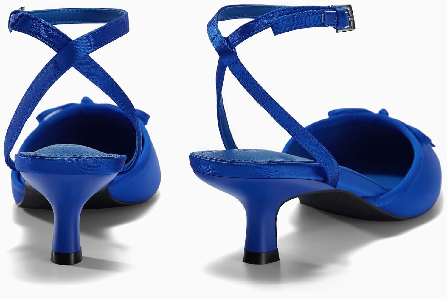 Coutgo Satin Kitten Low Heels with Bow Closed Pointed Toe Short Pumps Dress Wedding Party Shoes(Blue)