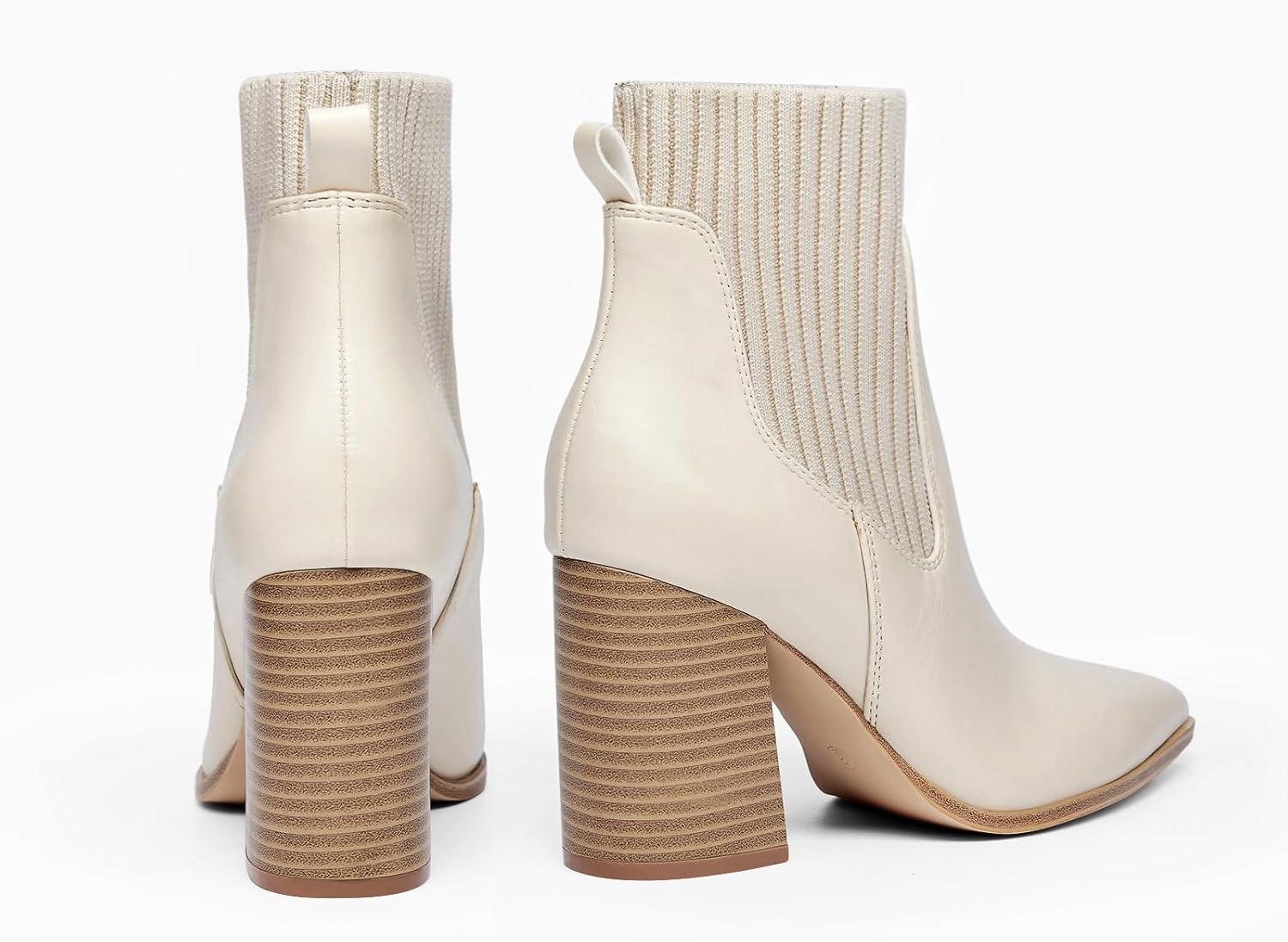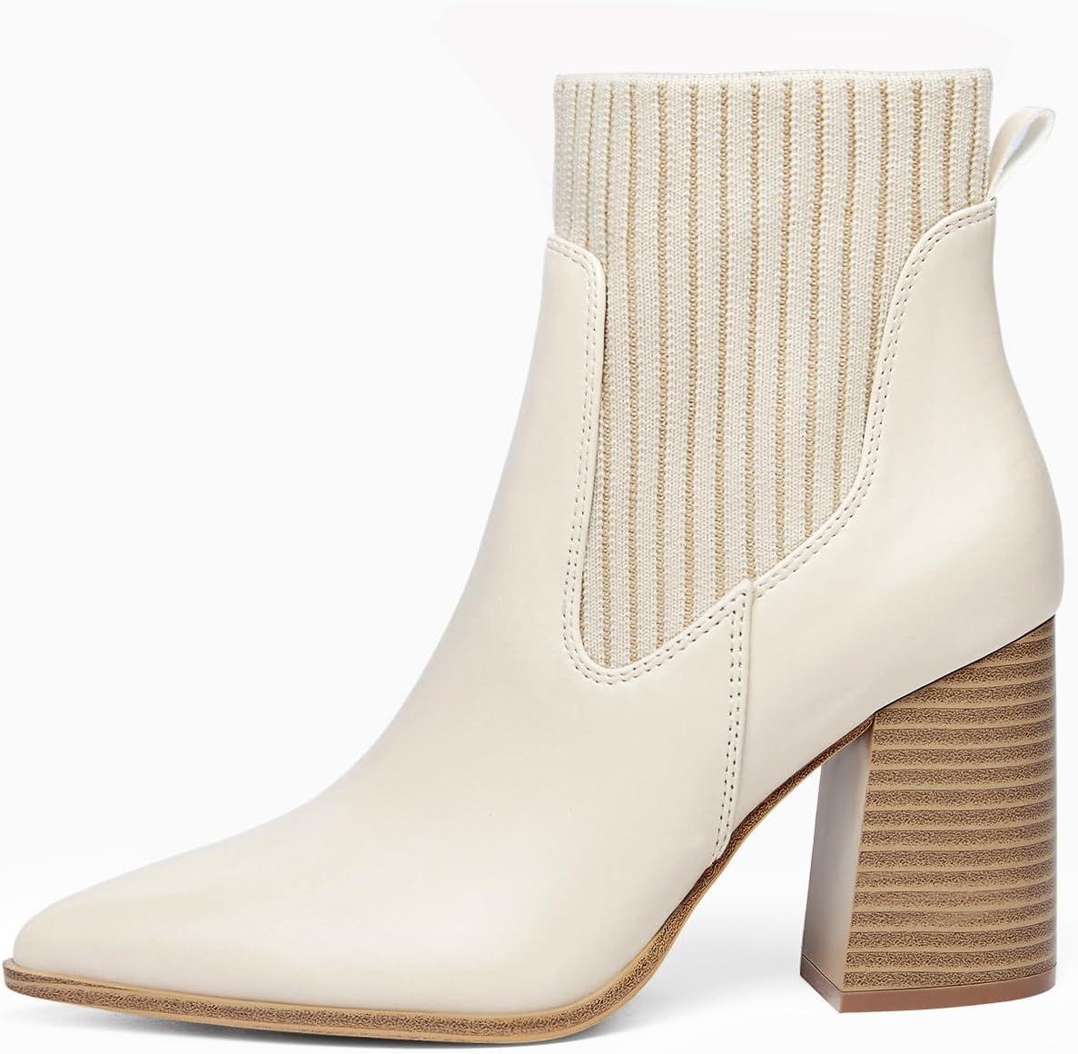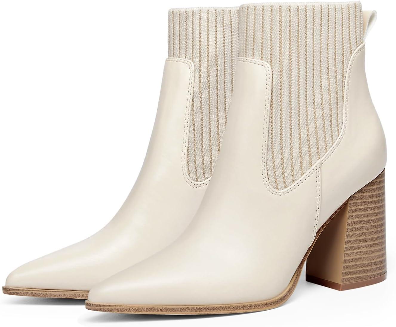Coutgo Women Ankle Boots Sock Booties Pointed Toe Chunky Stacked High Heel Knit Chelsea Winter Dress Booties(Beige)