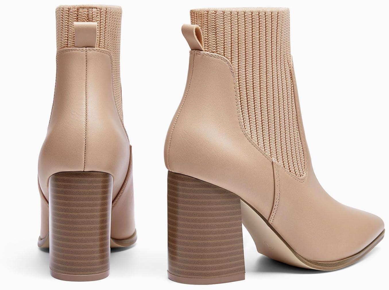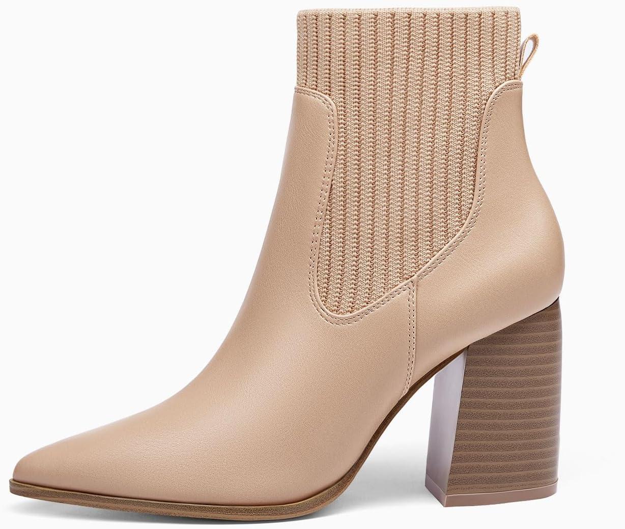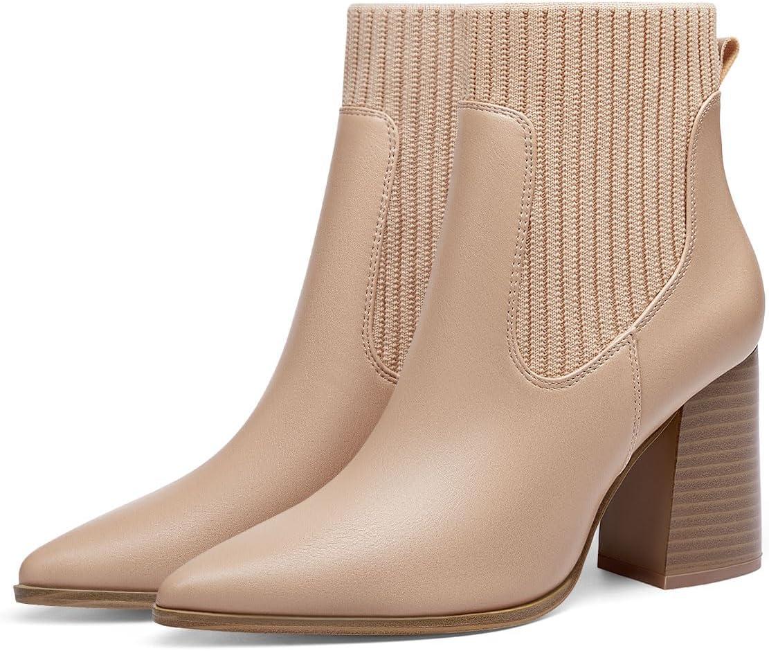 Coutgo Women Ankle Boots Sock Booties Pointed Toe Chunky Stacked High Heel Knit Chelsea Winter Dress Booties(Khaki)