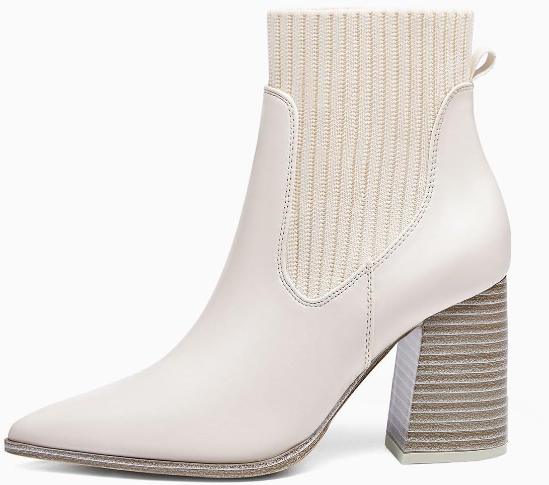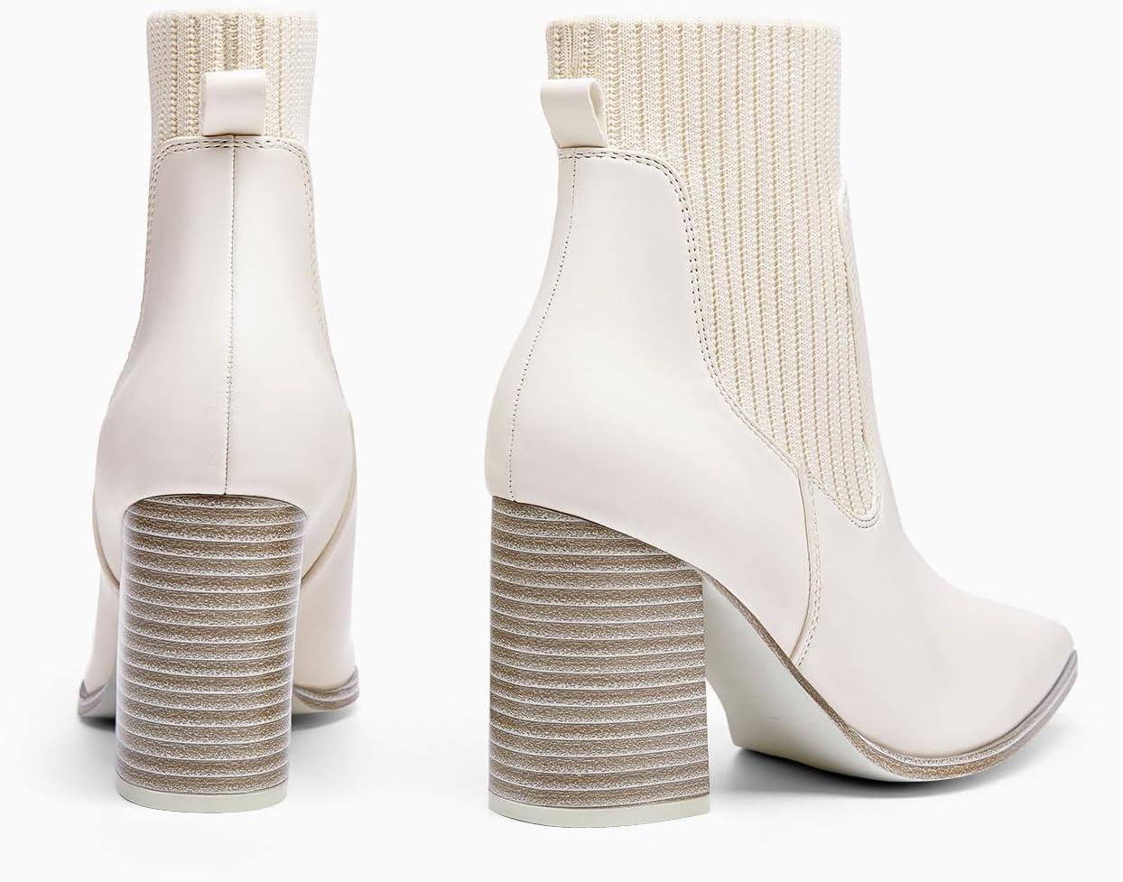 Coutgo Women Ankle Boots Sock Booties Pointed Toe Chunky Stacked High Heel Knit Chelsea Winter Dress Booties(White)
