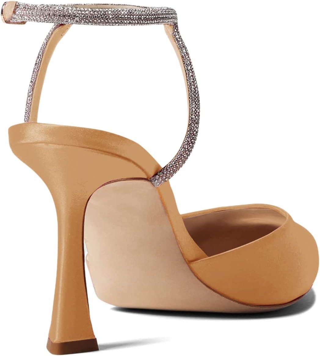 Coutgo Women Rhinestone Heels Kitten High Satin Pumps Pointed Toe Sparkly Sexy Wedding Dress Shoes(Camel)