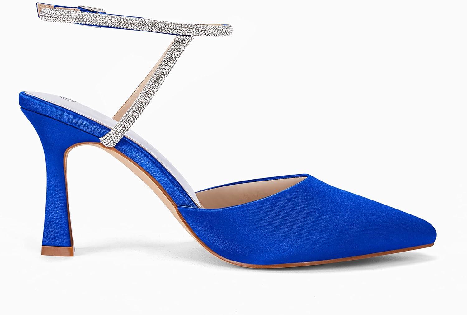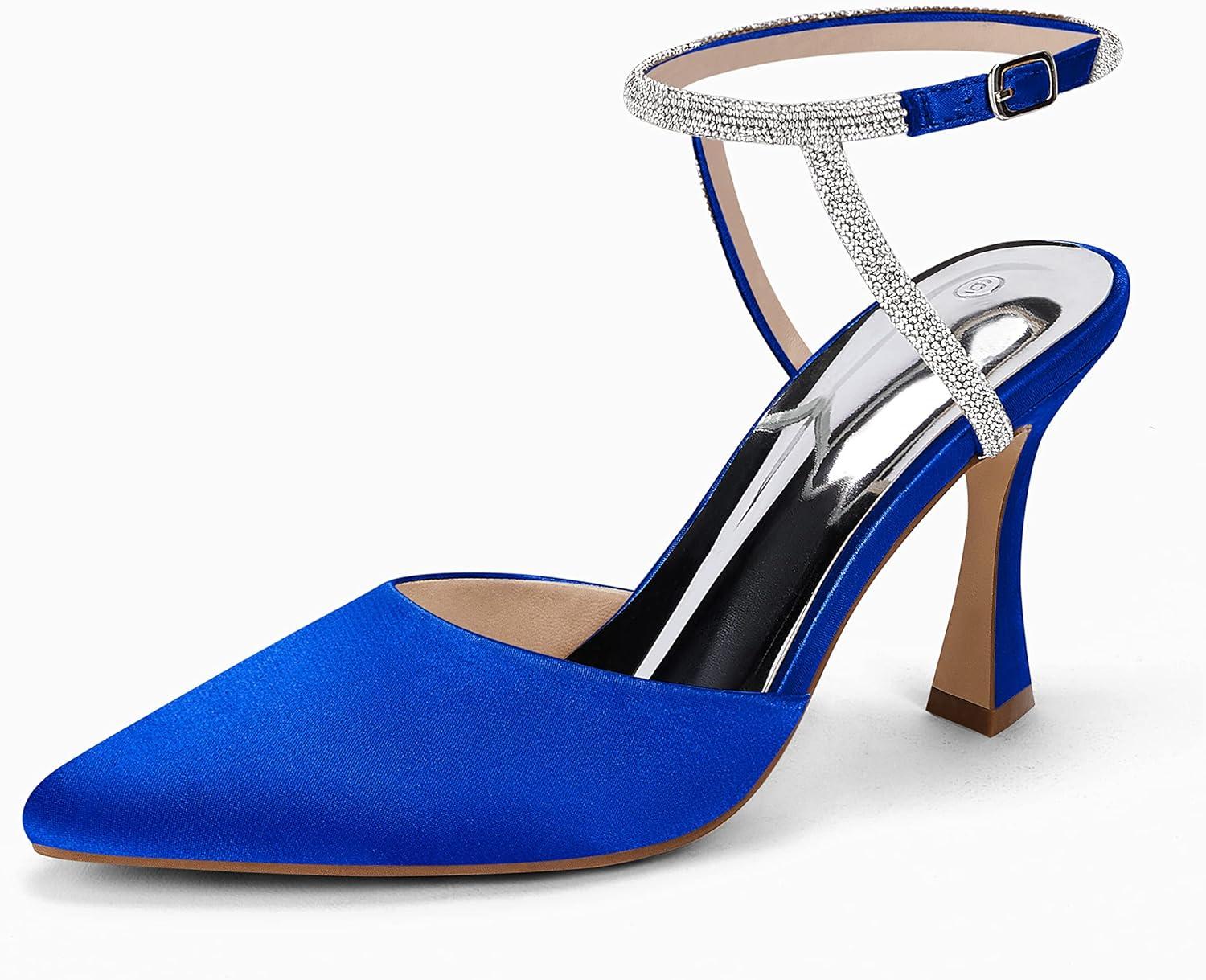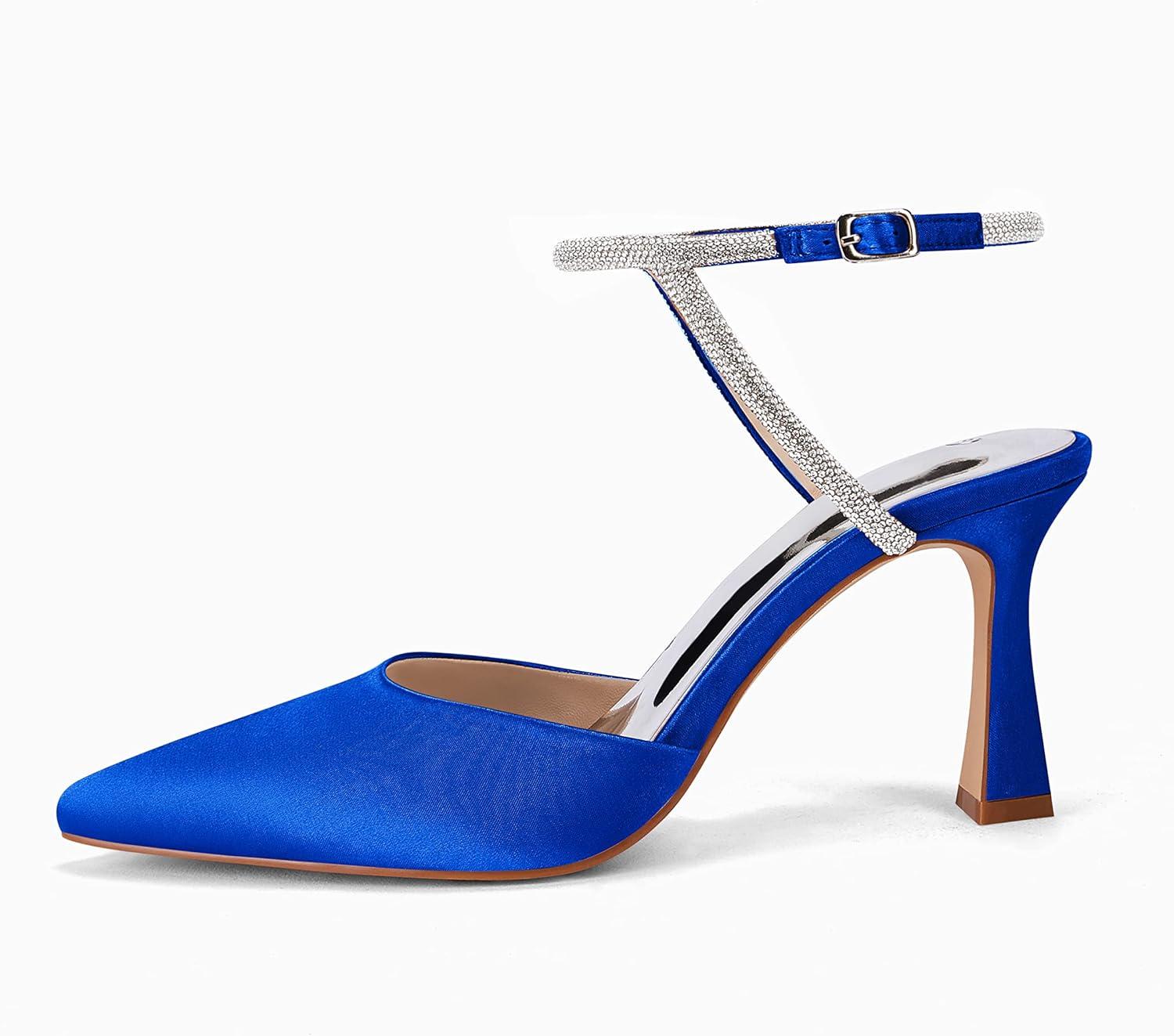 Coutgo Women Rhinestone Heels Kitten High Satin Pumps Pointed Toe Sparkly Sexy Wedding Dress Shoes(Royal Blue)