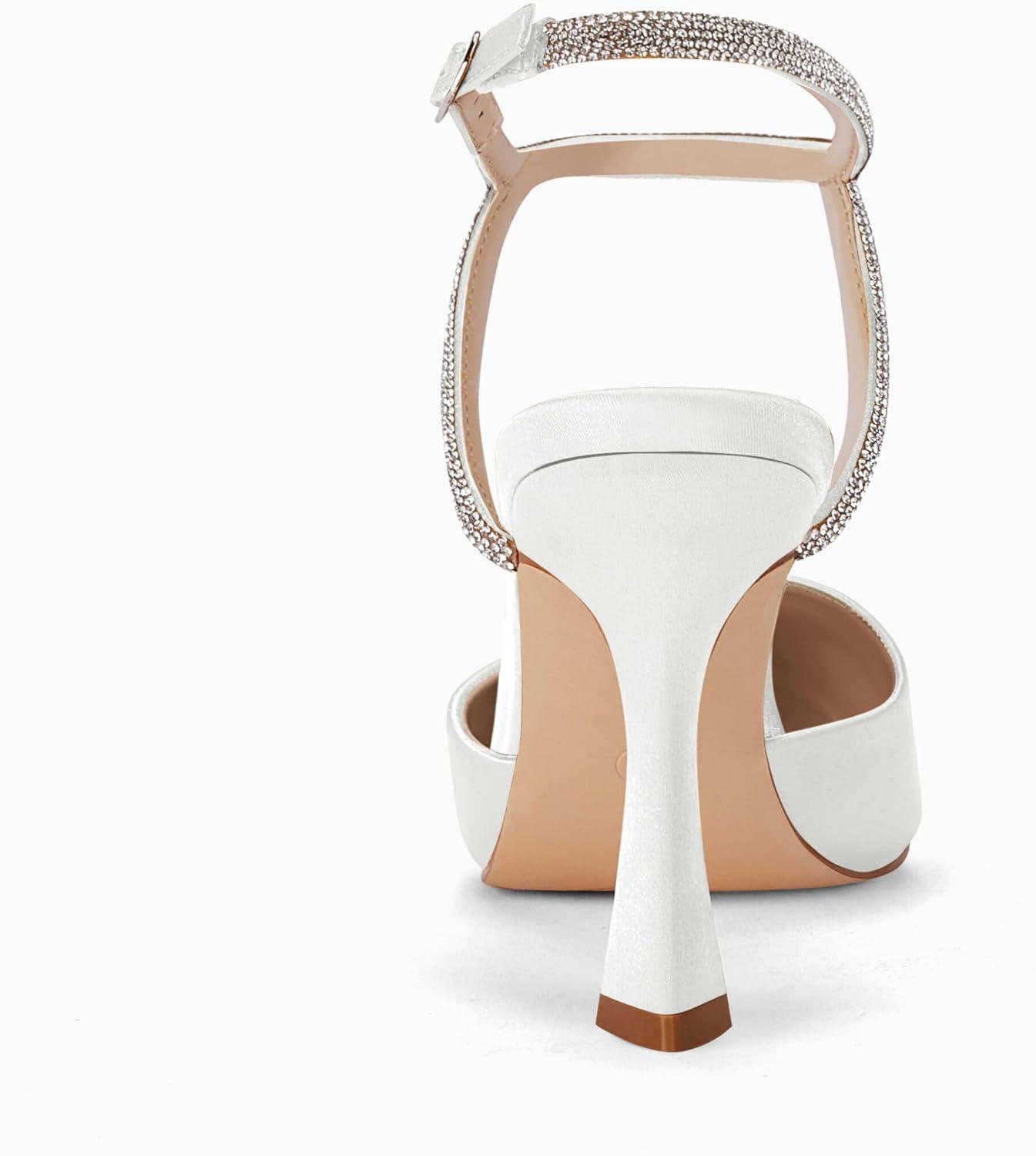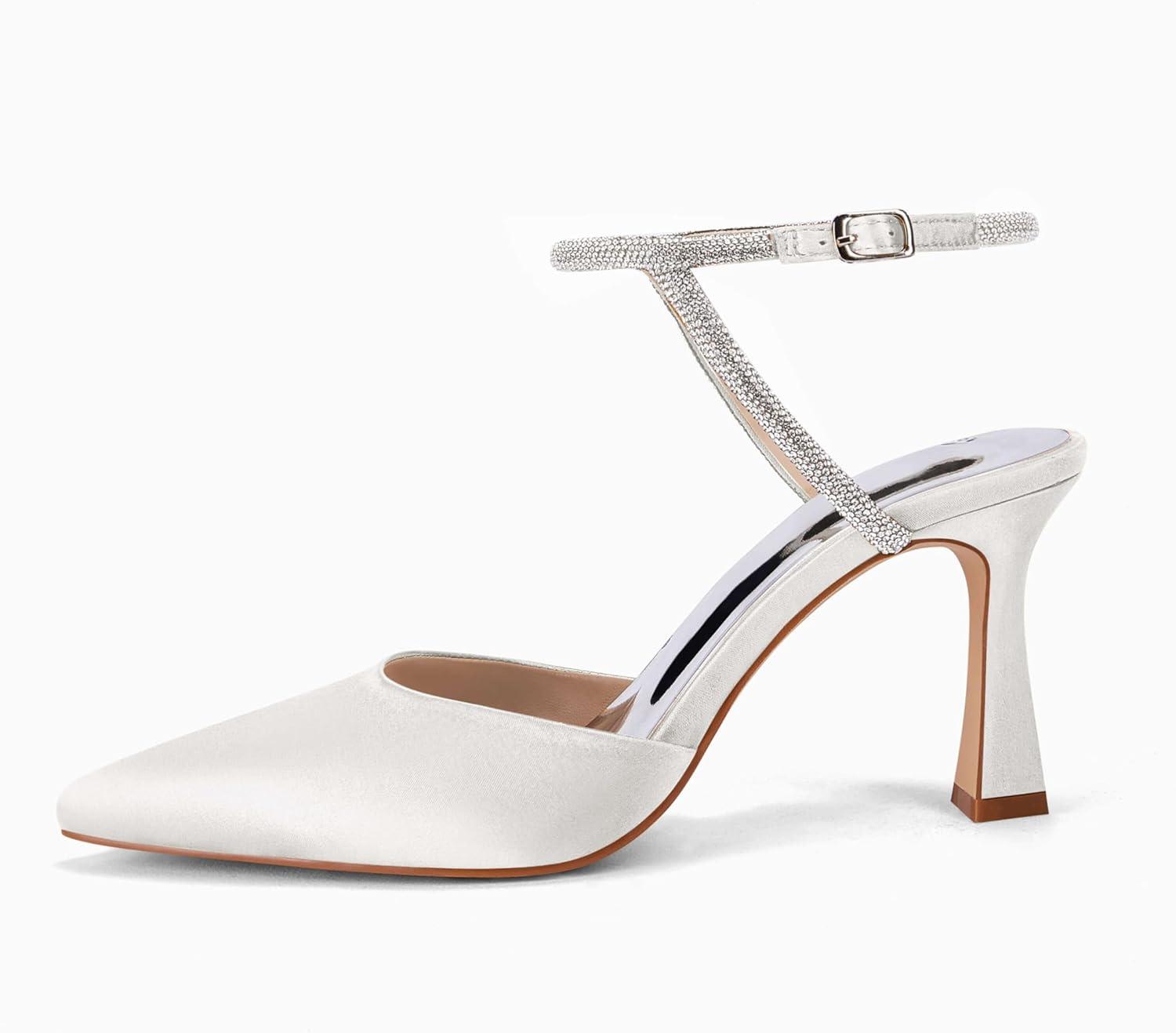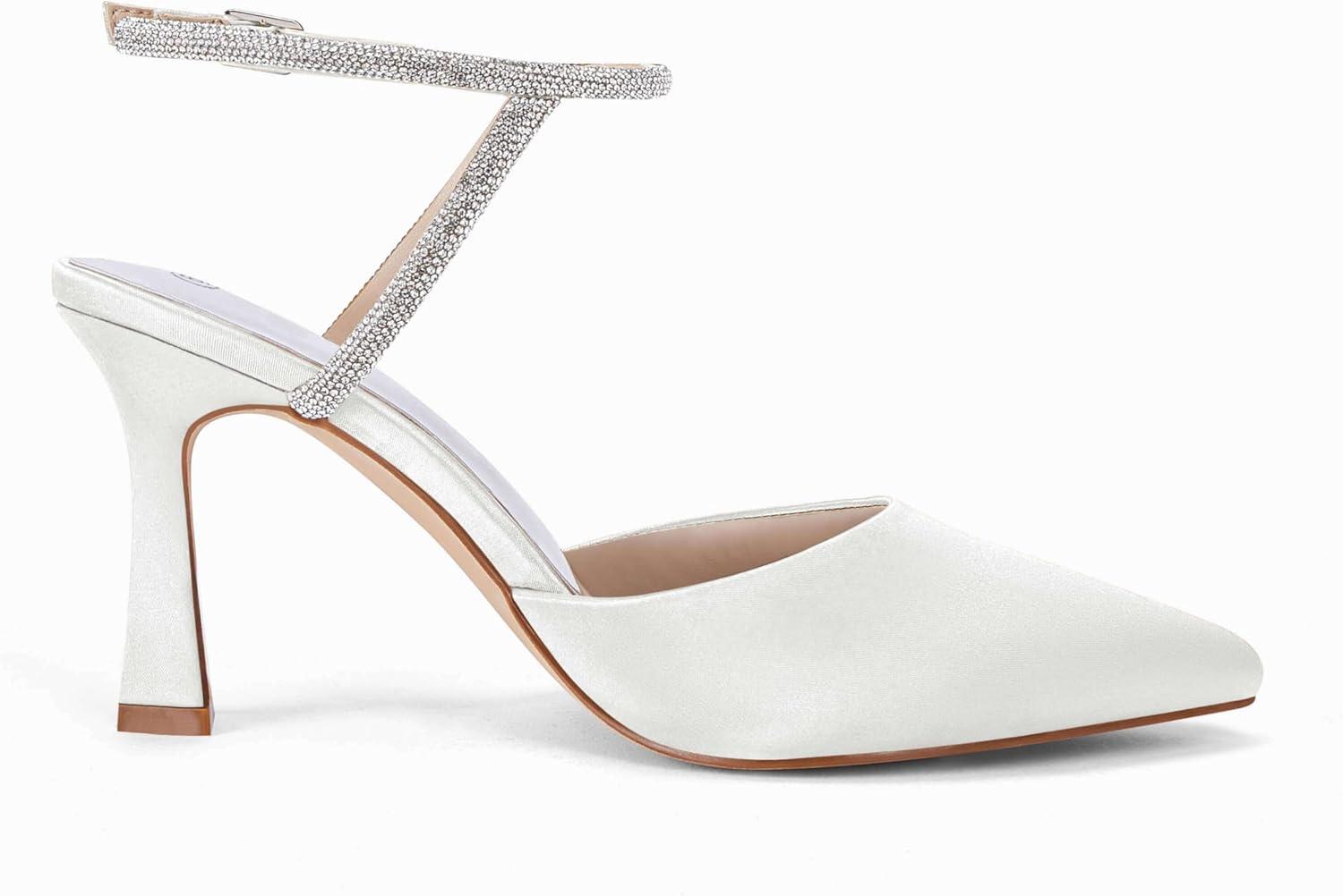Coutgo Women Rhinestone Heels Kitten High Satin Pumps Pointed Toe Sparkly Sexy Wedding Dress Shoes(White)