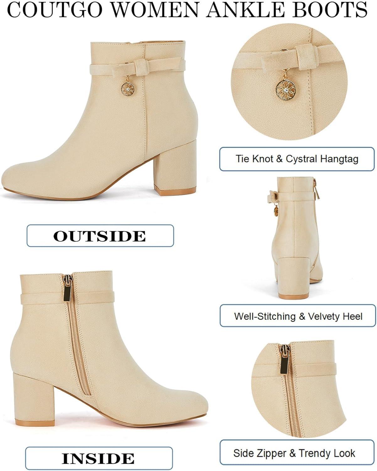 Coutgo Women’s Ankle Boots Chunky Block Low Heel Vintage Tie Knot Booties Shoes with Side Zipper(Beige)