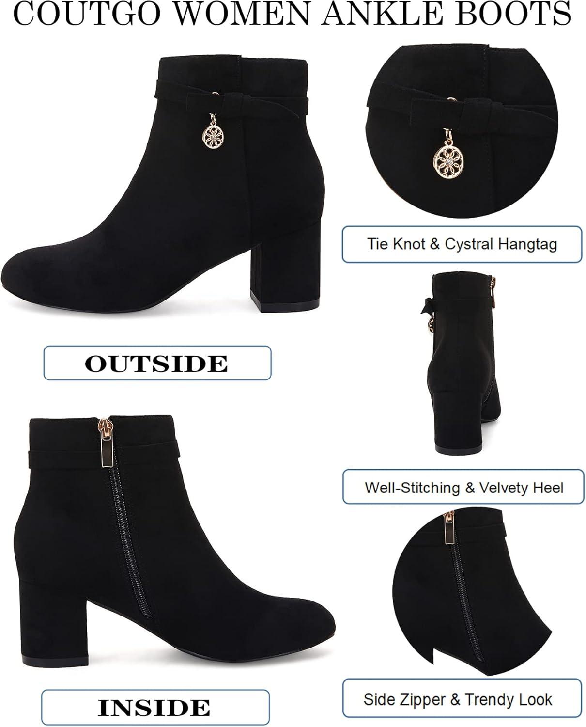 Coutgo Women’s Ankle Boots Chunky Block Low Heel Vintage Tie Knot Booties Shoes with Side Zipper(Black)