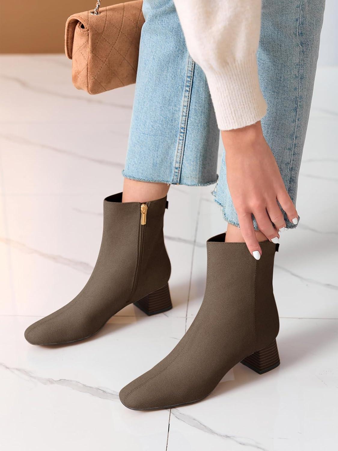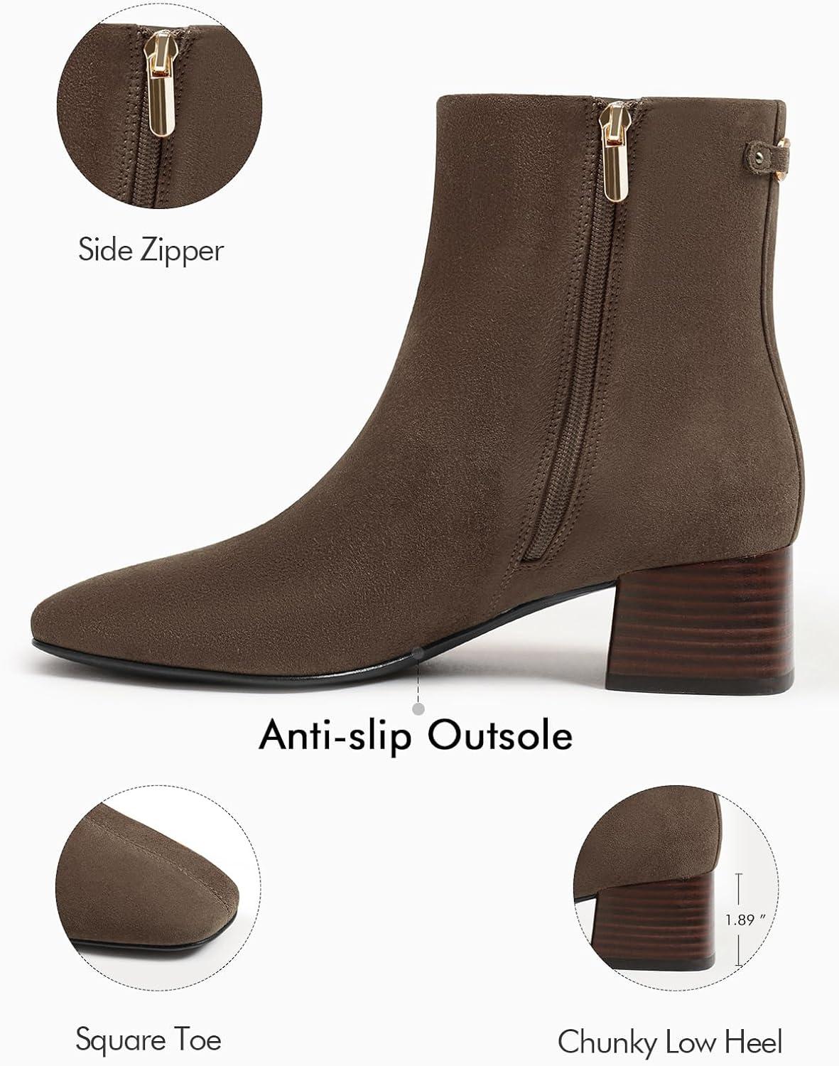 Coutgo Womens Ankle Boots Chunky Low Heel Square Toe Booties Side Zipper Winter Dress Shoes(Coffee)