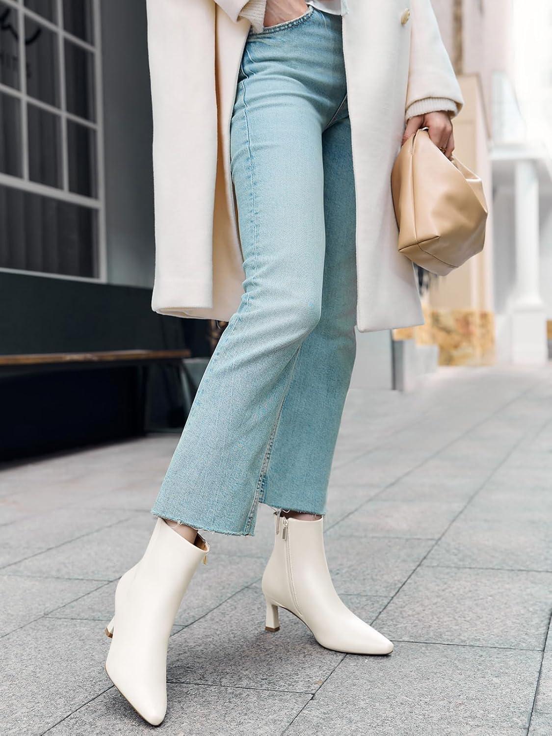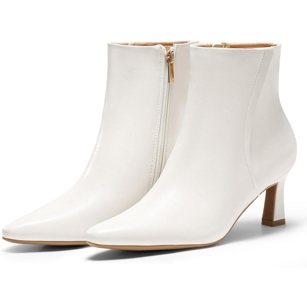 Coutgo Womens Ankle Boots Kitten Low Heel Closed Pointed Booties Side Zipper Winter Dress Shoes(Beige)