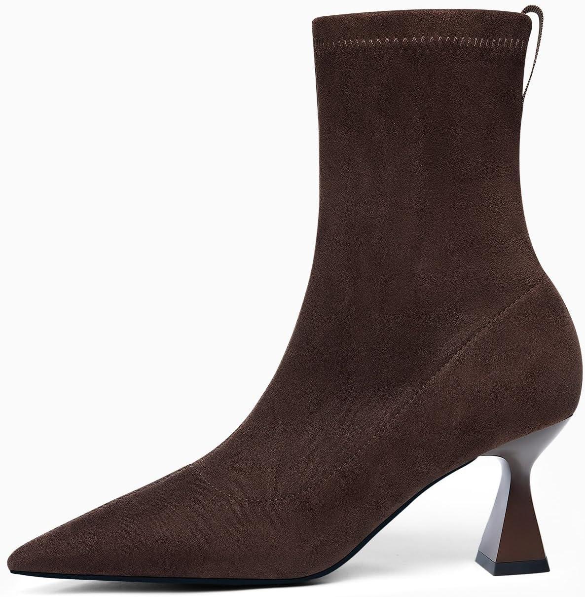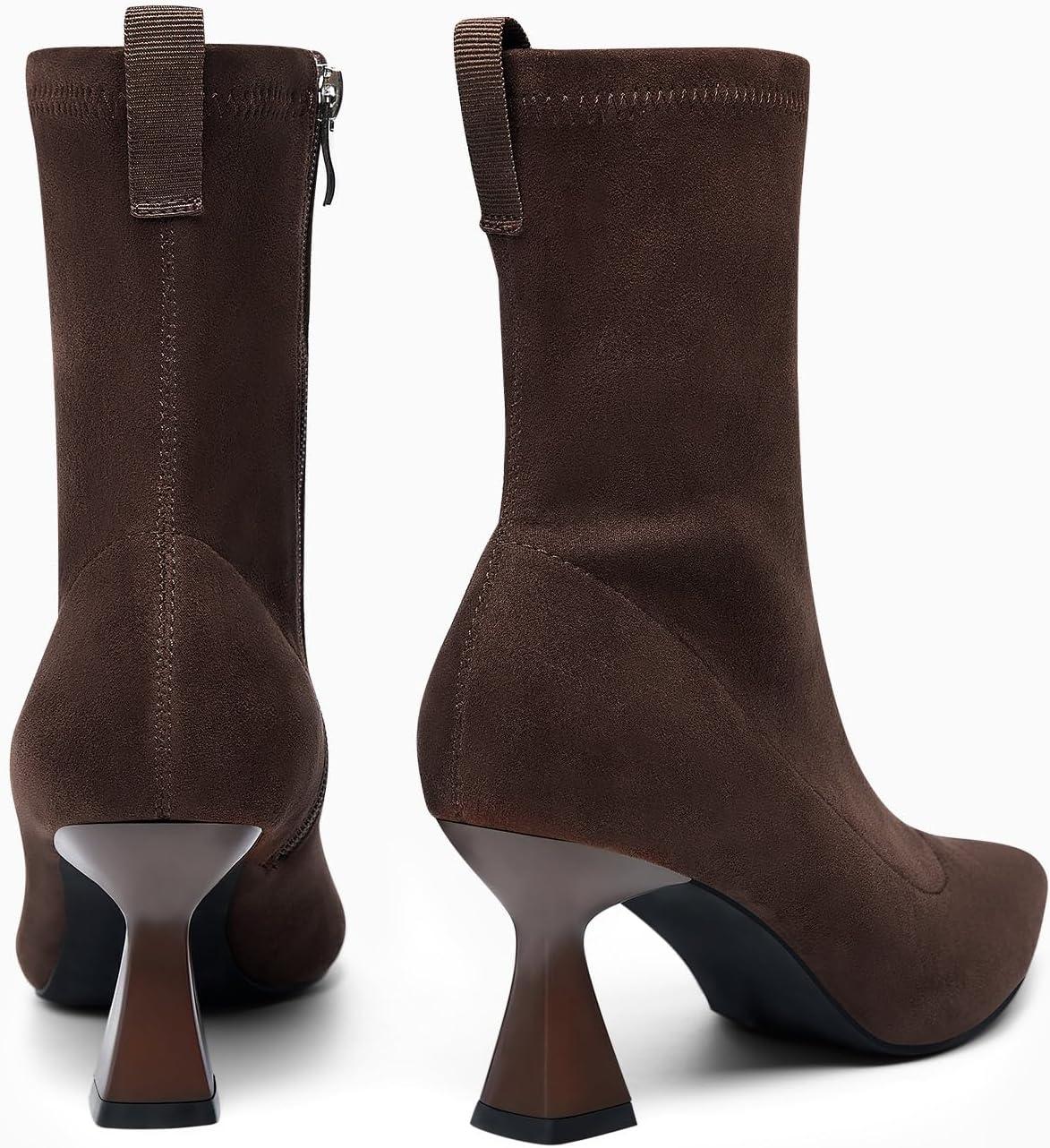 Coutgo Womens Ankle Boots Pointed Toe Low Kitten Heel Side Zipper Office Dress Fall Booties Shoes(Chocolate Suede)