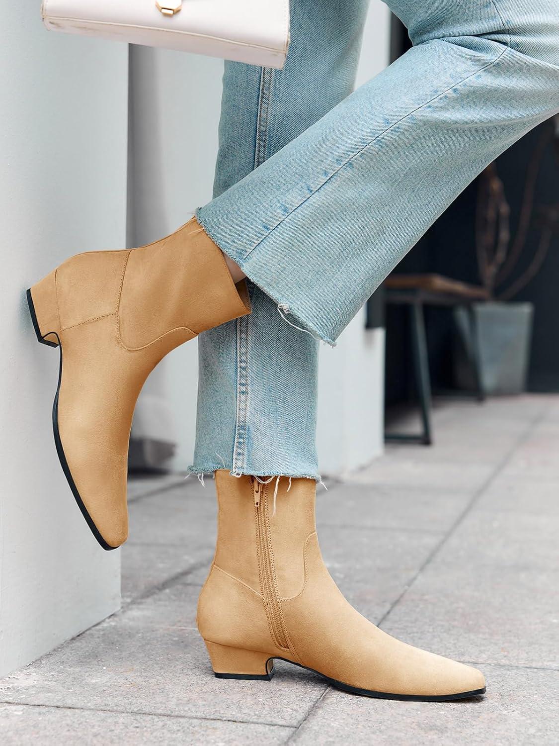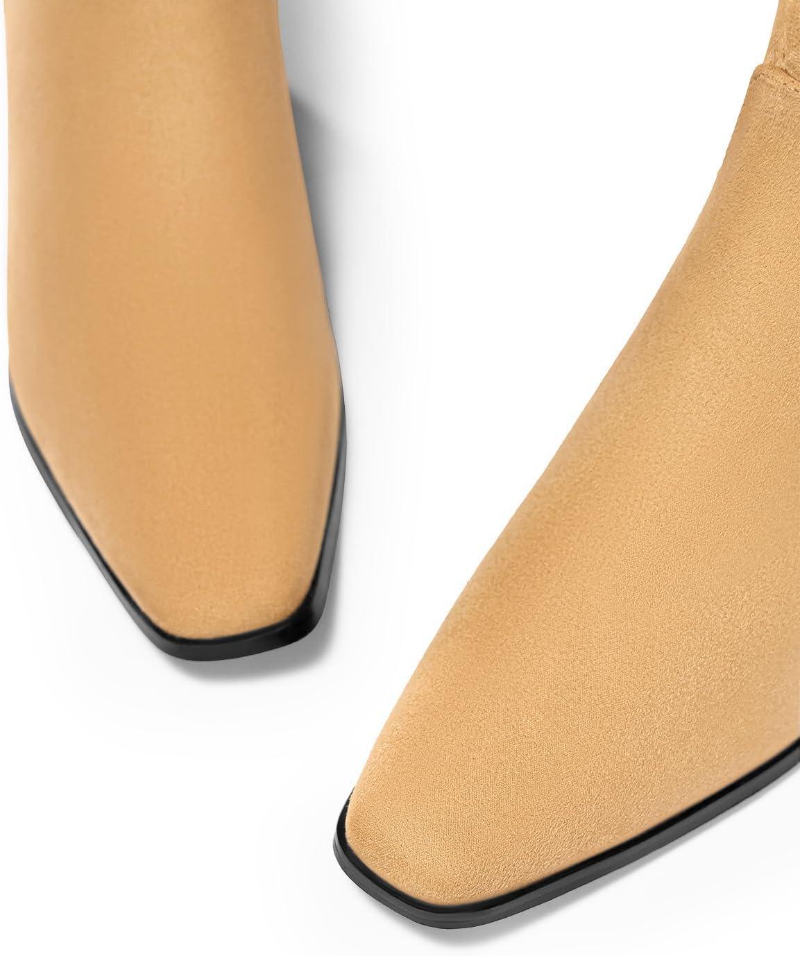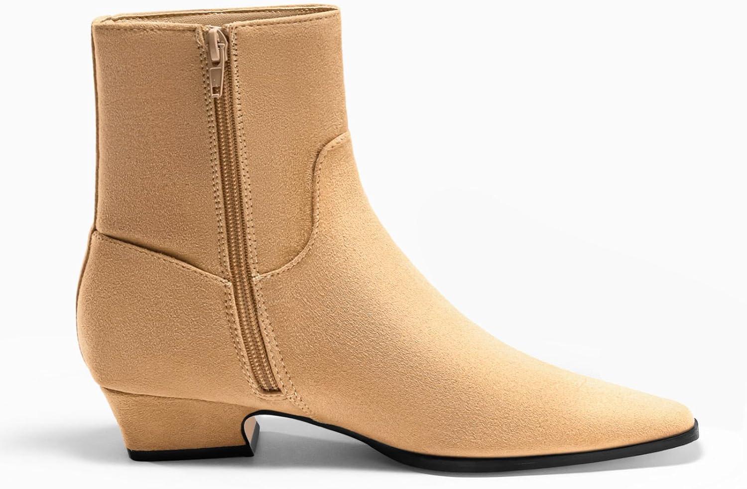 Coutgo Womens Booties Low Heel Ankle Boots Square Pointed Toe Chunky Heel Side Zipper Dressy Fall Boots Shoes(Camel)