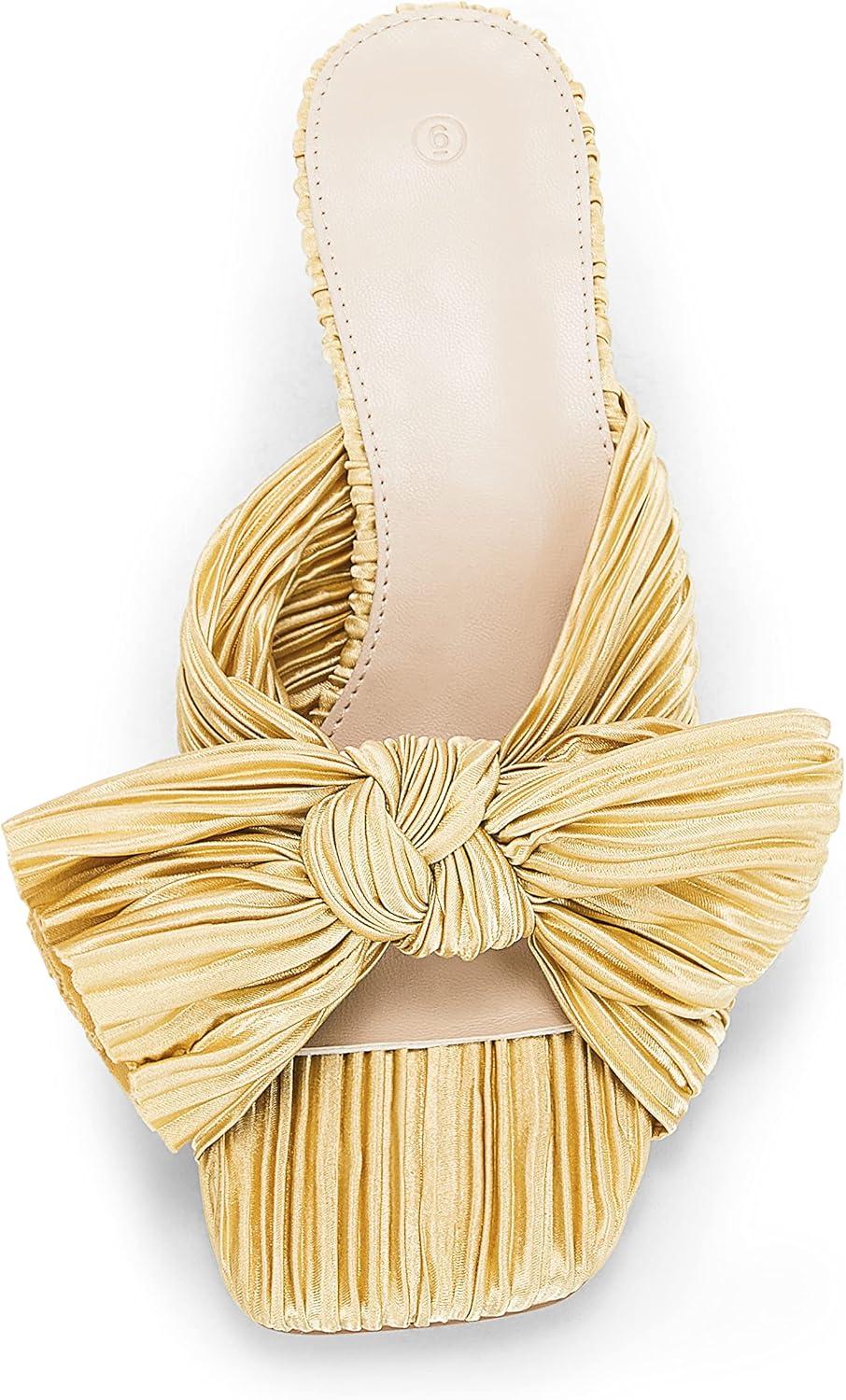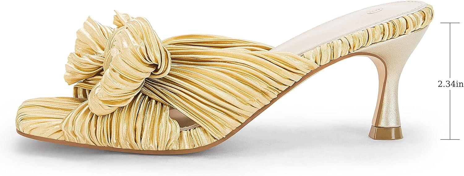 Coutgo Womens Bow Heeled Sandals Pleated Bowknot Heels Open Square Toe Cute Kitten Heel Mules Slip On Wedding Dress Shoes(Gold)