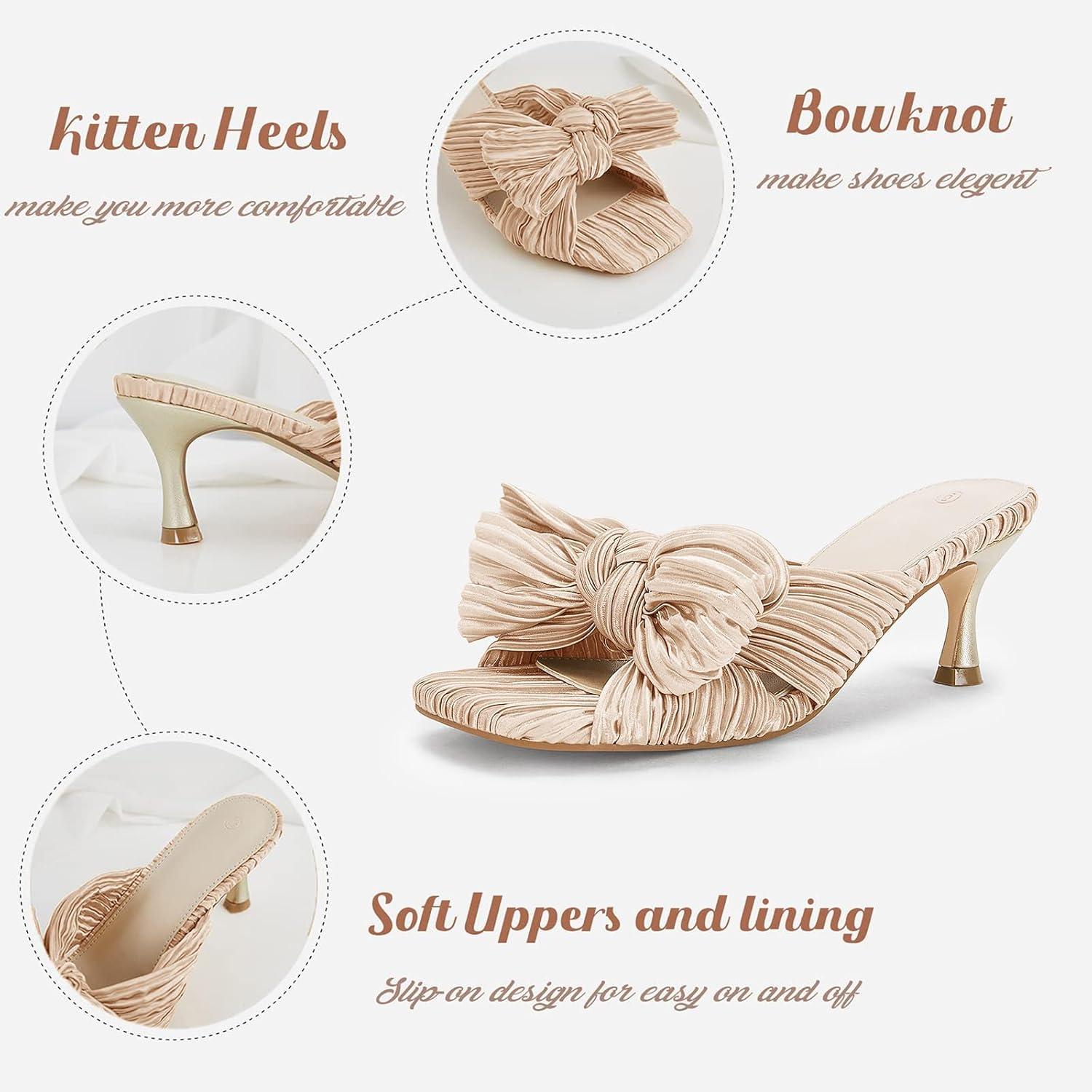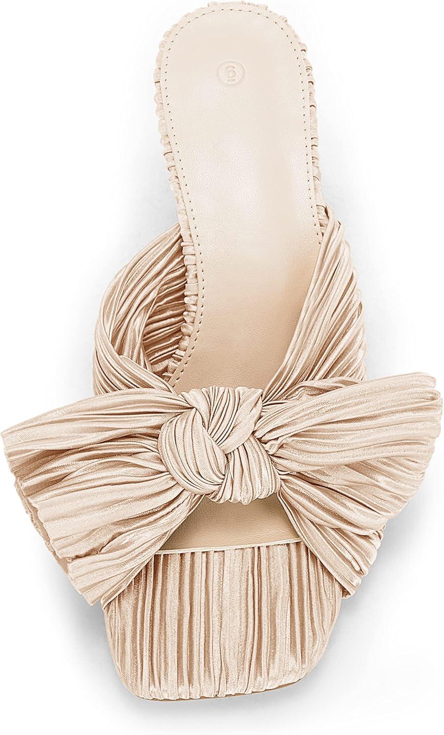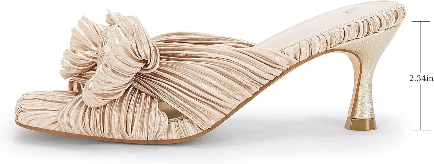 Coutgo Womens Bow Heeled Sandals Pleated Bowknot Heels Open Square Toe Cute Kitten Heel Mules Slip On Wedding Dress Shoes(Nude)