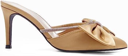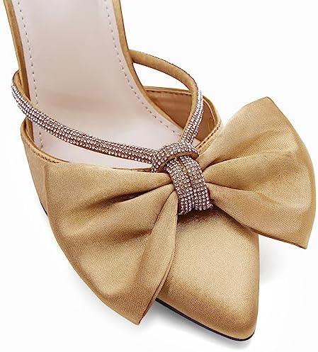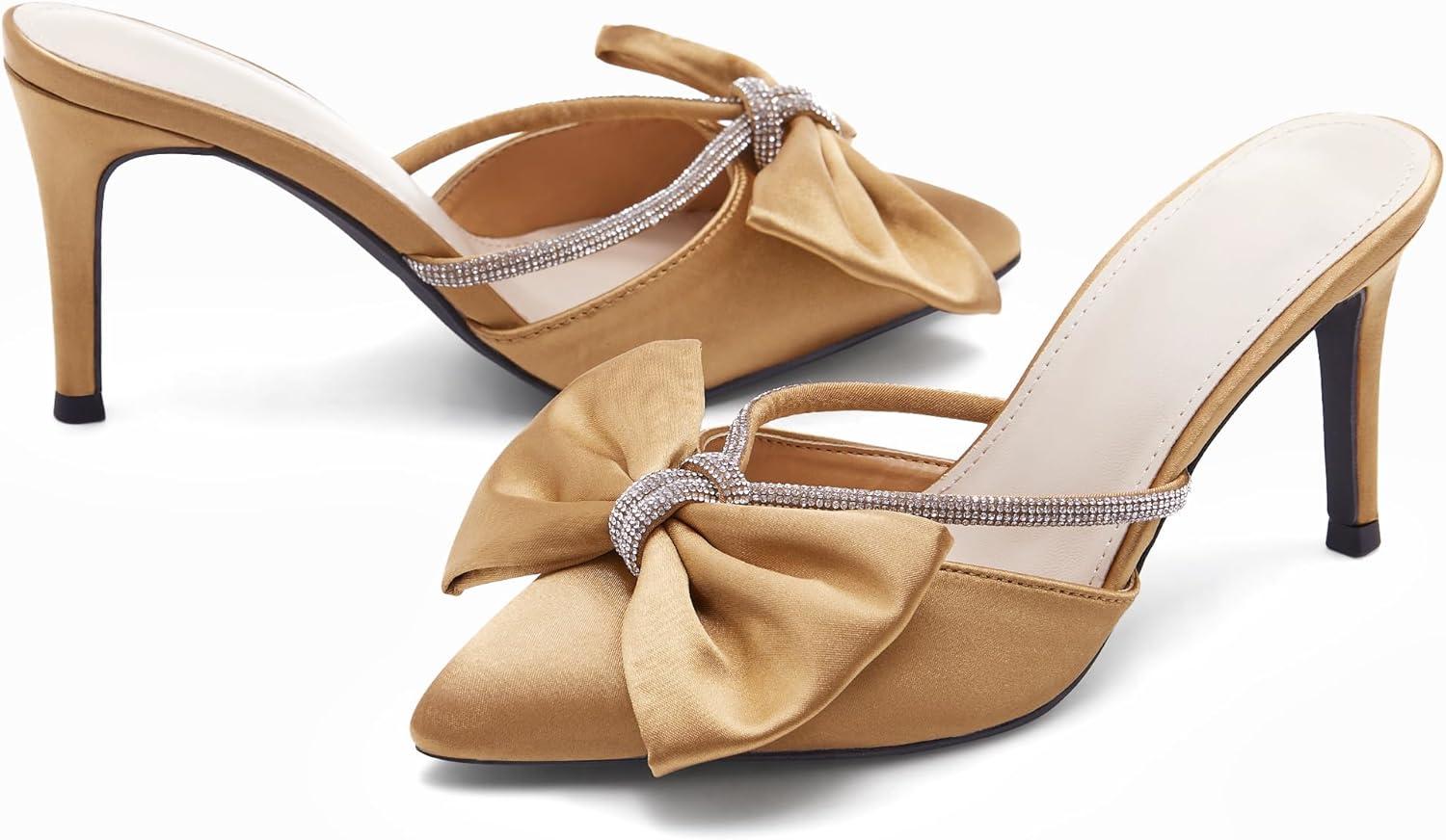 Coutgo Womens Bow Heels Mules Pointed Closed Toe Sandals Rhinestone Satin Backless Wedding Shoes(Brown)