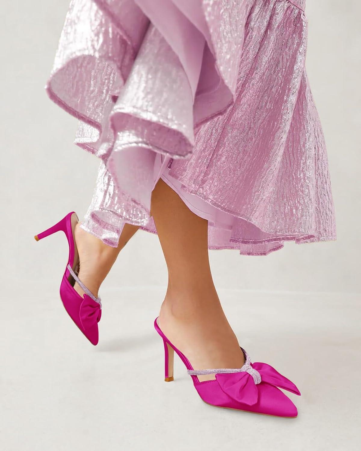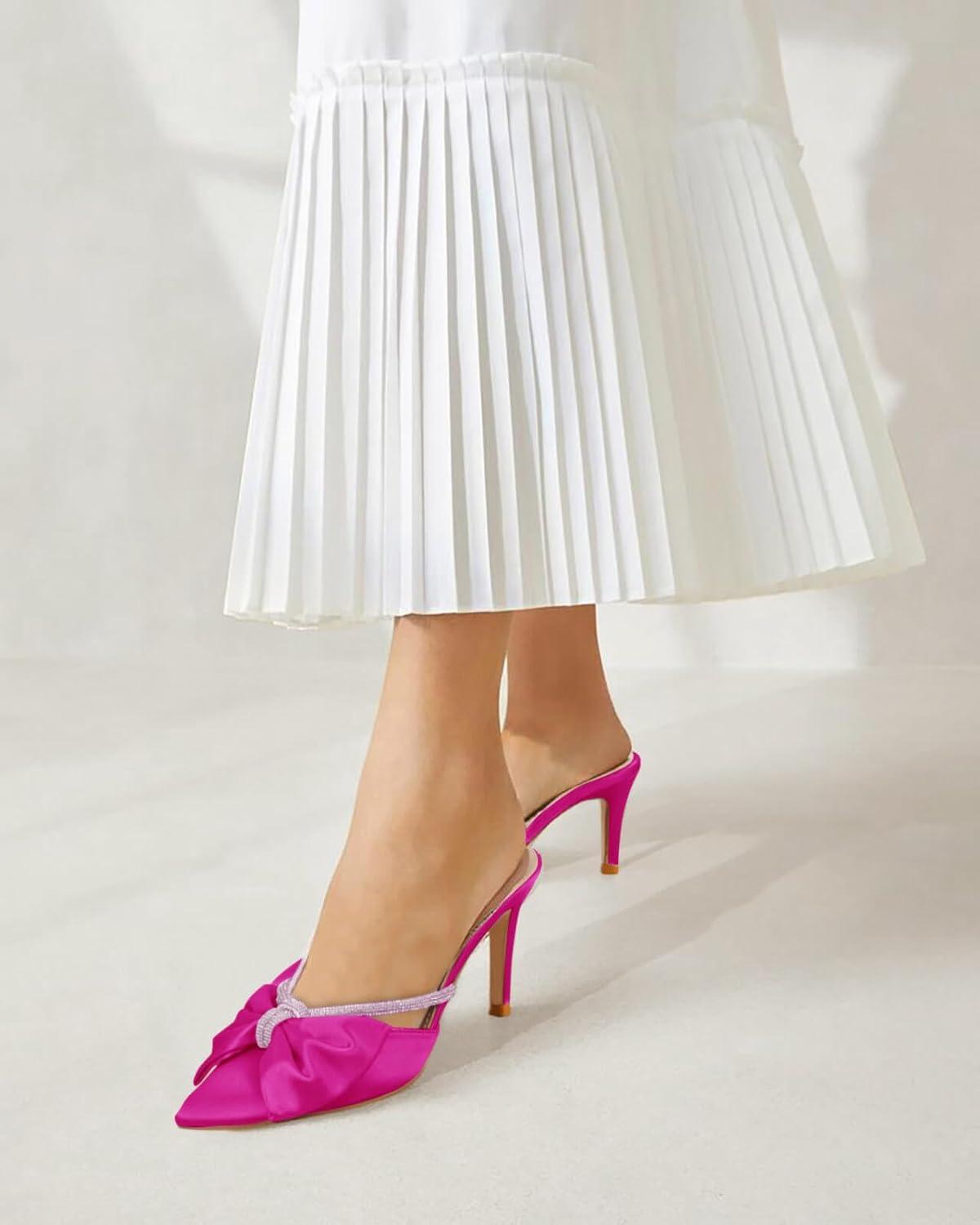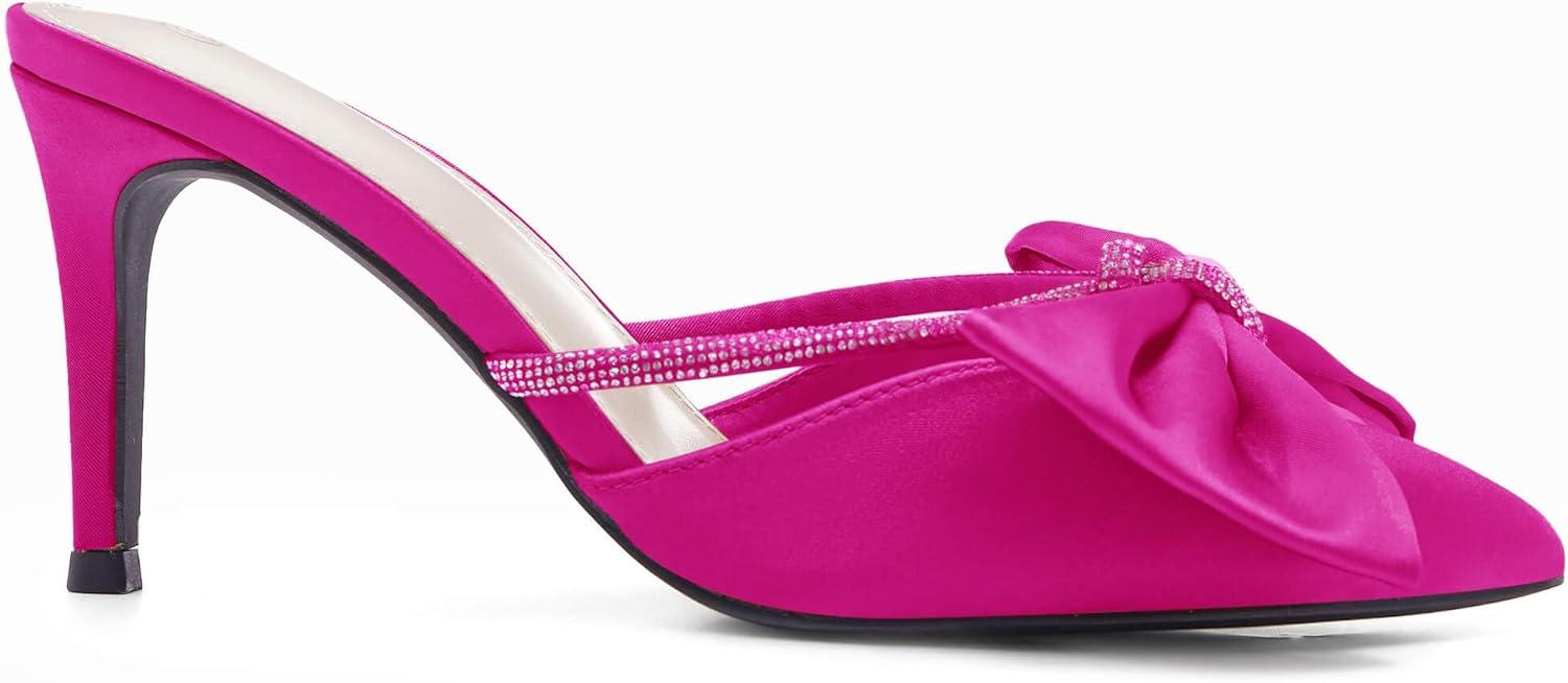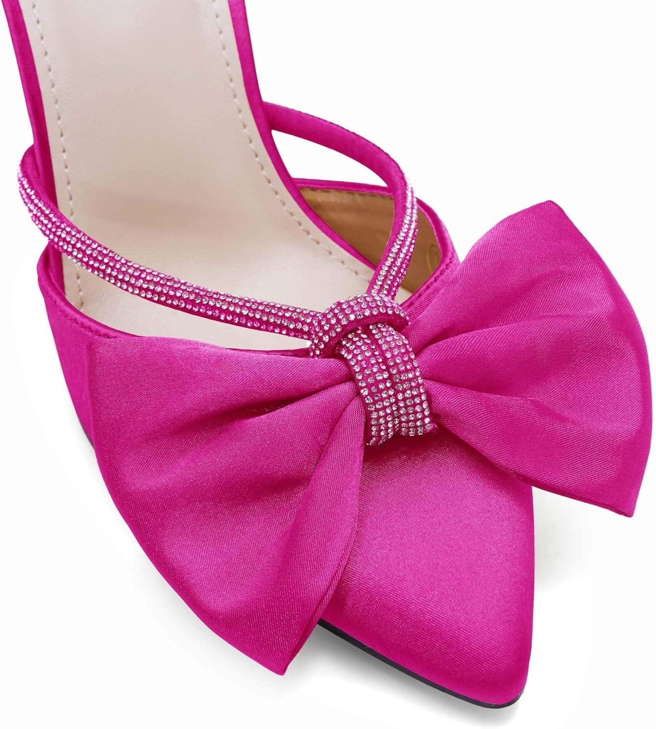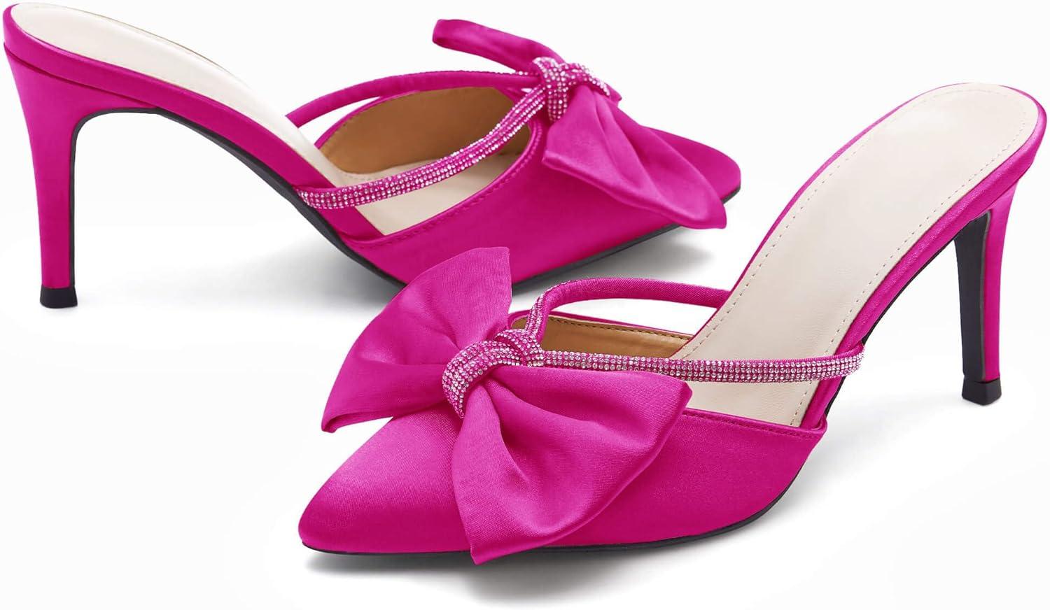 Coutgo Womens Bow Heels Mules Pointed Closed Toe Sandals Rhinestone Satin Backless Wedding Shoes(Rose Red)