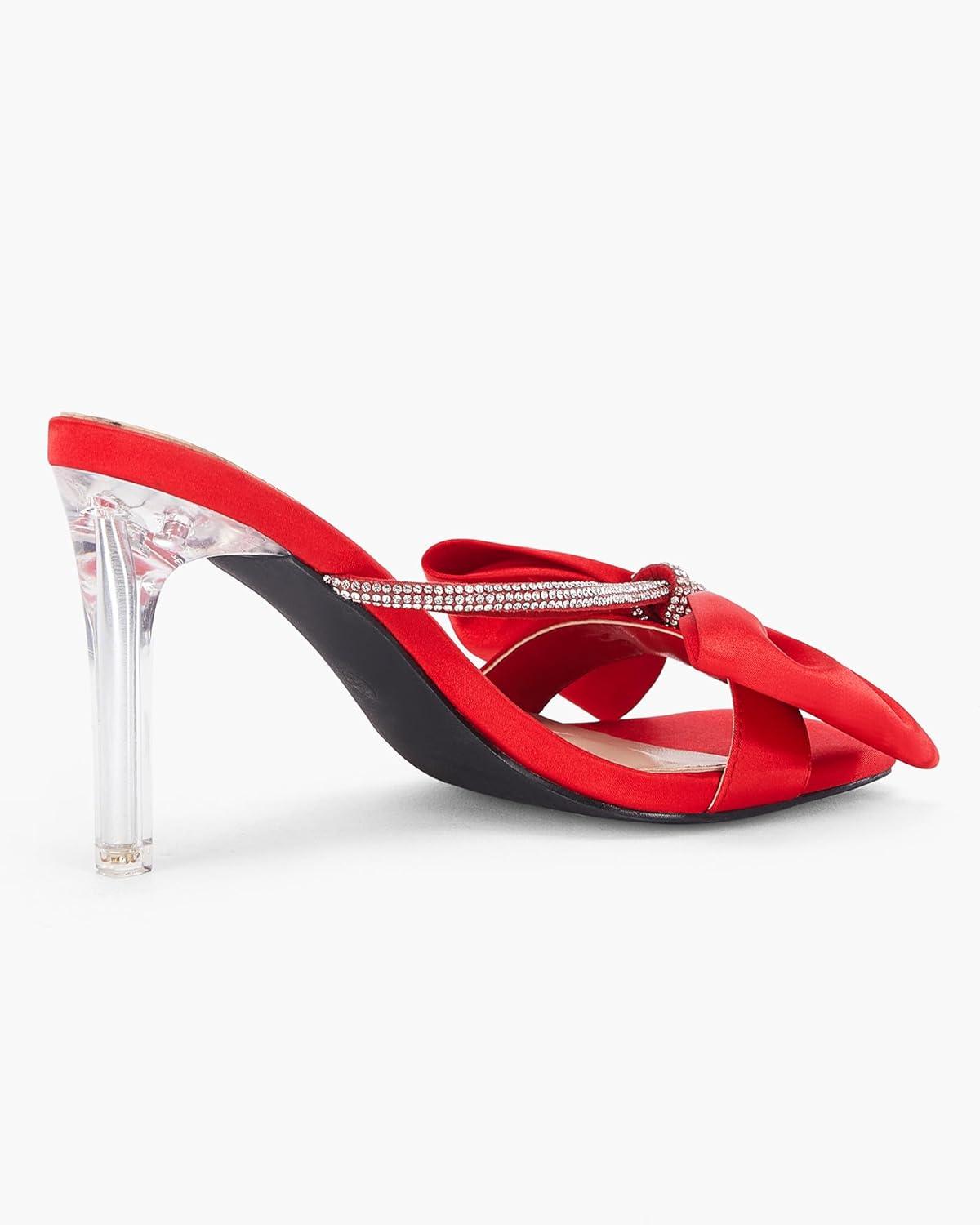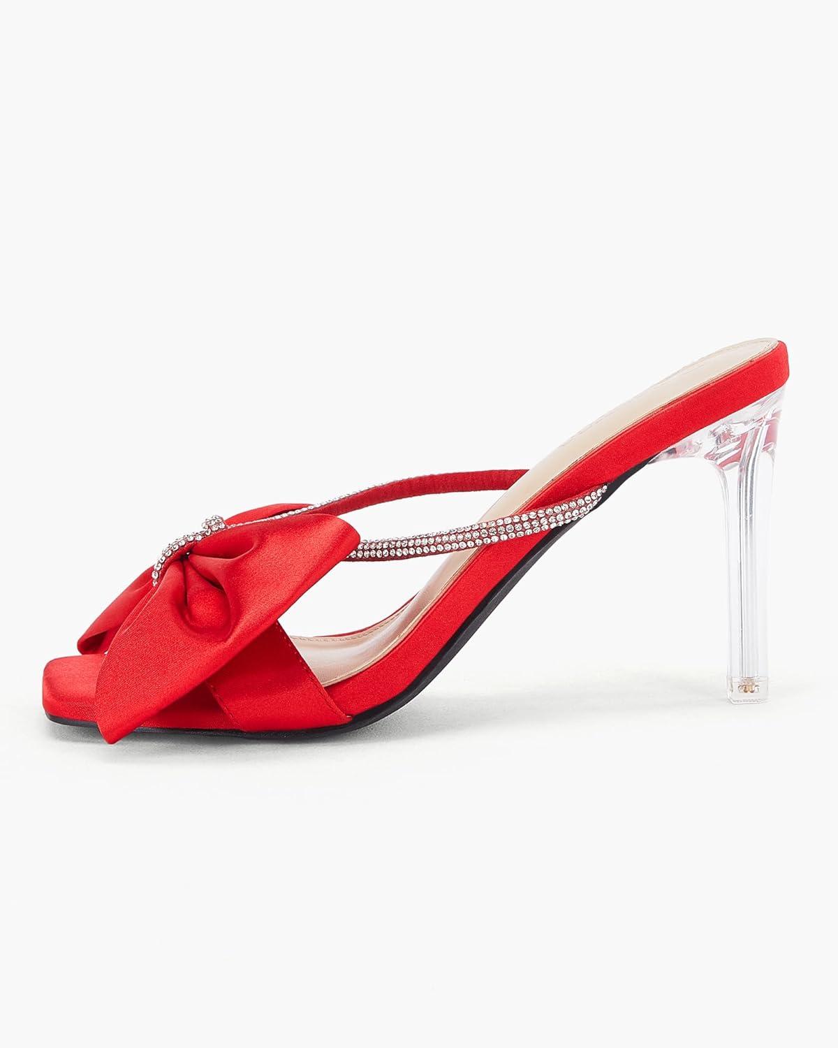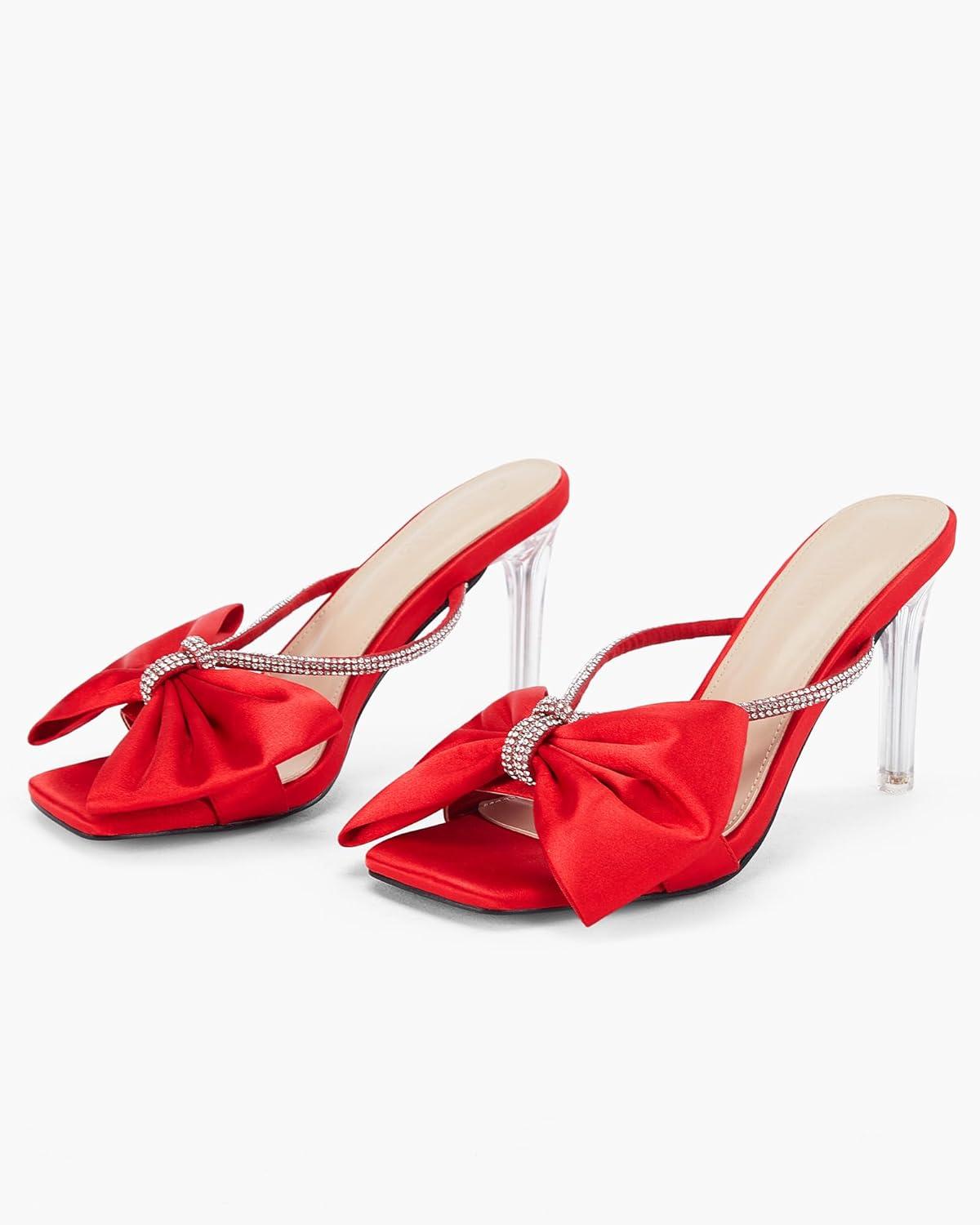 Coutgo Women’s Bow Heels Slip on Backless Mules Square Open Toe Heeled Sandals Rhinestone Stiletto Summer Dress Shoes, Red, Size 7