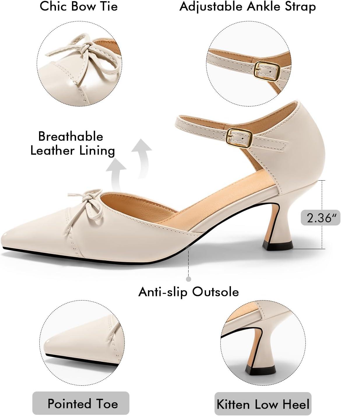 Coutgo Womens Bow Kitten Heels Low Heel Dress Shoes Closed Pointed Toe Ankle Strap D’Orsay Pumps(Beige)