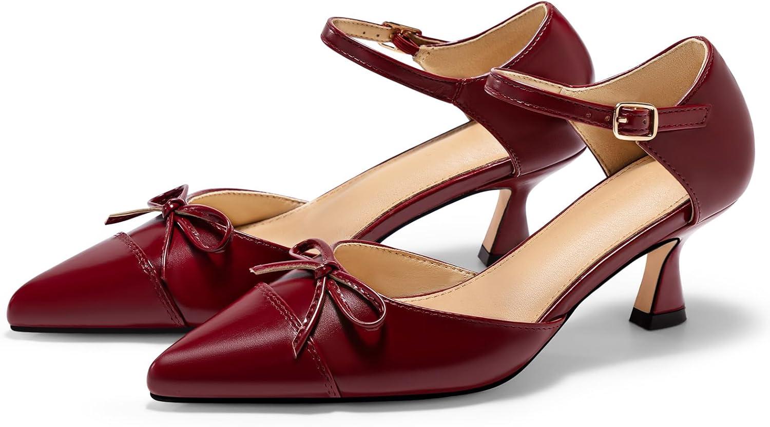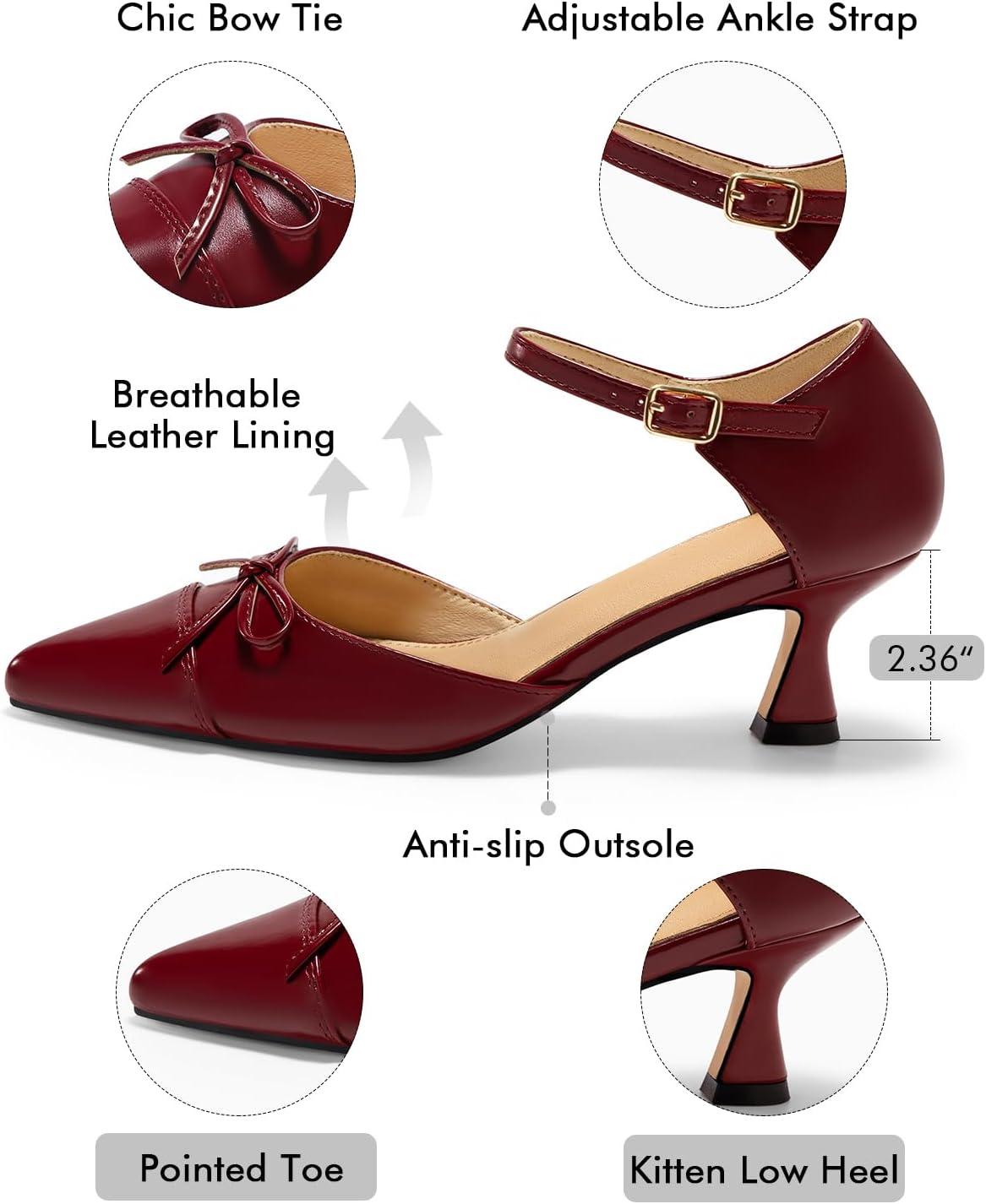 Coutgo Womens Bow Kitten Heels Low Heel Dress Shoes Closed Pointed Toe Ankle Strap D’Orsay Pumps(Burgundy)