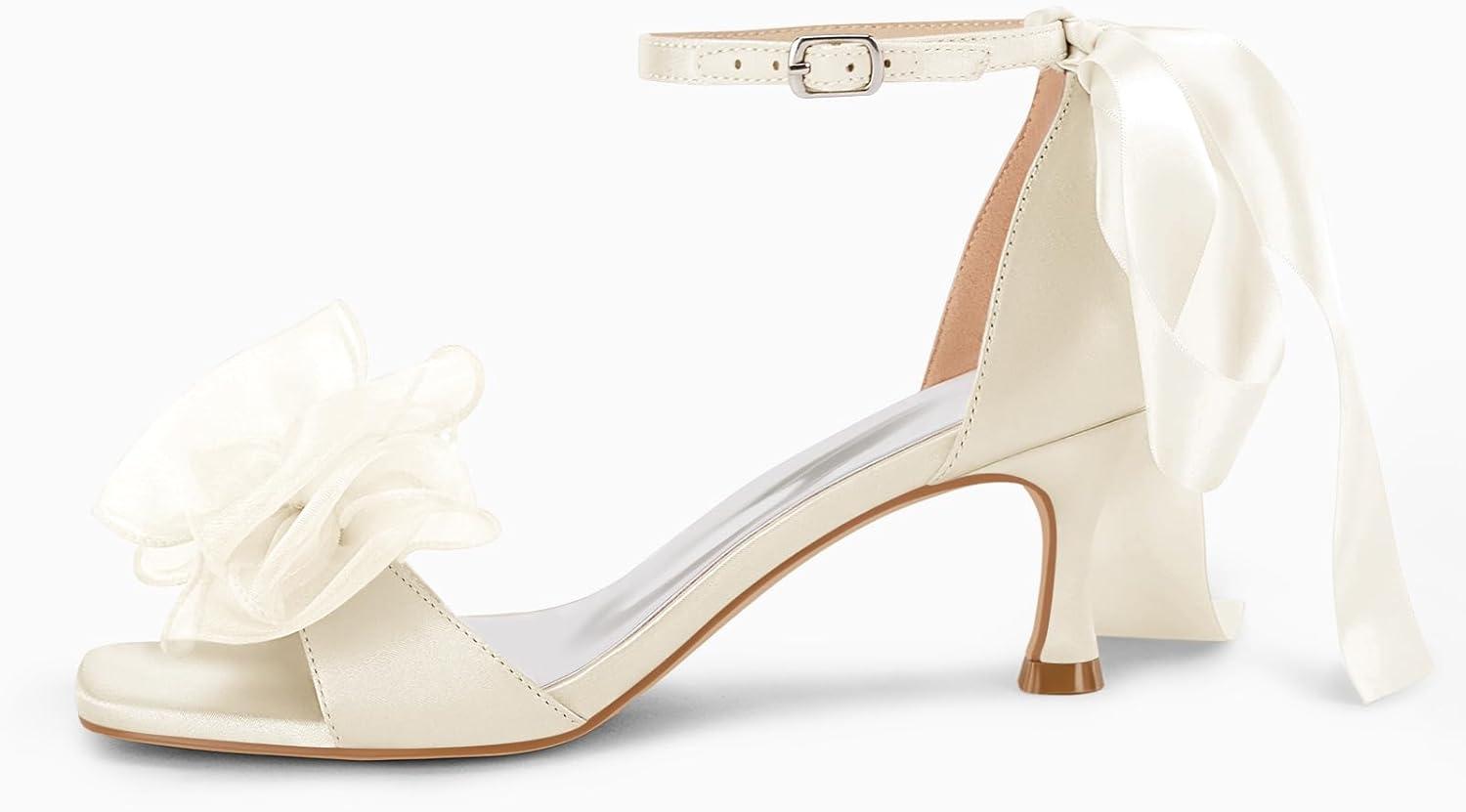 Coutgo Womens Bow Kitten Heels Sandals Square Open Toe Ankle Strap Satin Ribbon Wedding Dress Shoes(Champagne)