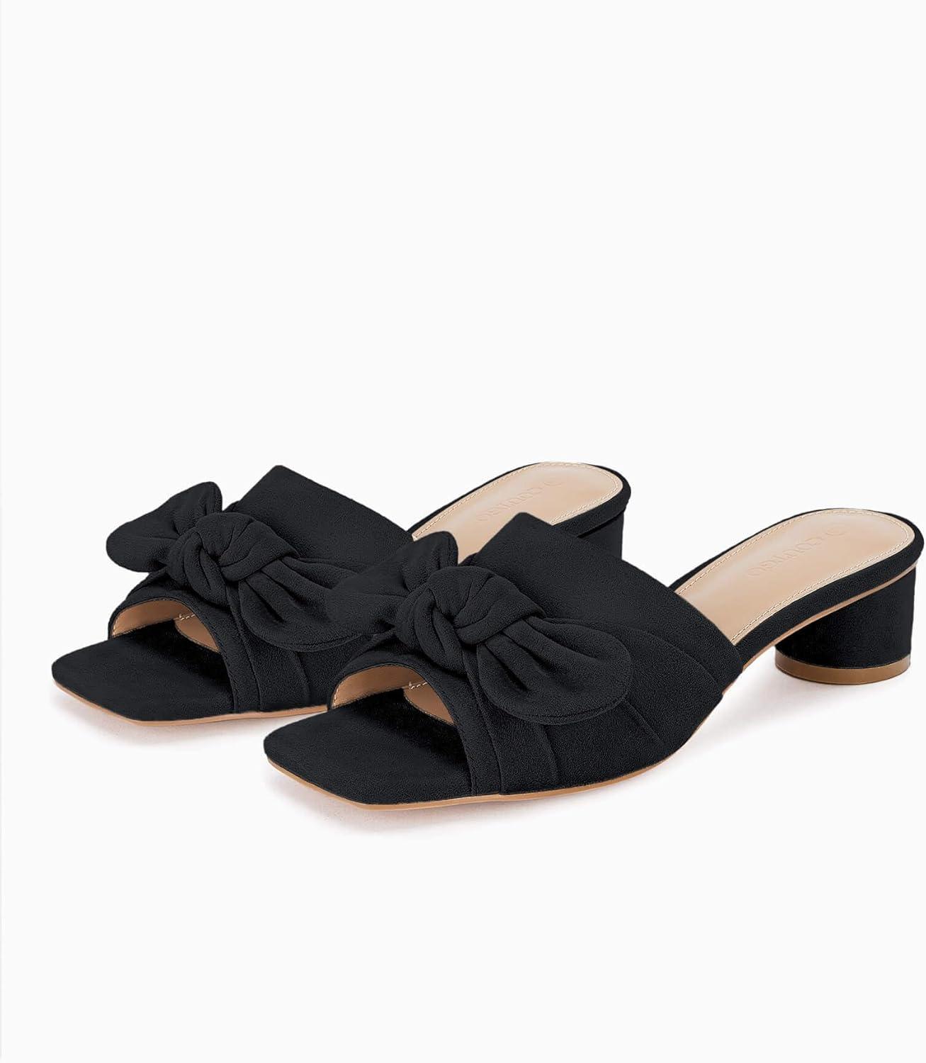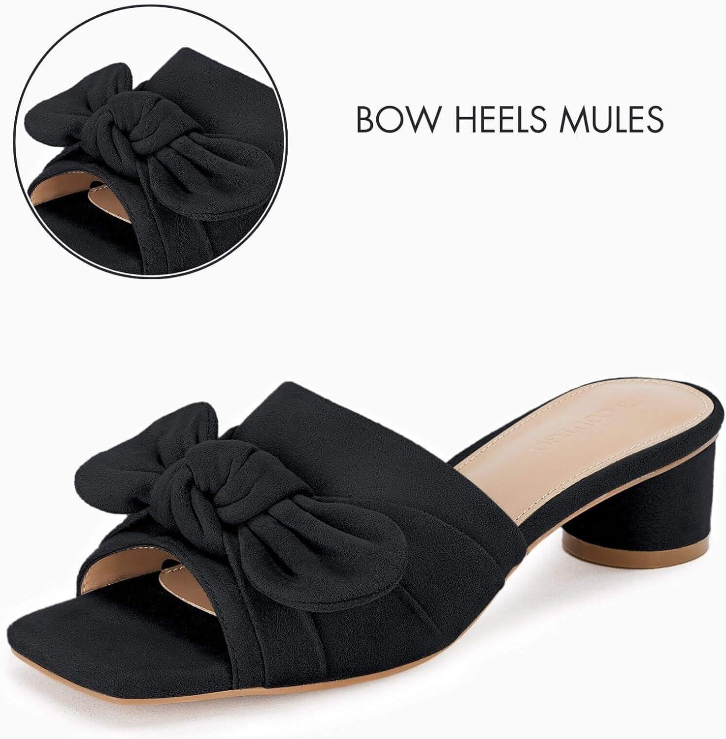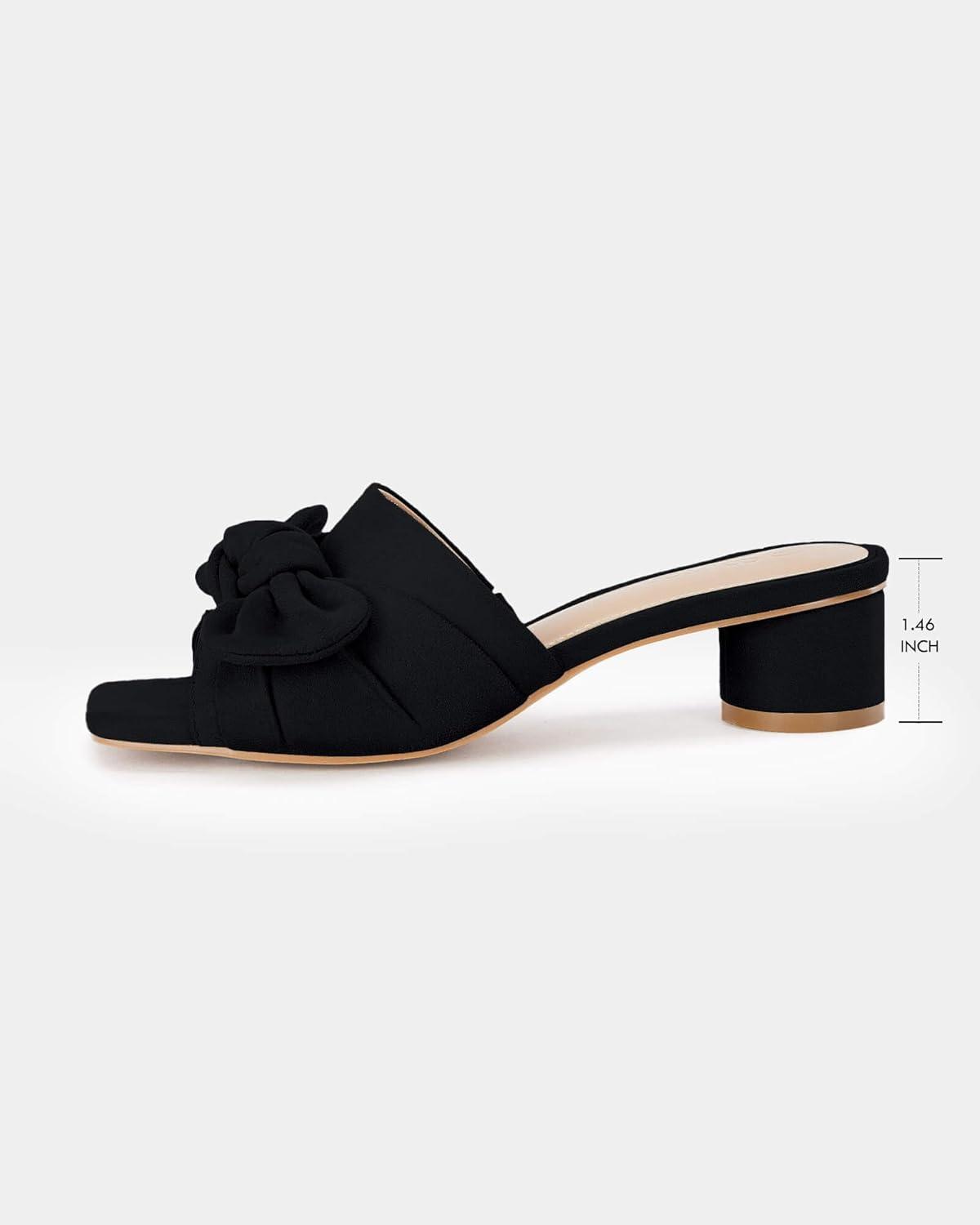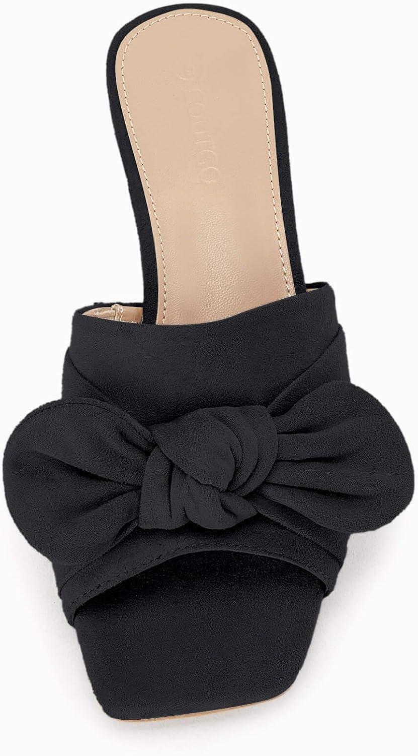 Coutgo Womens Bow Slides Sandals Wide Width Slip On Chunky Low Heels Square Open toe Elagant Summer Shoes(Black)