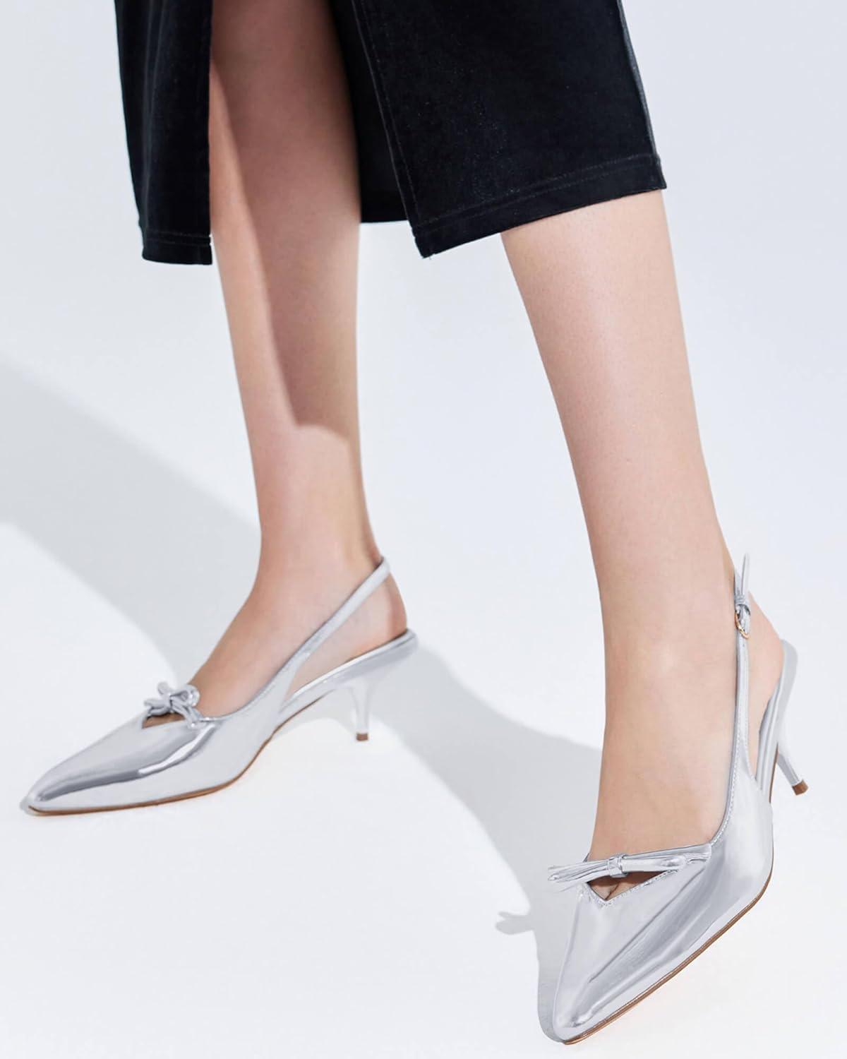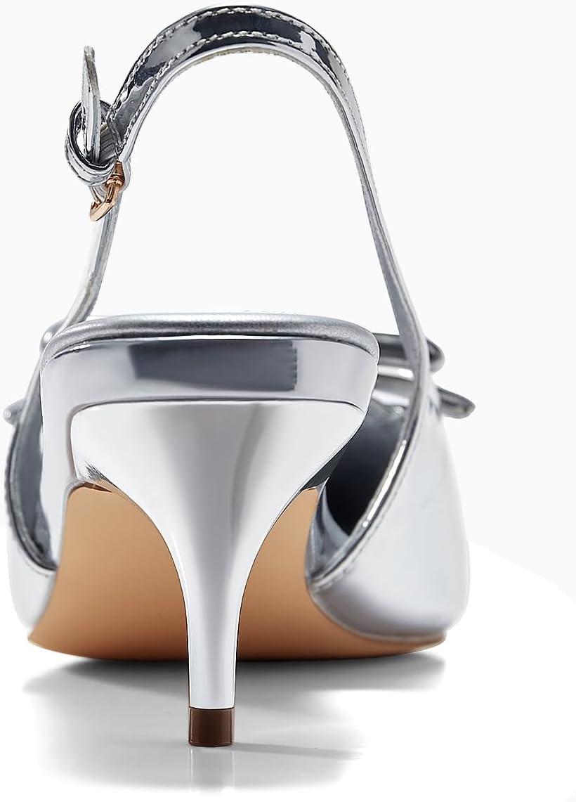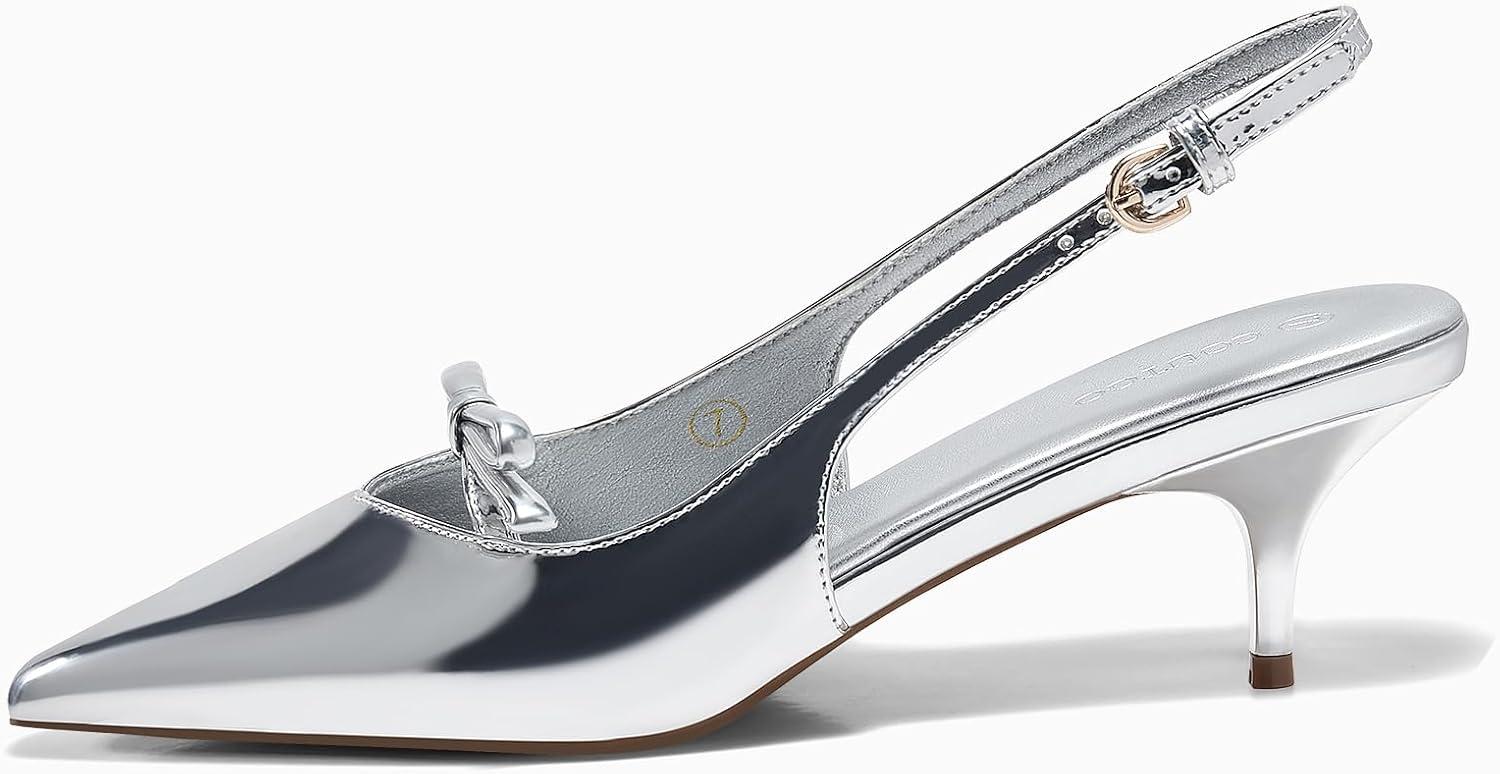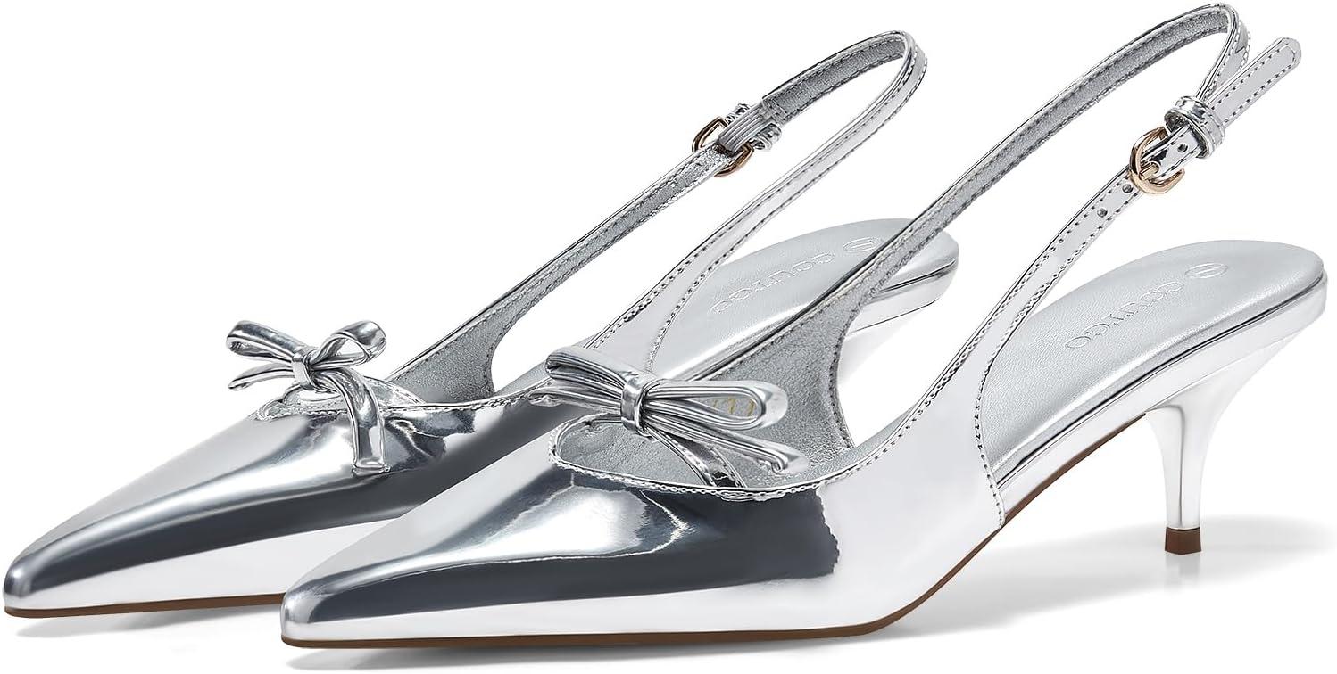 Coutgo Womens Bow Slingback Heels Low Kitten Heel Pumps Closed Pointed Toe Party Wedding Dress Shoes(Silver)