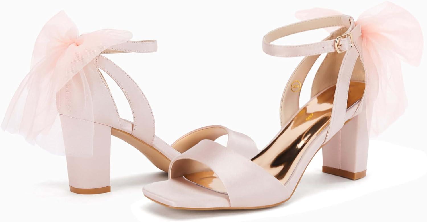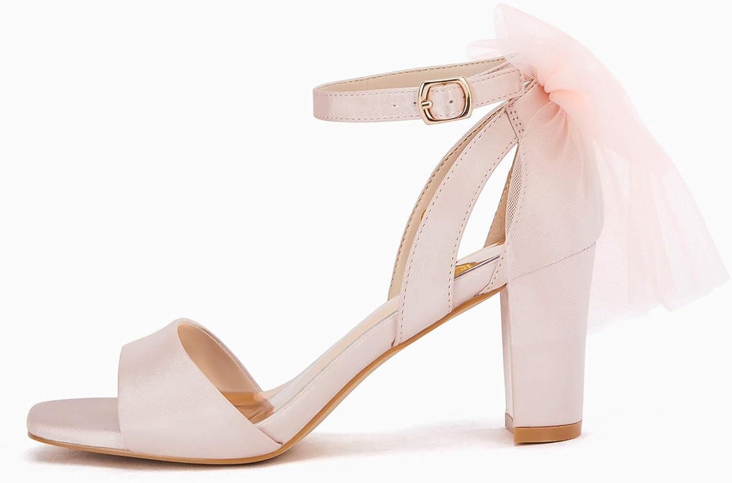 Coutgo Women’s Bow Tie Heeled Sandals Chunky Heels One Strap Satin Ankle Buckle Dress Wedding Shoes(Pink)