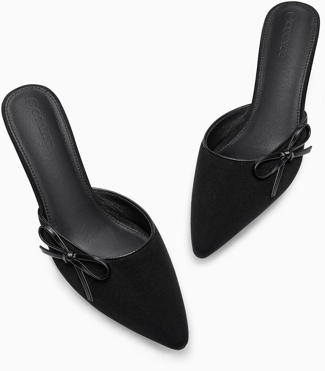 Coutgo Womens Bow Tie Mules Heels Two Tone Closed Pointed Toe Slip On Backless Wedding Dress Shoes Pumps(Cool Black)