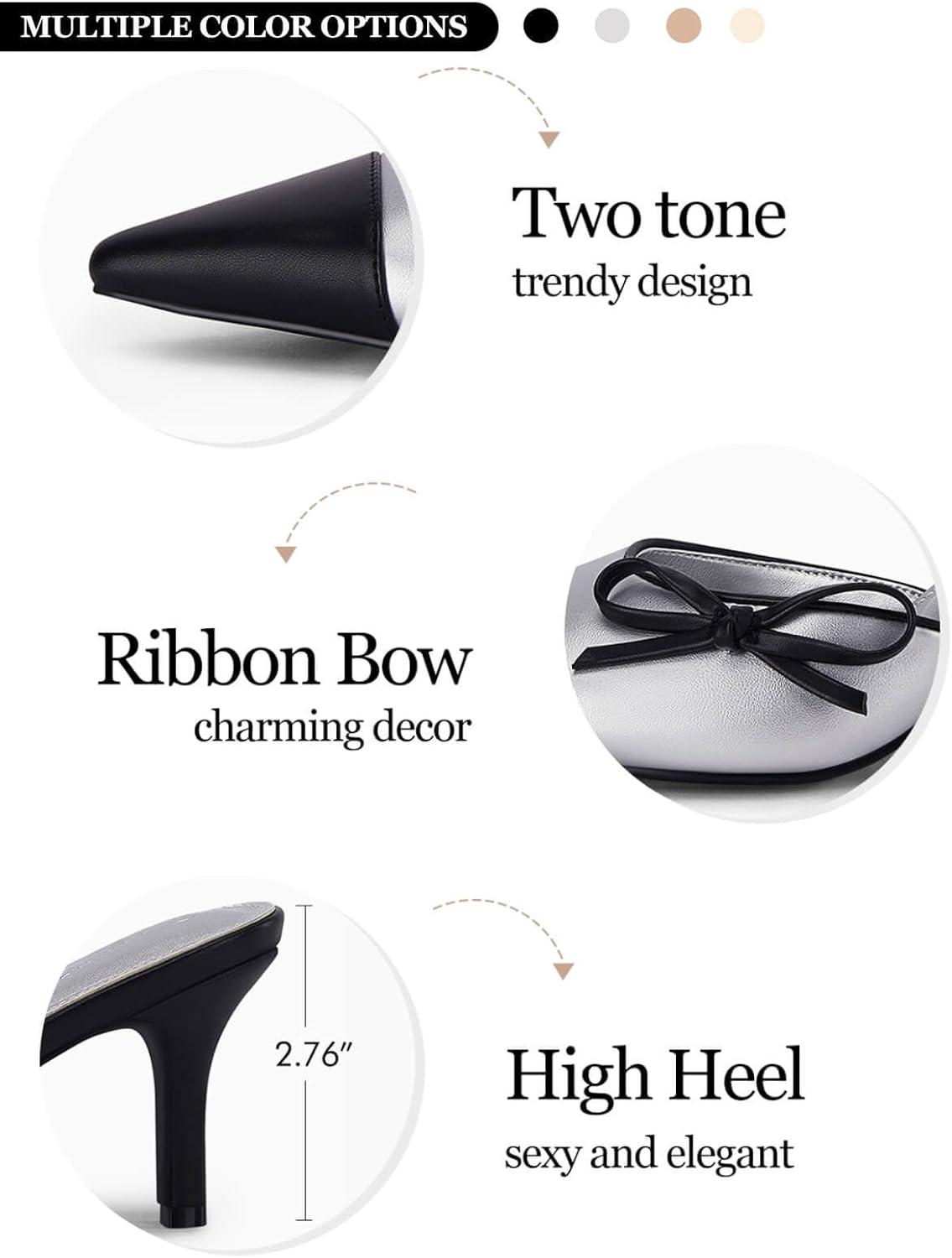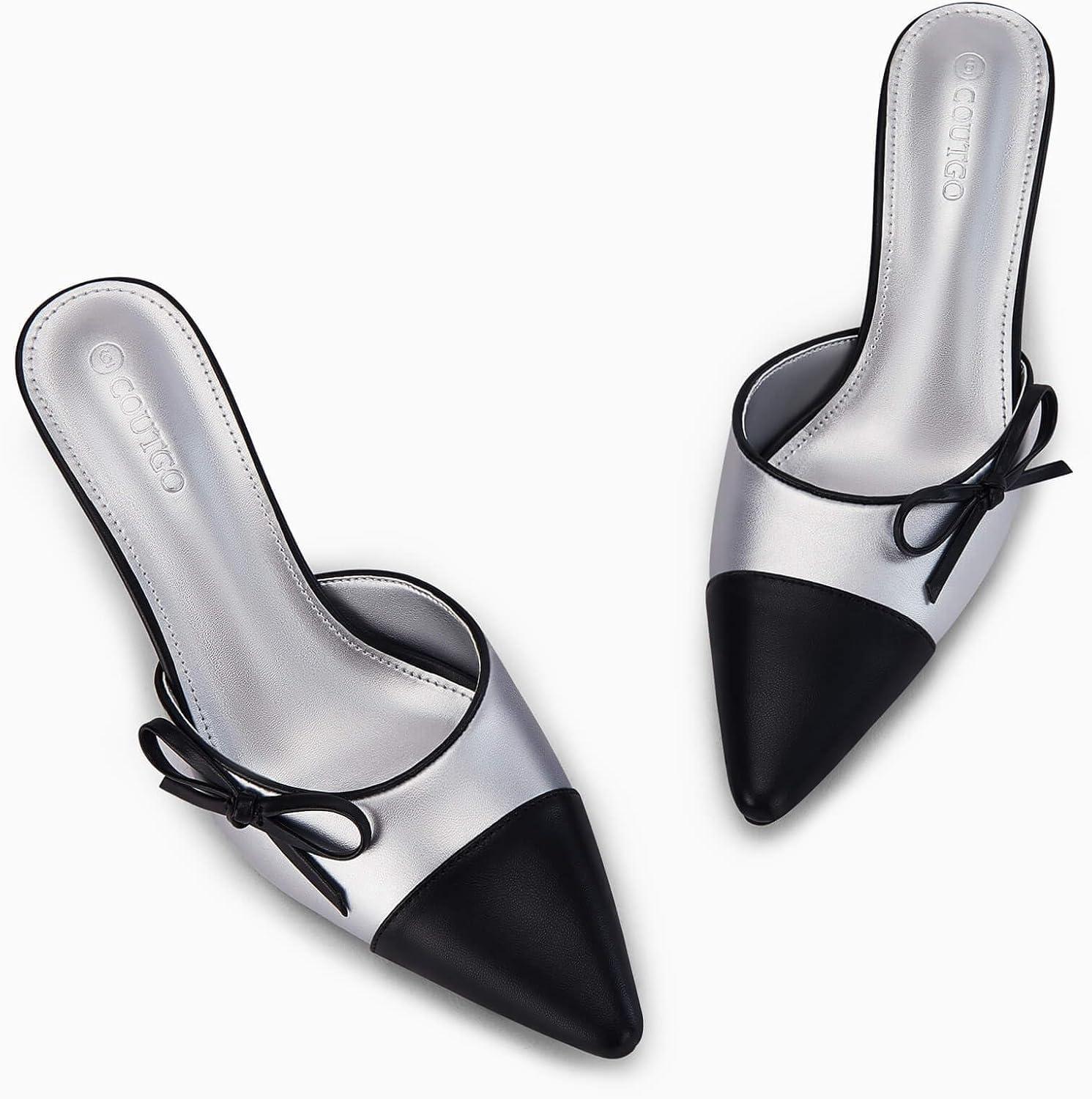 Coutgo Womens Bow Tie Mules Heels Two Tone Closed Pointed Toe Slip On Backless Wedding Dress Shoes Pumps(Silver)