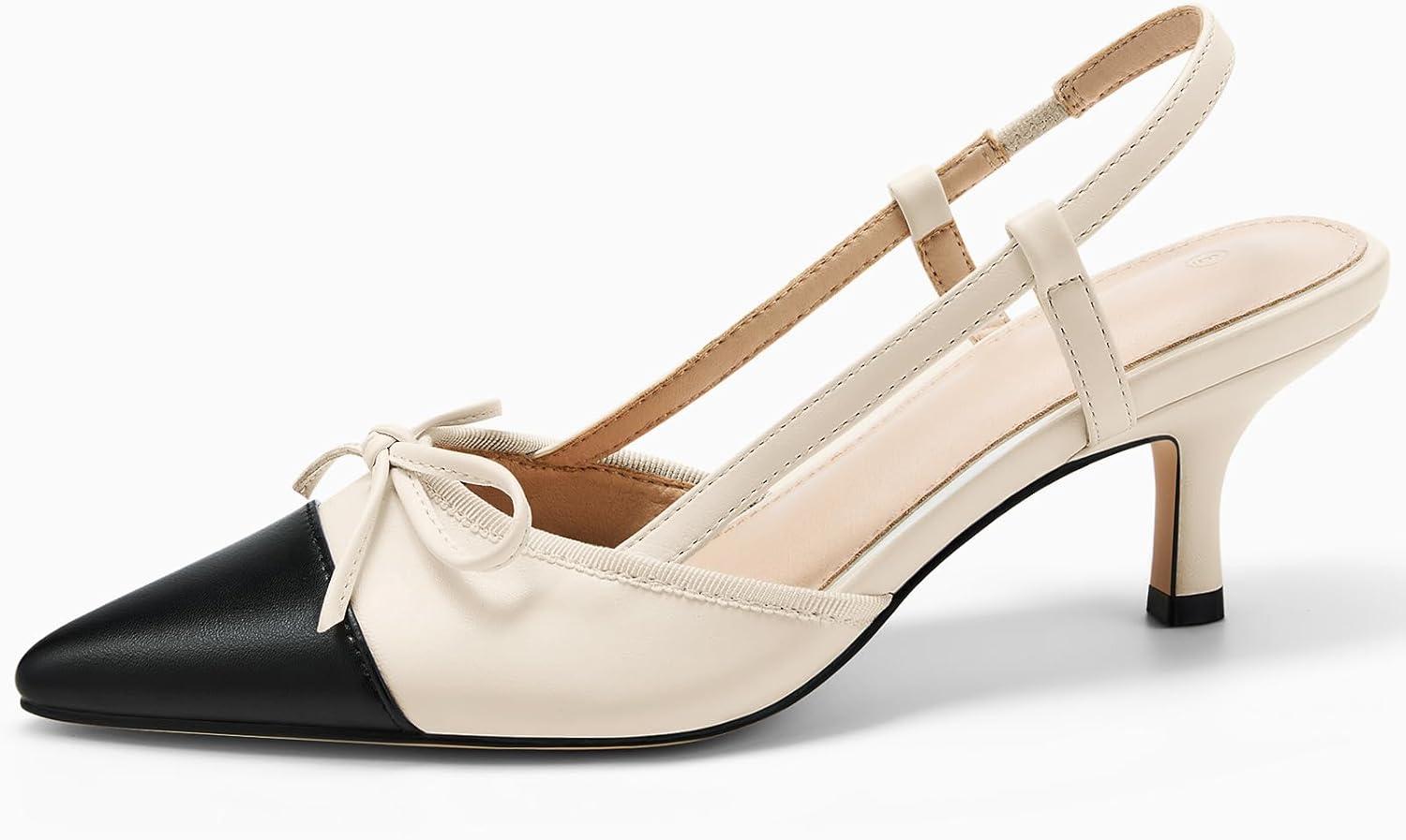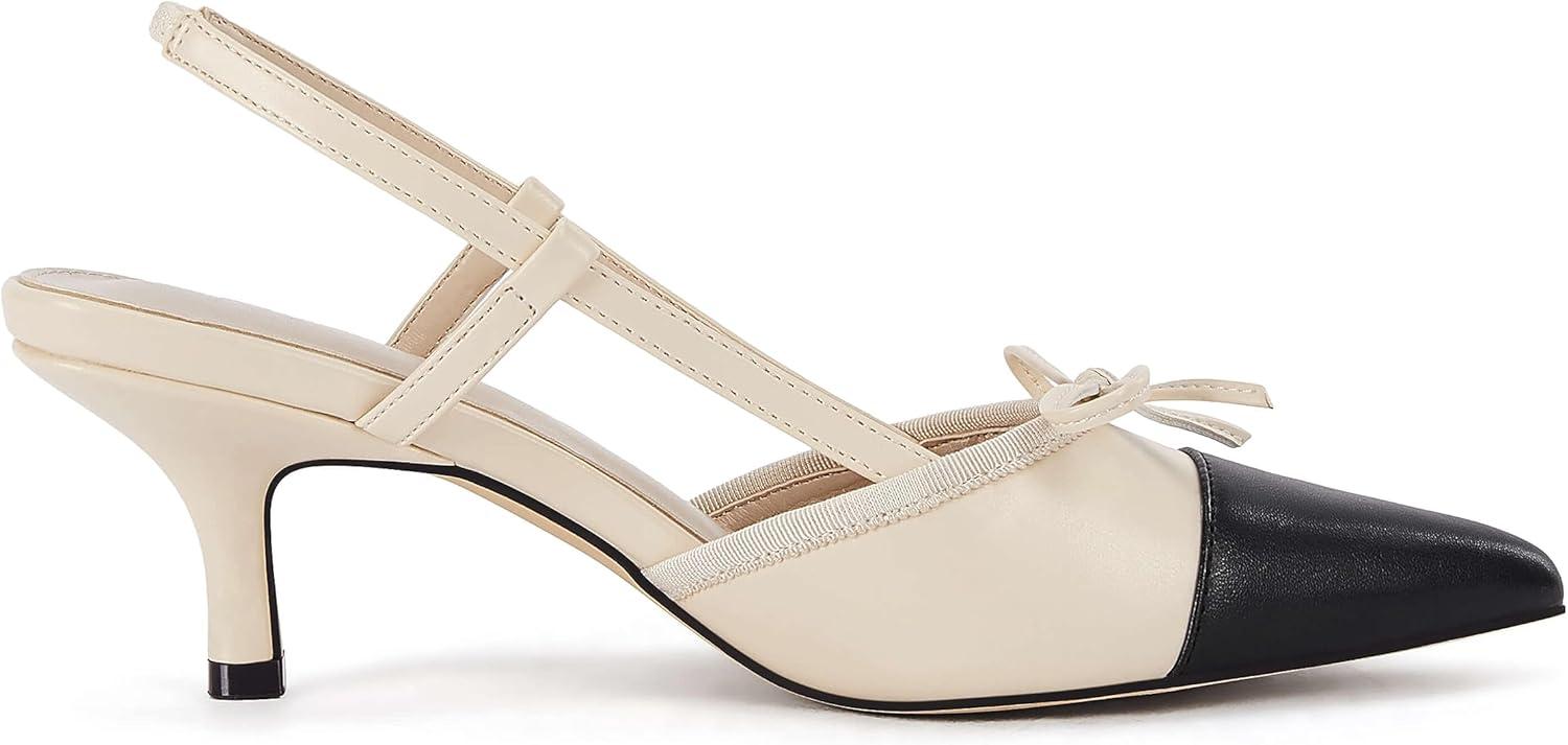 Coutgo Women‘s Bow Tie Slingback Pumps Pointed Toe Kitten Low Heel Patchwork Dress Heeled Sandals(Beige)