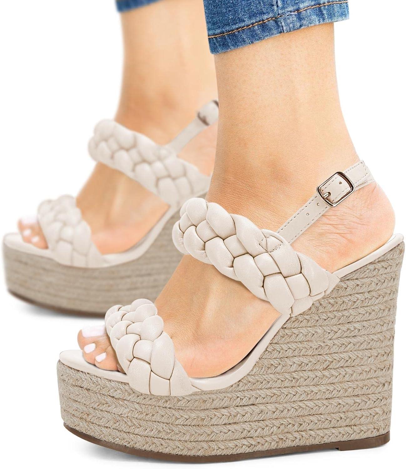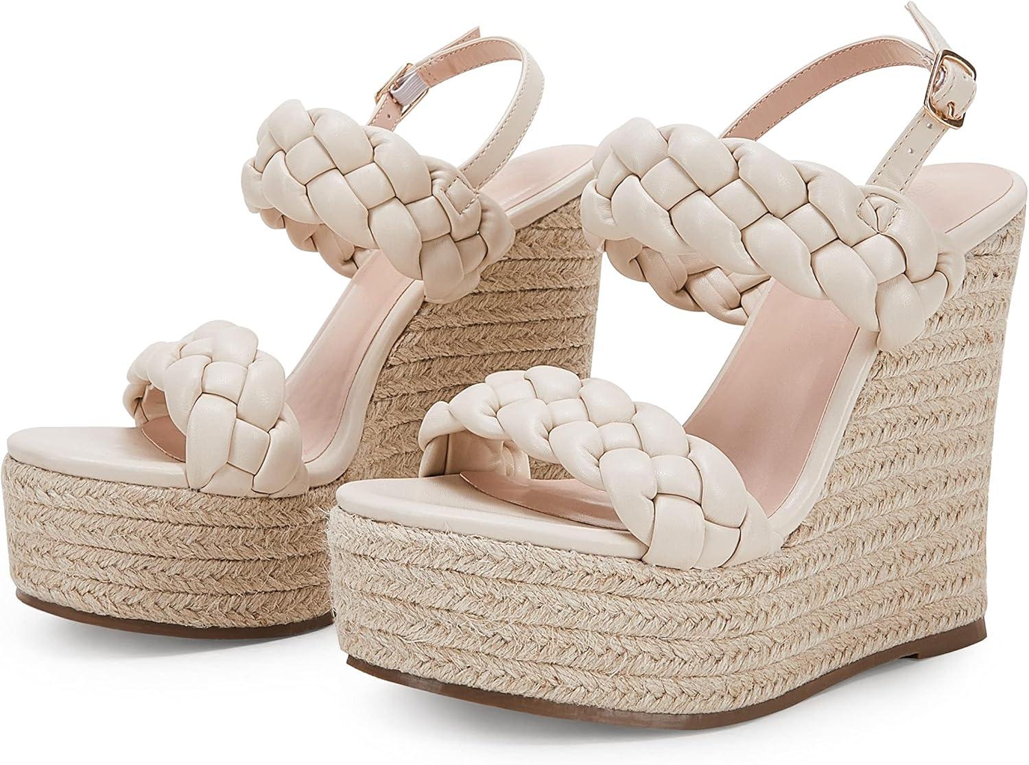 Coutgo Women’s Braided Espadrille Platform Wedge Sandals Open Toe Two Strap Ankle Buckle Summer Shoes(Beige)