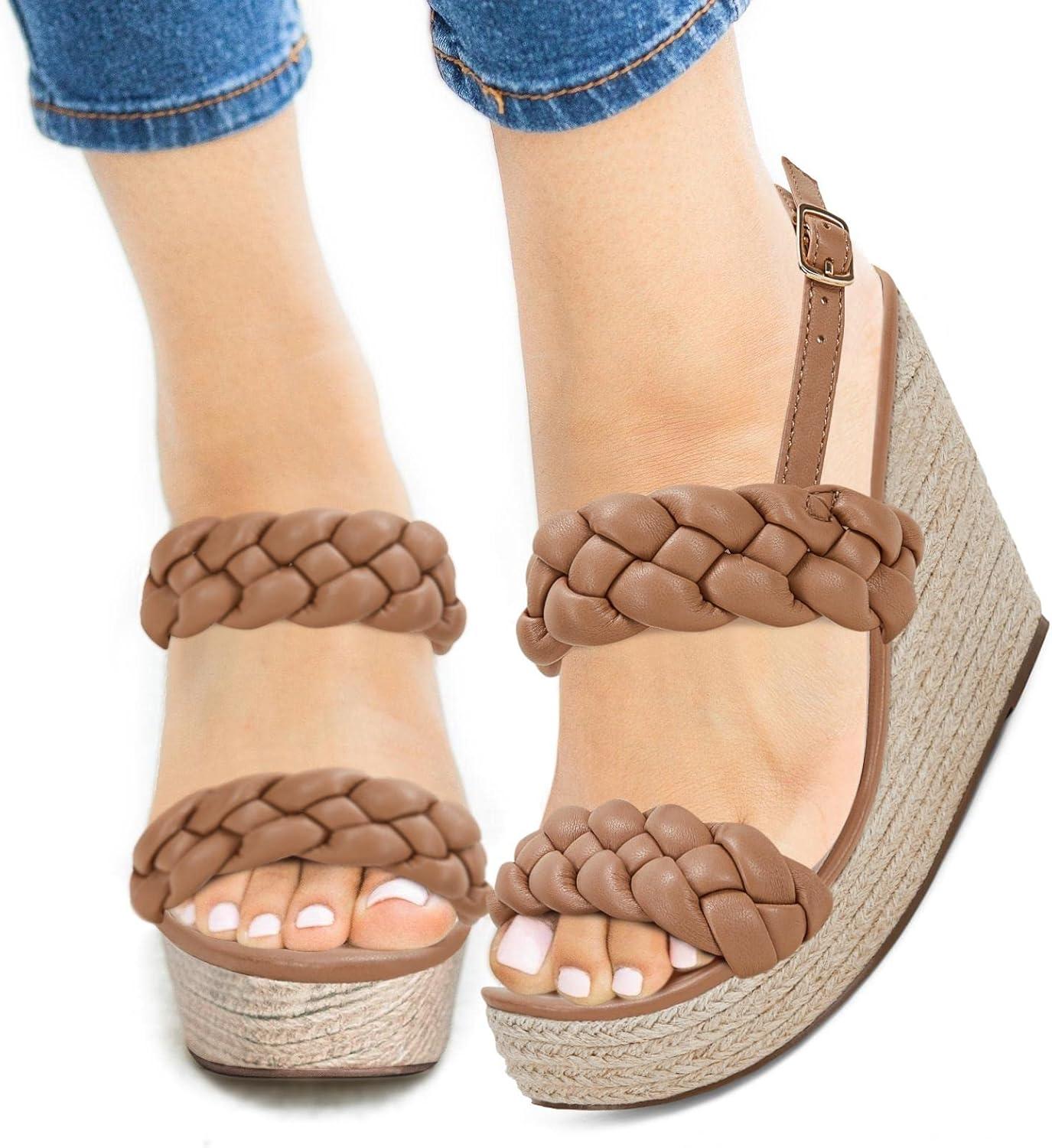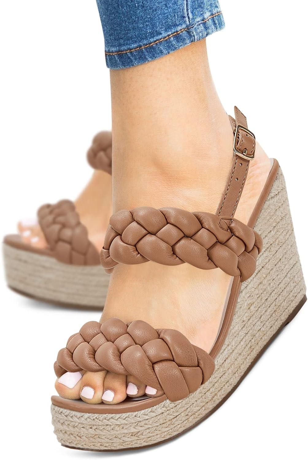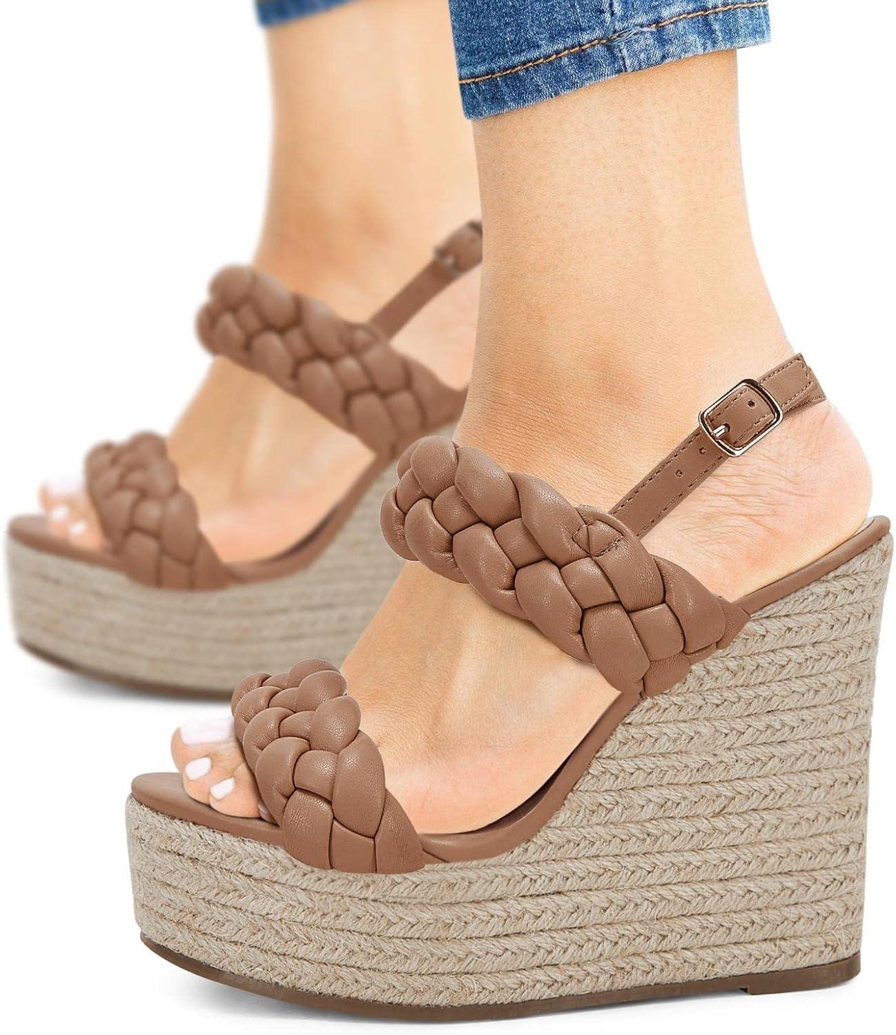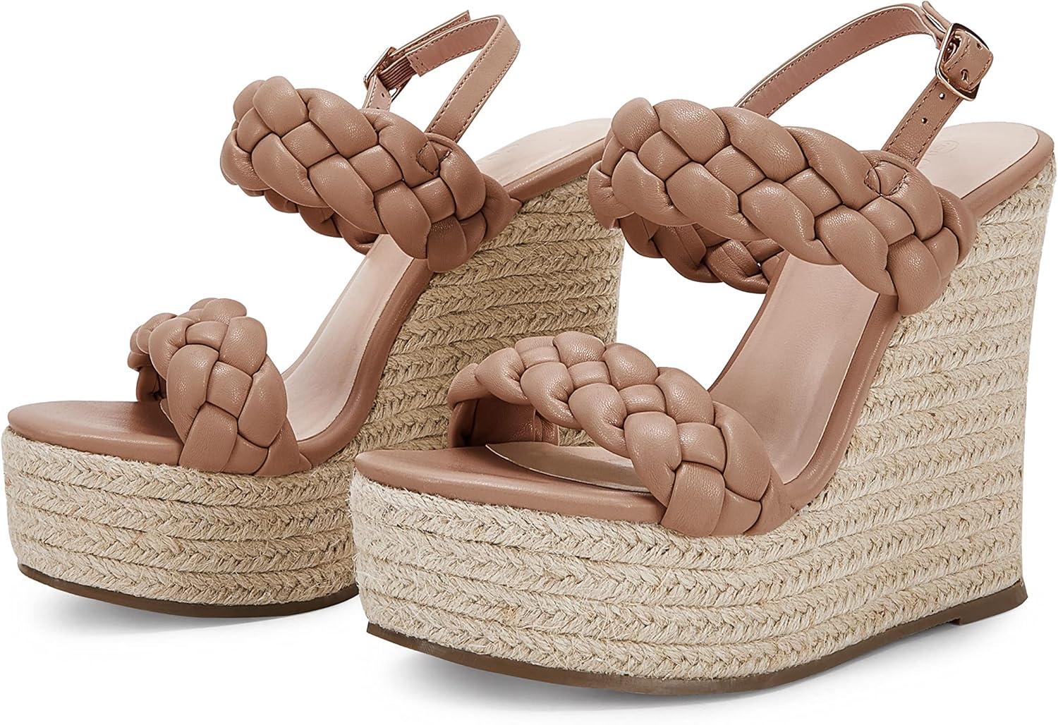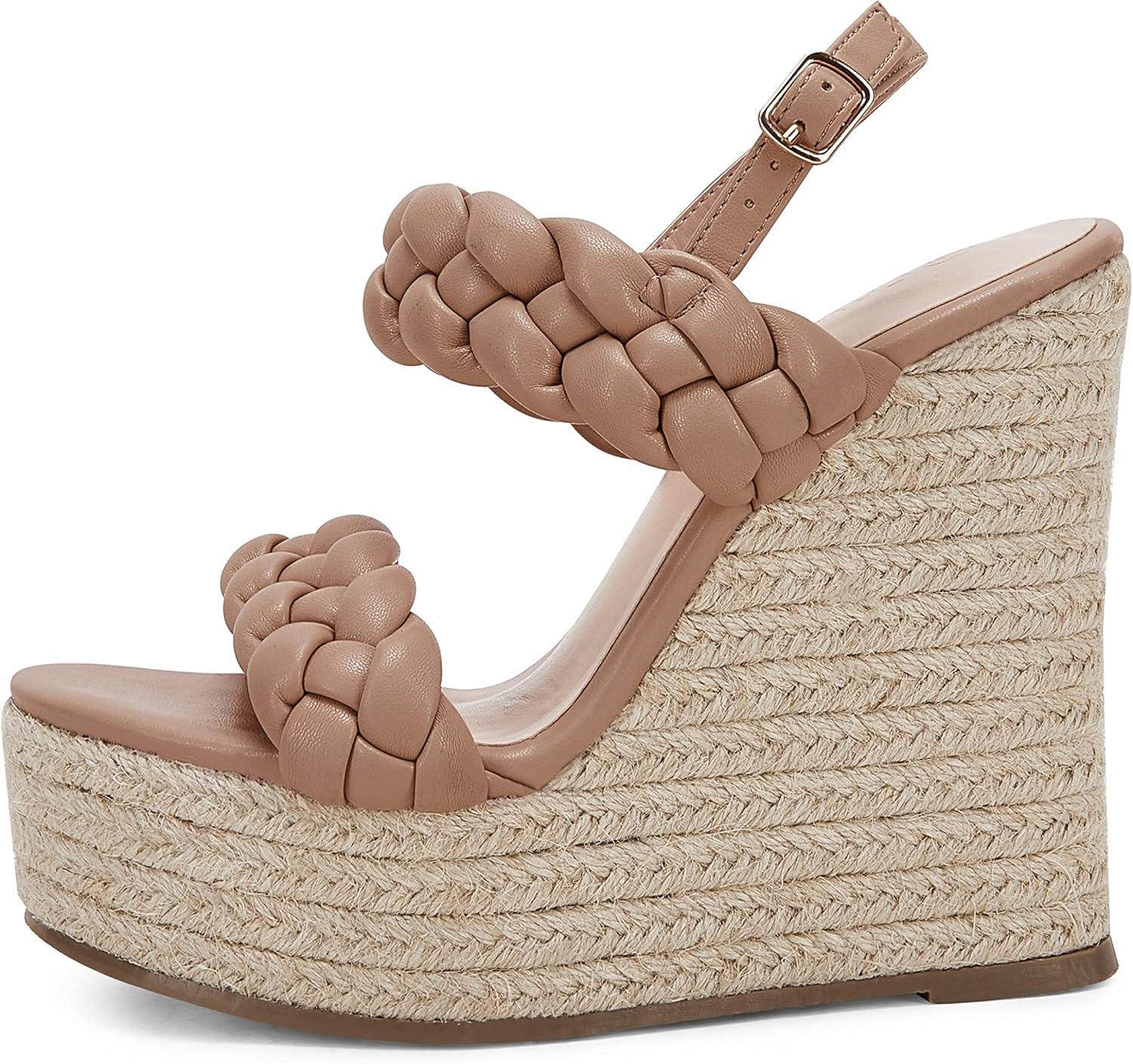 Coutgo Women’s Braided Espadrille Platform Wedge Sandals Open Toe Two Strap Ankle Buckle Summer Shoes(Khaki)