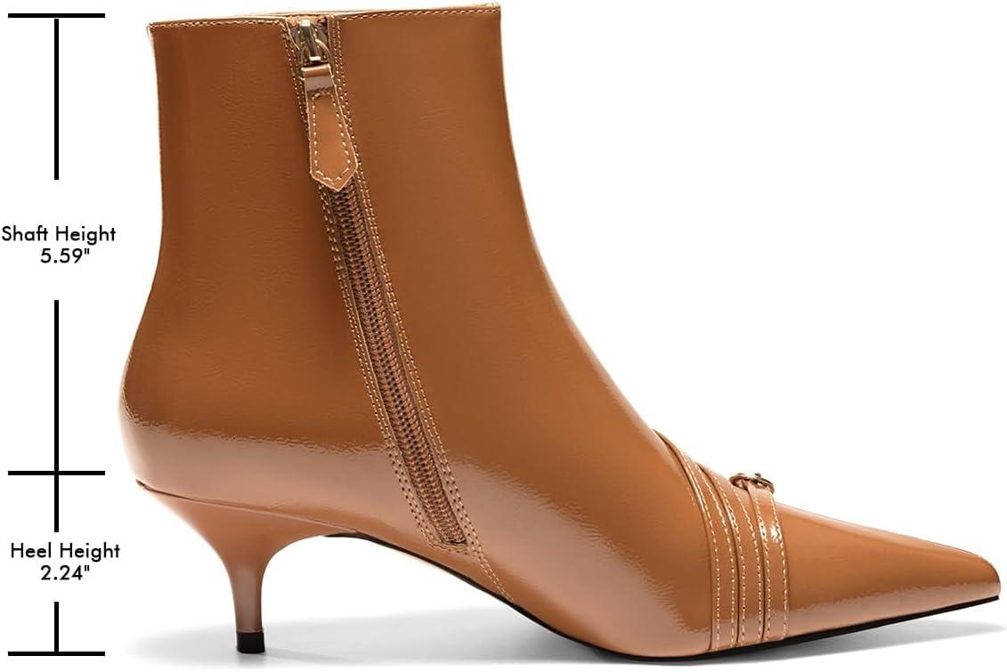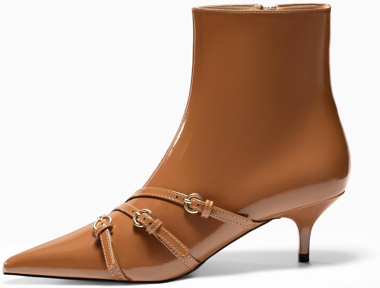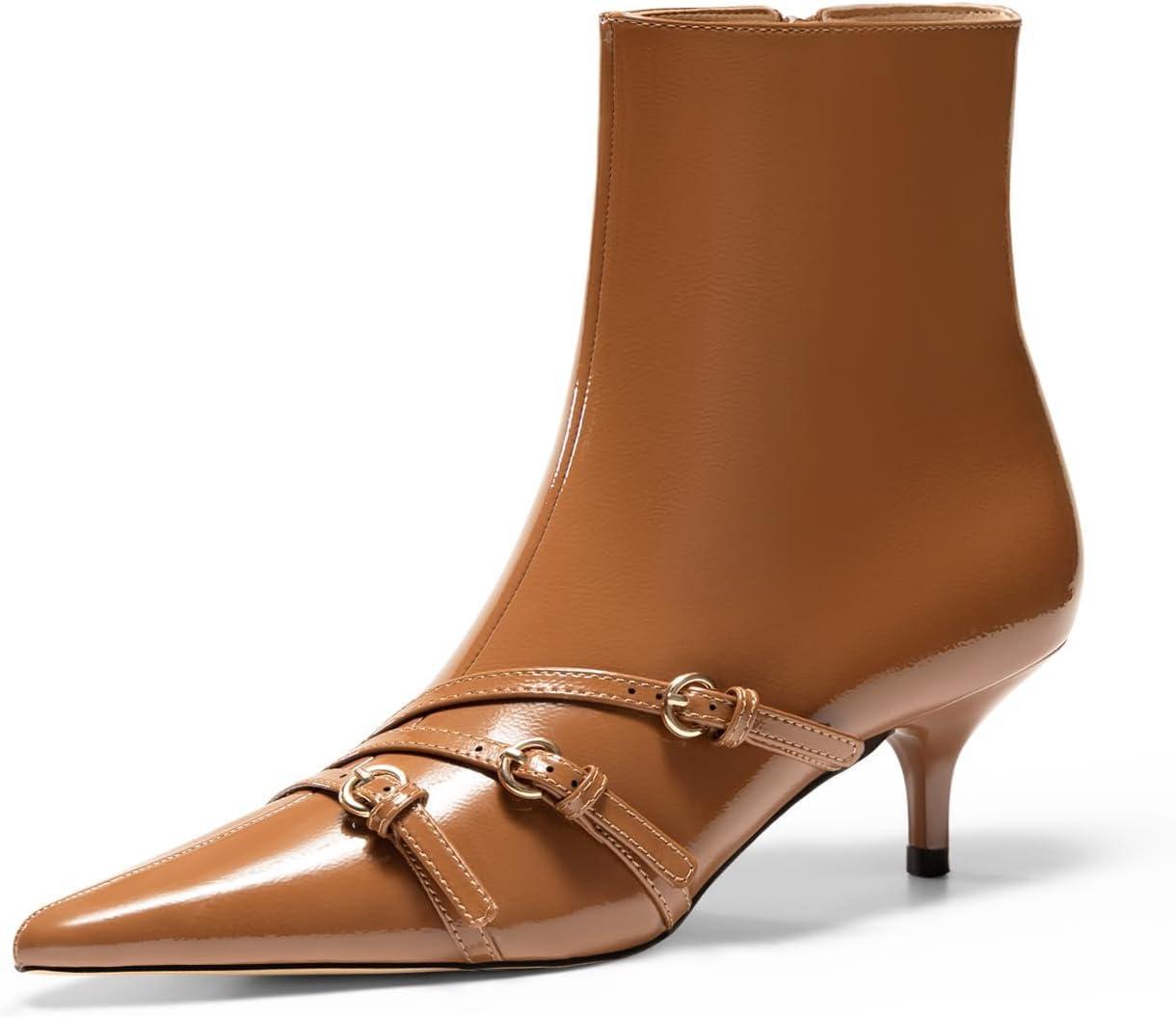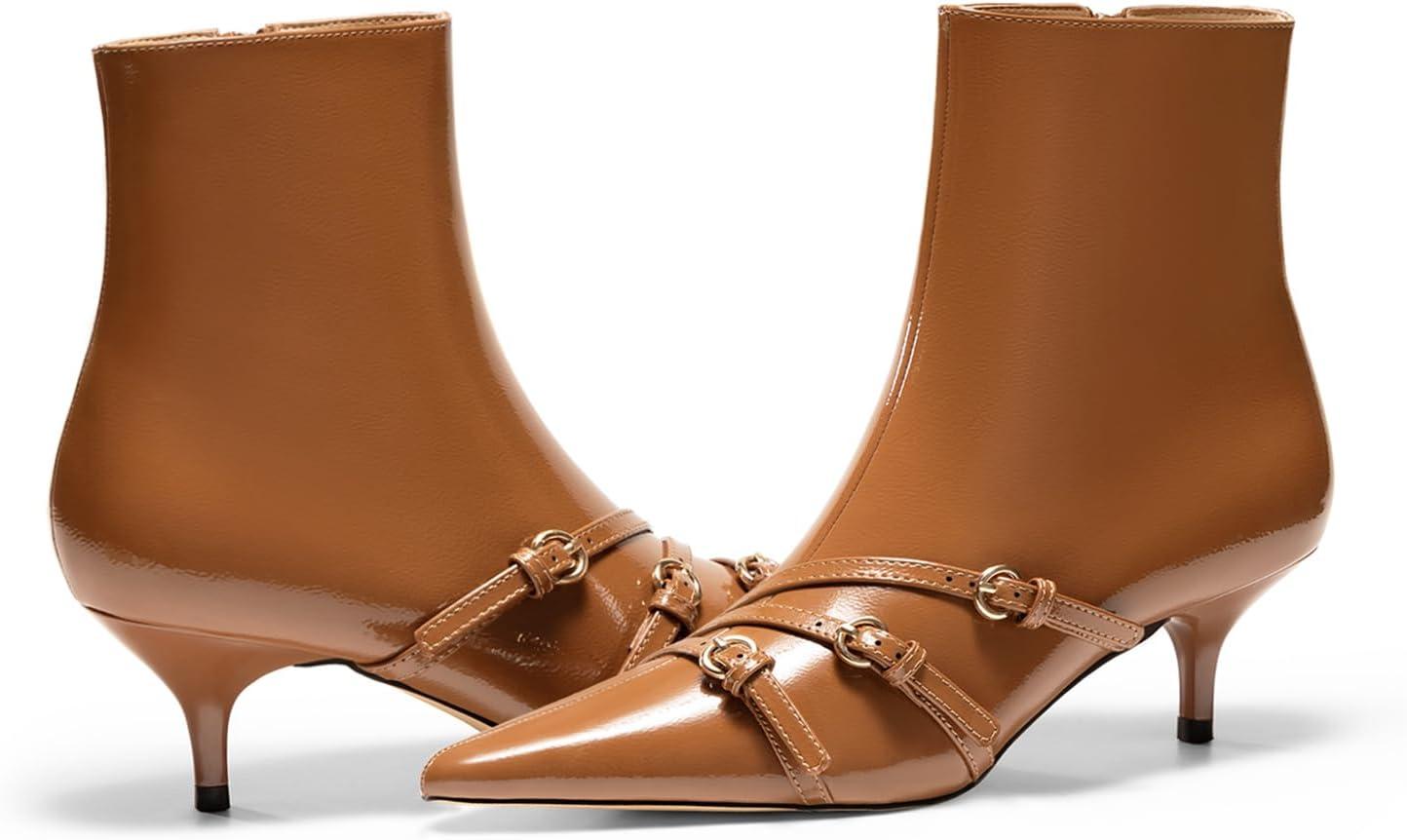 Coutgo Womens Buckle Strap Ankle Booties Kitten Low Heel Pointed Toe Y2K Boots Side Zipper Fall Shoes(Brown)
