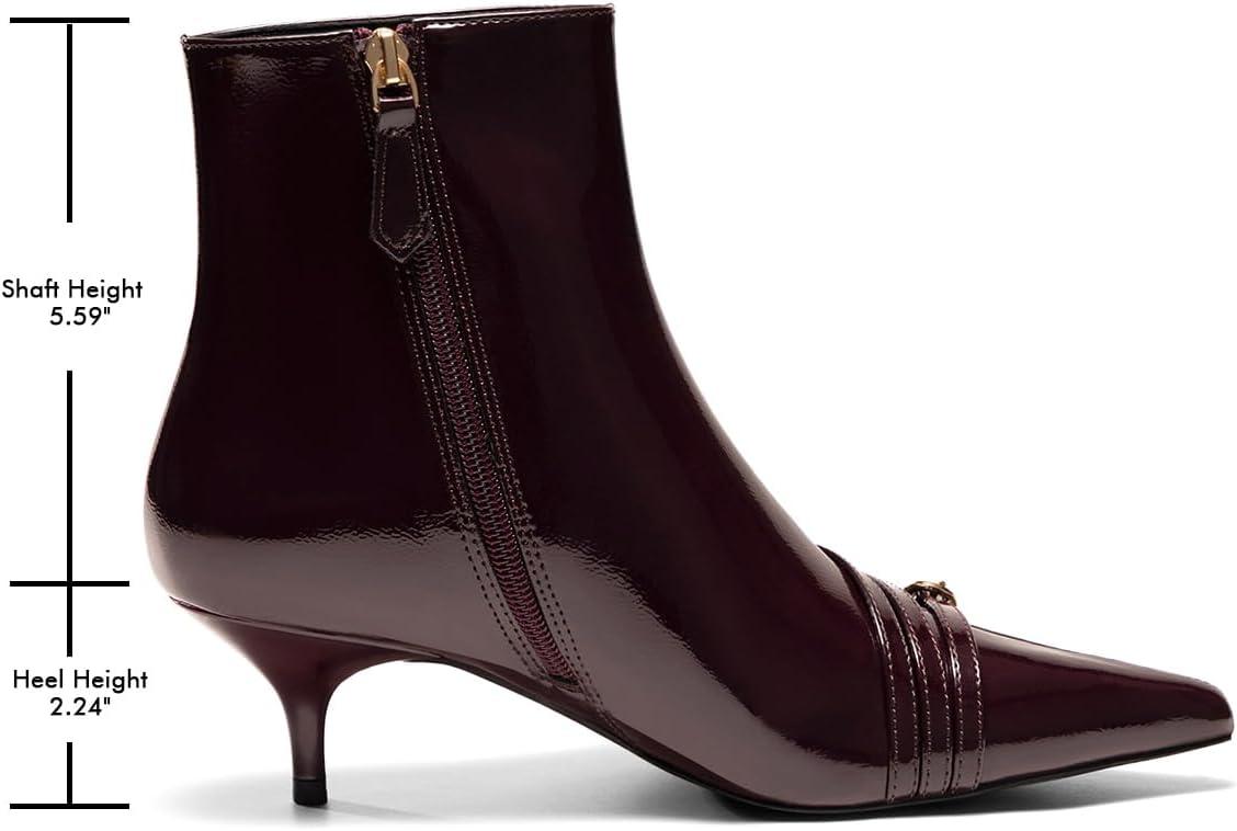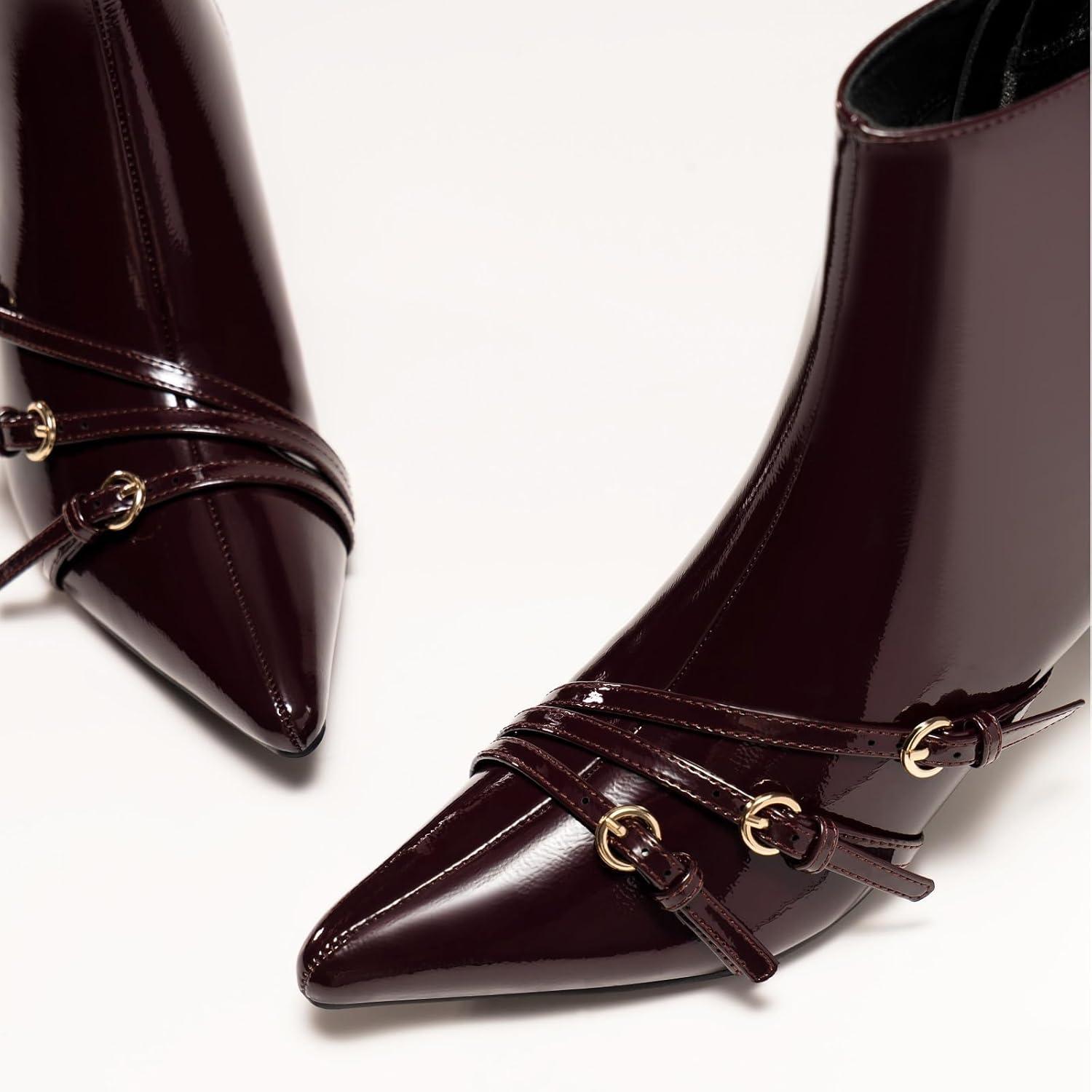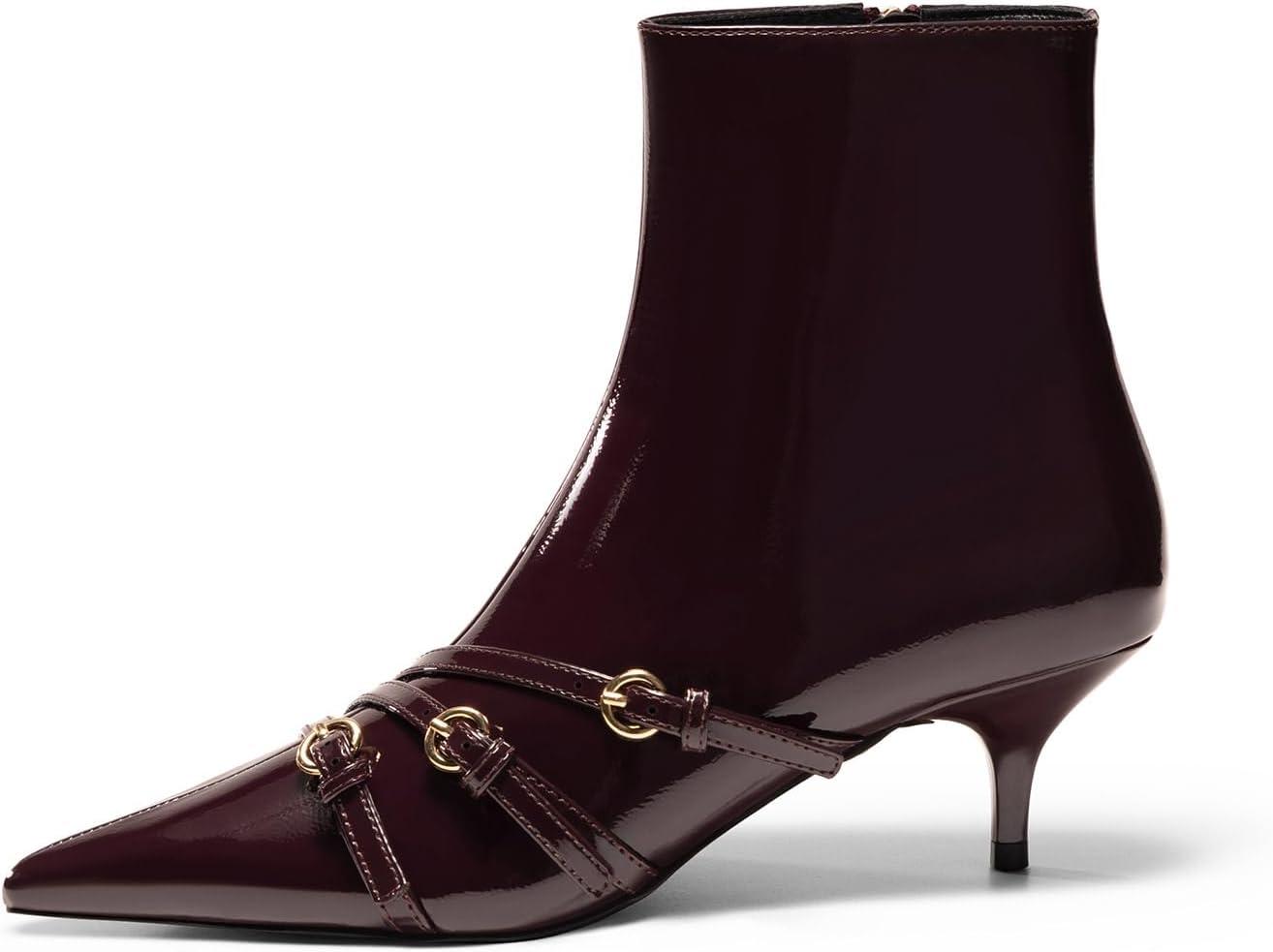 Coutgo Womens Buckle Strap Ankle Booties Kitten Low Heel Pointed Toe Y2K Boots Side Zipper Fall Shoes(Burgundy)
