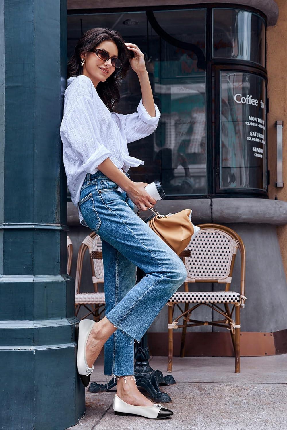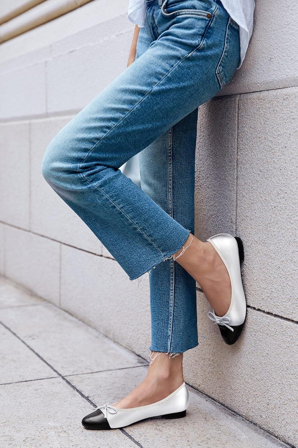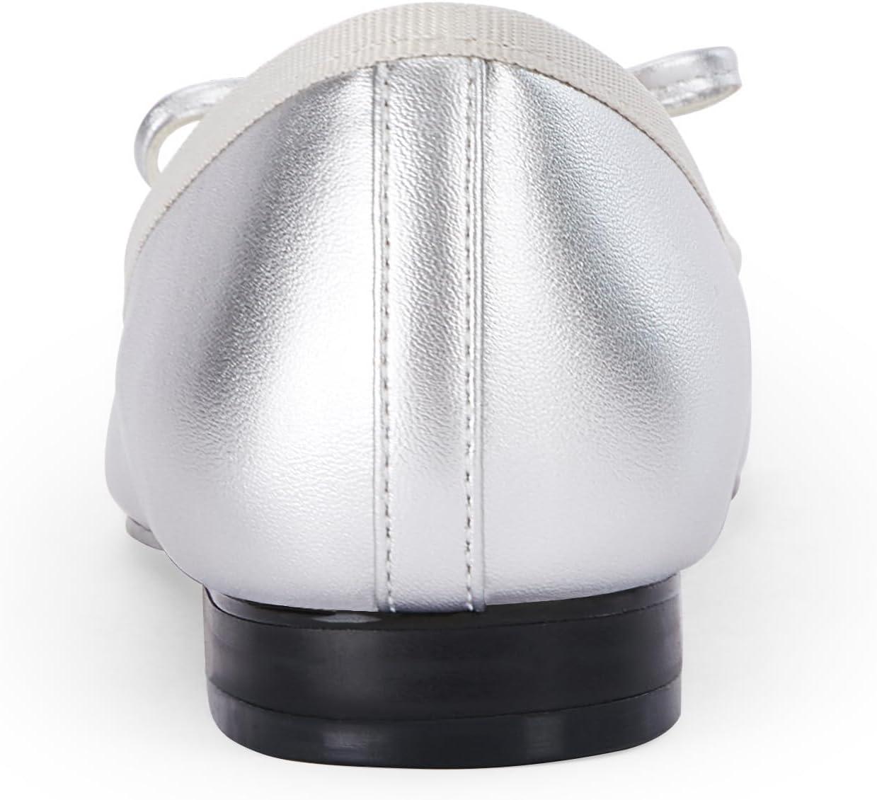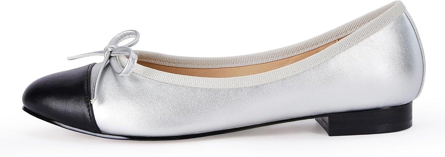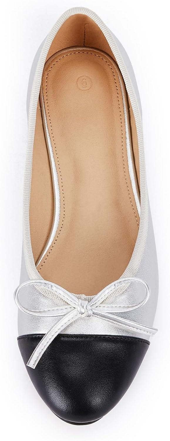 Coutgo Womens Cap Toe Ballet Flats Bow Pointed Toe Slip On Office Work Comfort Dress Party Flat Shoes(Silver)