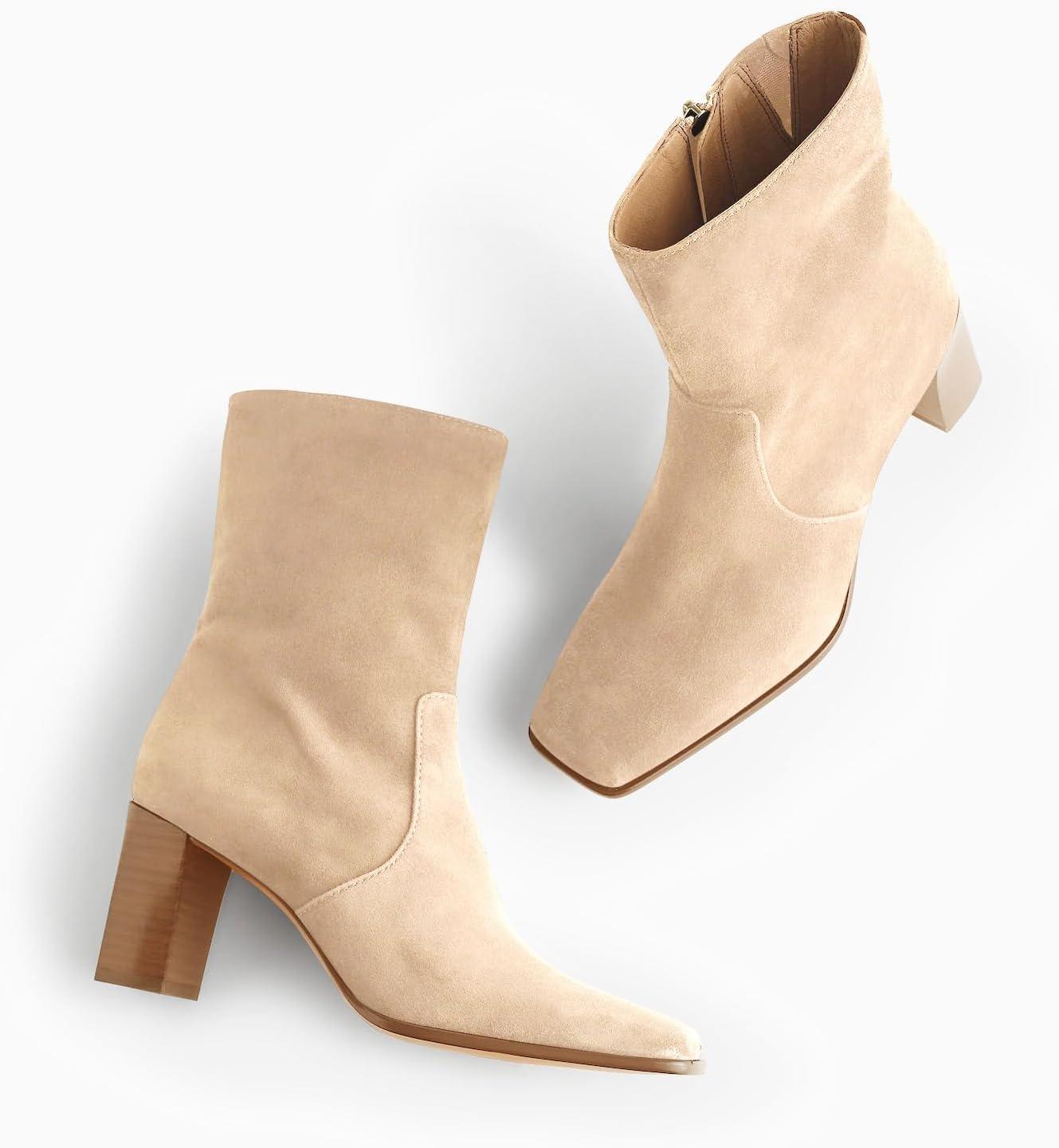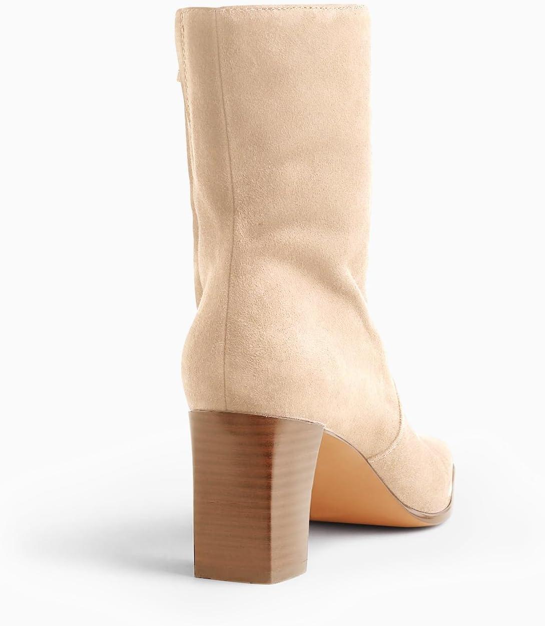 Coutgo Womens Chunky Block Heel Ankle Boots Square Toe Side Zipper Booties Faux Suede Fall Dress Shoes(Nude)